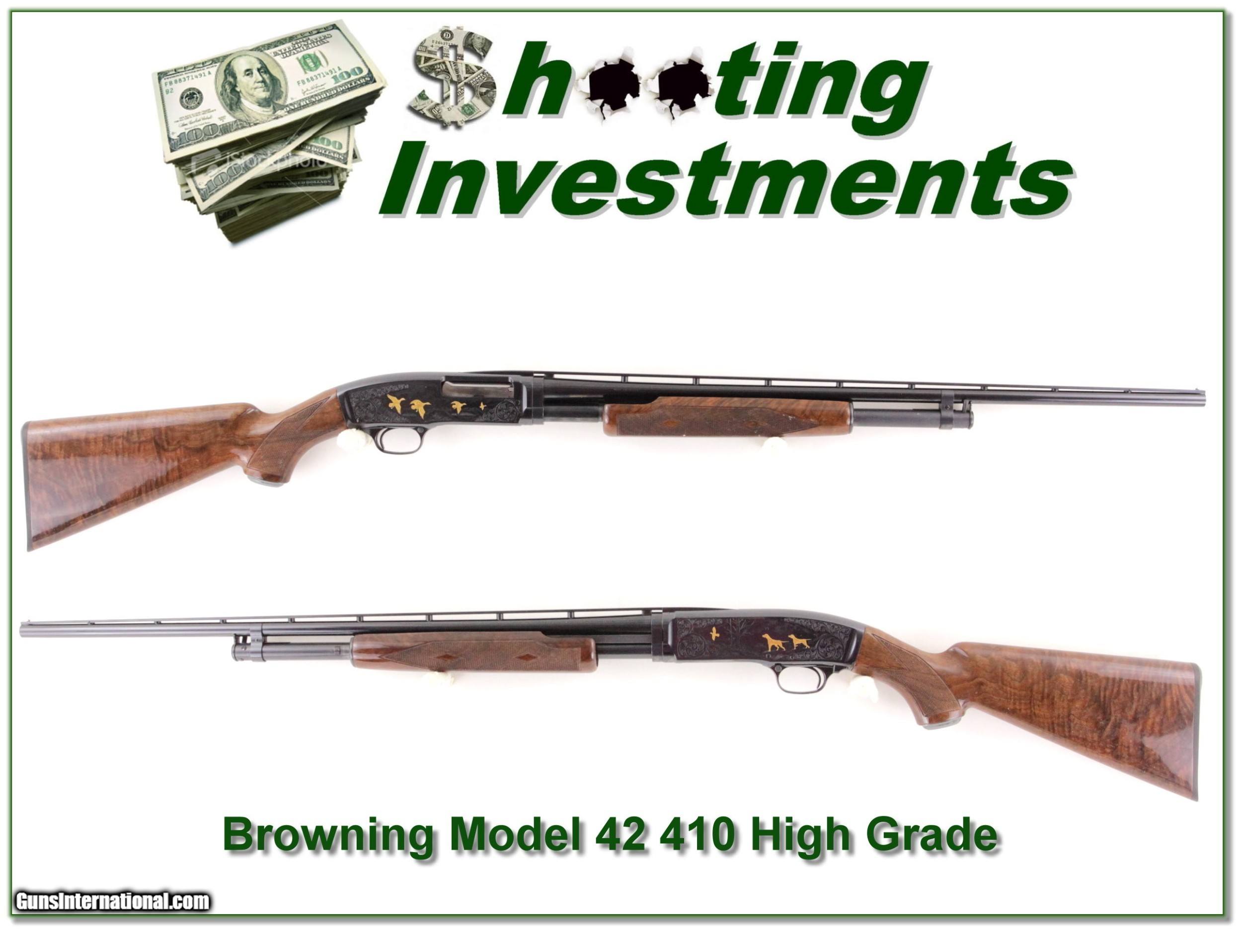 Description: Shooters and collectors, this is a beautiful Browning Model 42 High Grade (Grade 6) 410 Bore. The wood is outstanding, and I see no marks on blue of wood. T was never fired. I am selling this one on consignment and as such lay-a-way can’t be used. It does of course have the standard 3-day inspection. Shipping with insurance is $39. Please email me with any questions or larger pictures. (Consign your quality firearms with Shooting Investments for only 12%! Let me know if you have any you would like to sell!) 19-1232 Payment: Payment is by Money Order, Cashiers Check or Personal Check. I can now also accept Credit Cards (MasterCard, Visa, Discover & American Express) with a 3% convenience fee. PayPal can be used for some items but never for firearms. Shipping: The shipping charge will be listed in each description. It is $39 for most firearms. Some heavy guns or those insured for over $2000 will be higher. Shipments to Alaska and Hawaii are higher because air shipment is required. Most firearms are shipped on Tuesday and Thursday and usually in 5 days of receipt of payment. We package all shipments carefully and insure them. Optics are shipped Priority Mail and most other non-firearm shipments are shipped First Class. Returns: Our return policy is simple. If for any reason you are not pleased with your purchase, you may return your item for a full refund of purchase price. Ammunition cannot be returned. It is important to us that you are happy. Guns cannot be fired or dissembled before returning them and they must be returned in the same condition as received. Notification of a return must occur with-in 3 days of receipt at your dealer. Shipping, convenience and dealer fees are not refundable and are the responsibility of the buyer. Lay-a-way: If needed, we offer a 60 day lay-a-way option on most firearms. It is 1/3 now, 1/3 in 30 days and 1/3 in 60 days. Lay-a-way firearm sales are final and if not completed the first payment cannot be returned. Consigning your firearms with Shooting Investments: We will help you get top dollar for your firearms. While most local guns shops charge 20% or more, our fee is only 12% with a minimum of $75. At your local gun shop it might take months to sell. Selling on-line provides instant access to thousands of interested buyers. You won’t find any other on-line dealer willing to sell your firearms for only 12% or listing every gun on 3 separate s. Selling through an House typically costs the seller 15% and the buyer an addition 15% (so 30%) and you have to wait several months to sell and longer to receive funds. If properly priced, we will sell your firearms in a few weeks. Send us an email or give us a call and we’ll explain how easy it is for you to get top dollar. Trading: Trading for use is really just buying your gun to re-sell. If you have a gun you want to trade, please email a picture and we will let you know what we can give or it. You will always get more if we sell it for you on consignment. Help for California Buyers: We are happy to ship to California. It is the buyer’s responsibility to make sure any item you buy is legal in your state. We are also happy to help with your purchase of a firearm from someone other than us. If you see a gun you would like to buy but the seller can’t or won’t ship to California they can ship to use and we’ll then ship it to your California dealer. The cost for this service is only $30 + shipping. Let us know if we can help! SOLD |