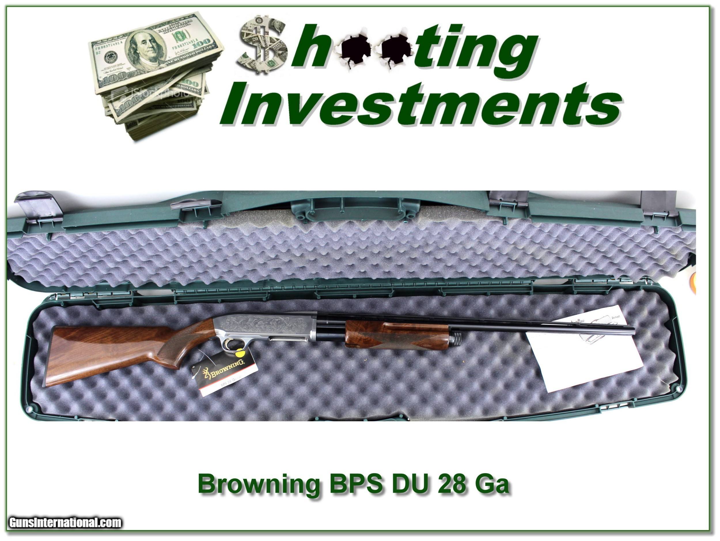 Description: Collectors, this is a rare chance to add a Browning BPS Ducks Unlimited 28 Ga to your collection. It has a silver engraved receiver and beautiful wood. It is unfired and comes in DU case as seen. Shipping and insurance is $59. Please email me with any questions or larger pictures. (Consign your quality firearms with Shooting Investments for only 12%! Let me know if you have any you would like to sell!) 22-0098 Payment: Payment is by Money Order, Cashiers Check or Personal Check. I can now also accept Credit Cards (MasterCard, Visa, Discover & American Express) with a 3% convenience fee. Shipping: The shipping charge will be listed in each description. It is $49 for most long guns. Some heavy guns, over 48in boxes or those insured for over $2000 will be higher. Shipments to Alaska and Hawaii are higher because air shipment is required. Most firearms are shipped on Tuesday and Thursday and usually in 5 days of receipt of payment. We package all shipments carefully and insure them. Optics are shipped Priority Mail and most other non-firearm shipments are shipped First Class. Returns: Our return policy is simple. If for any reason you are not pleased with your purchase, you may return your item for a full refund of purchase price. Ammunition cannot be returned. It is important to us that you are happy. Guns cannot be fired or dissembled before returning them and they must be returned in the same condition as received. Notification of a return must occur with-in 3 days of receipt at your dealer. Shipping, convenience and dealer fees are not refundable and are the responsibility of the buyer. Lay-a-way: If needed, we offer a 60 day lay-a-way option on most firearms. It is 1/3 now, 1/3 in 30 days and 1/3 in 60 days. Lay-a-way firearm sales are final and if not completed the first payment cannot be returned. Consigning your firearms with Shooting Investments: We will help you get top dollar for your firearms. While most local guns shops charge 20% or more, our fee is only 12% with a minimum of $75. At your local gun shop it might take months to sell. Selling on-line provides instant access to thousands of interested buyers. You won’t find any other on-line dealer willing to sell your firearms for only 12% or listing every gun on 3 separate s. Selling through an House typically costs the seller 15% and the buyer an addition 15% (so 30%) and you have to wait several months to sell and longer to receive funds. If properly priced, we will sell your firearms in a few weeks. Send us an email or give us a call and we’ll explain how easy it is for you to get top dollar. Trading: Trading for use is really just buying your gun to re-sell. If you have a gun you want to trade, please email a picture and we will let you know what we can give or it. You will always get more if we sell it for you on consignment. Help for California Buyers: We are happy to ship to California. It is the buyer’s responsibility to make sure any item you buy is legal in your state. We are also happy to help with your purchase of a firearm from someone other than us. If you see a gun you would like to buy but the seller can’t or won’t ship to California they can ship to use and we’ll then ship it to your California dealer. The cost for this service is only $30 + shipping. Let us know if we can help! SOLD |