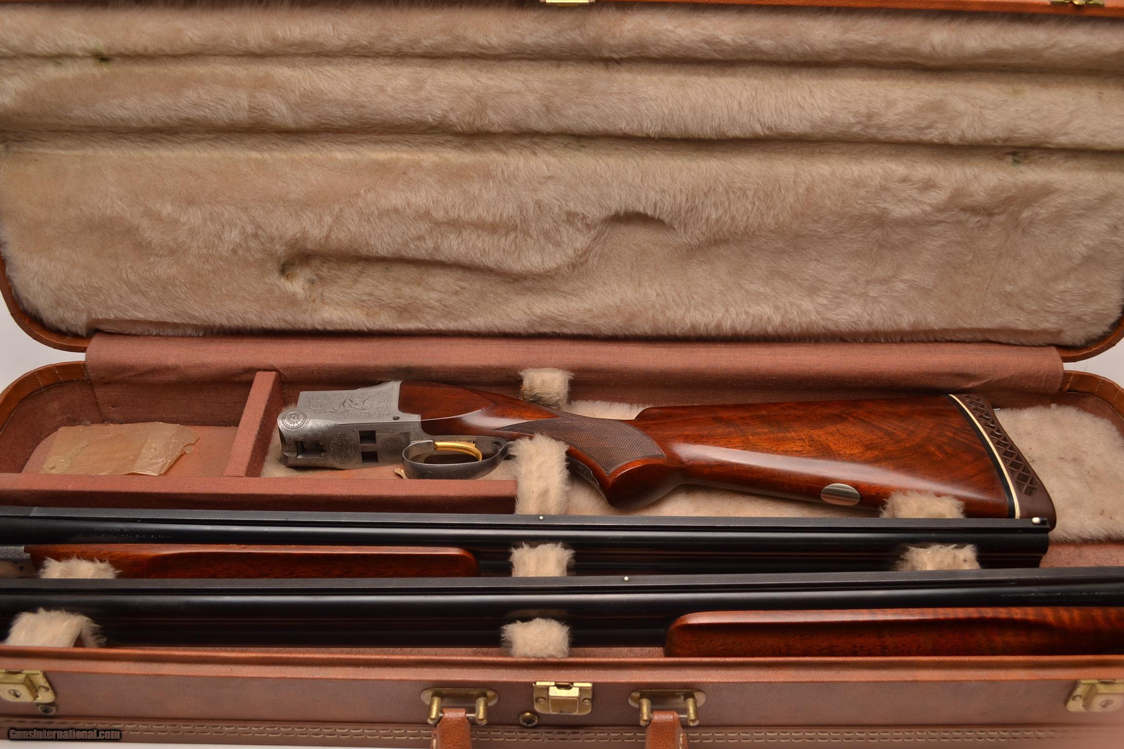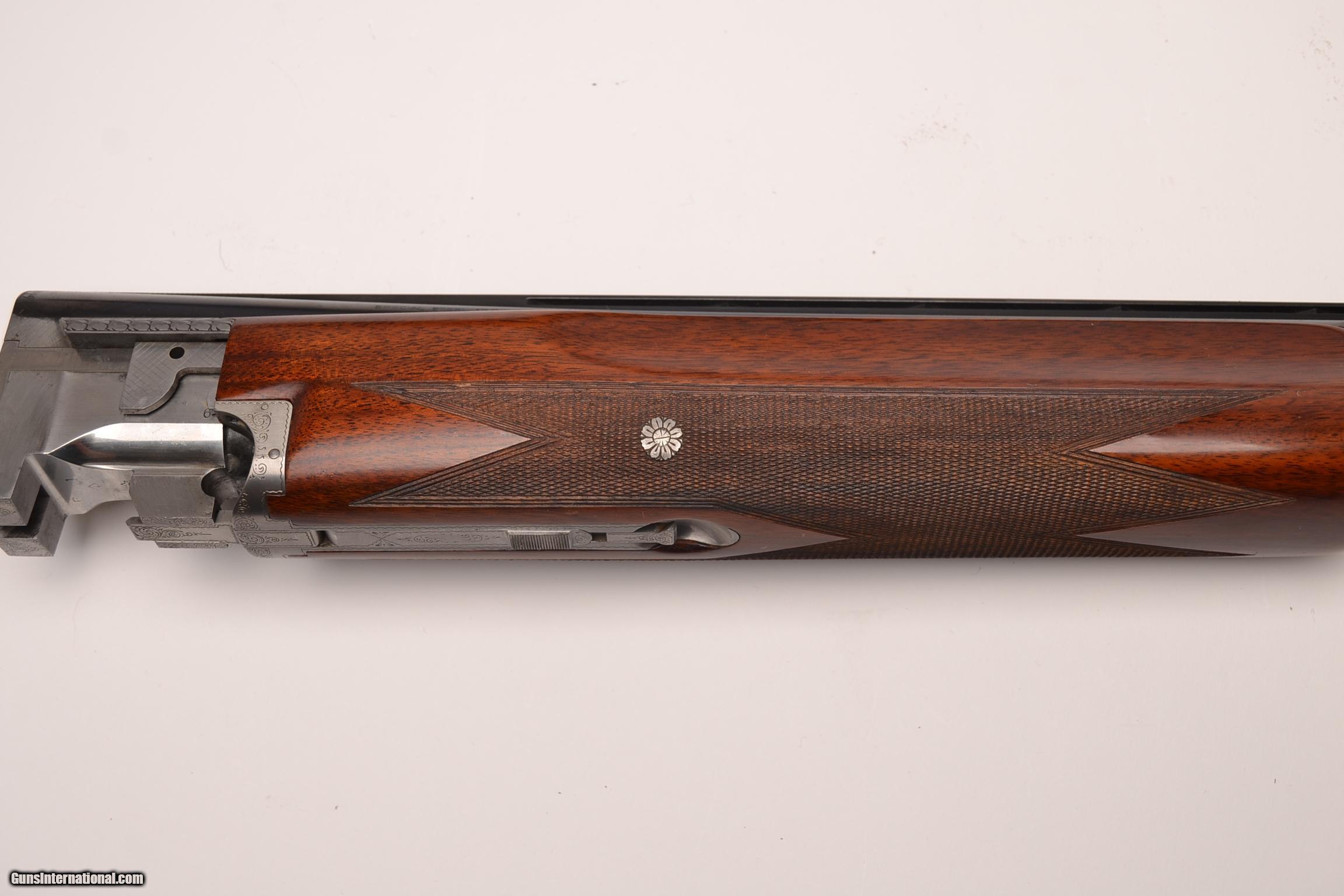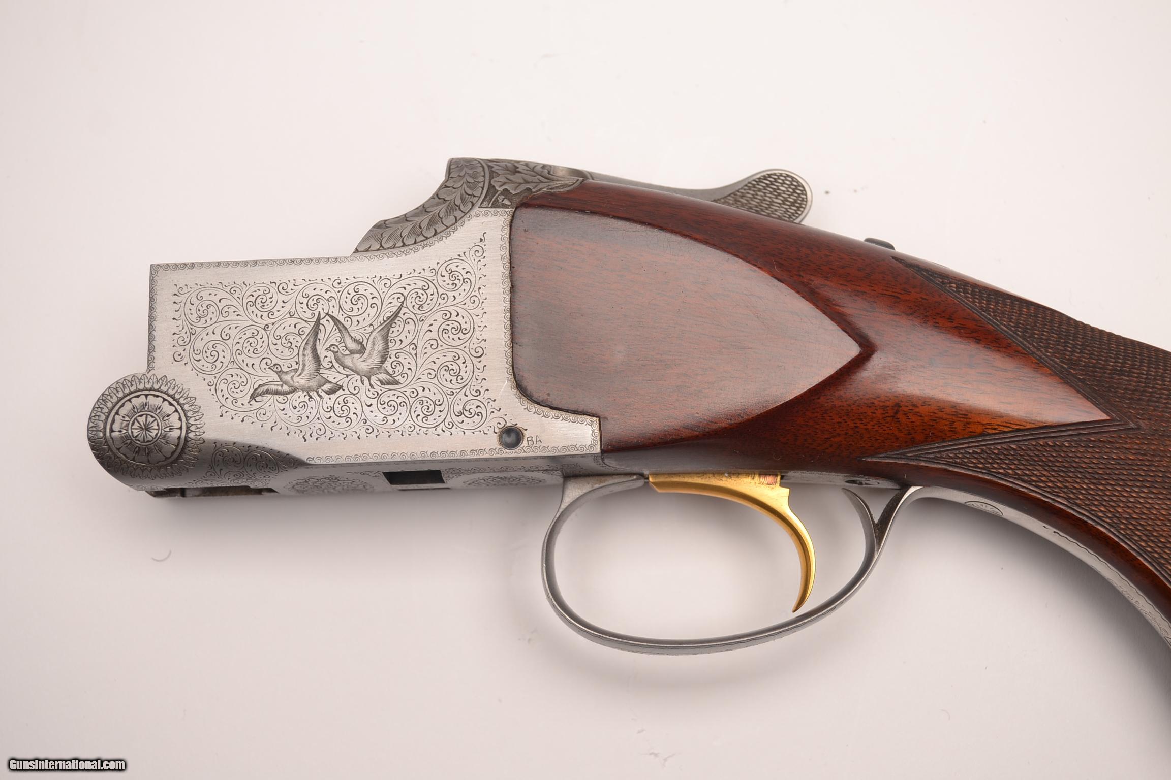Description: Browning - Pigeon Grade, 12ga., Two barrel set, 26 ¼” barrels, M/IM choked, 30” barrels, IM/F choked, no salt gun, European walnut stock long tang square knob, Belgian manufacture, Browning butt plate, target style forends, gloss finish, gold single selective trigger, ventilated ribs, automatic ejectors, new and near perfect gun. In case. Inv# 19873 7 lbs. 5.3 oz. 14 1/8” x 1 3/8” x 1 3/8” $4,995.00 SOLD |