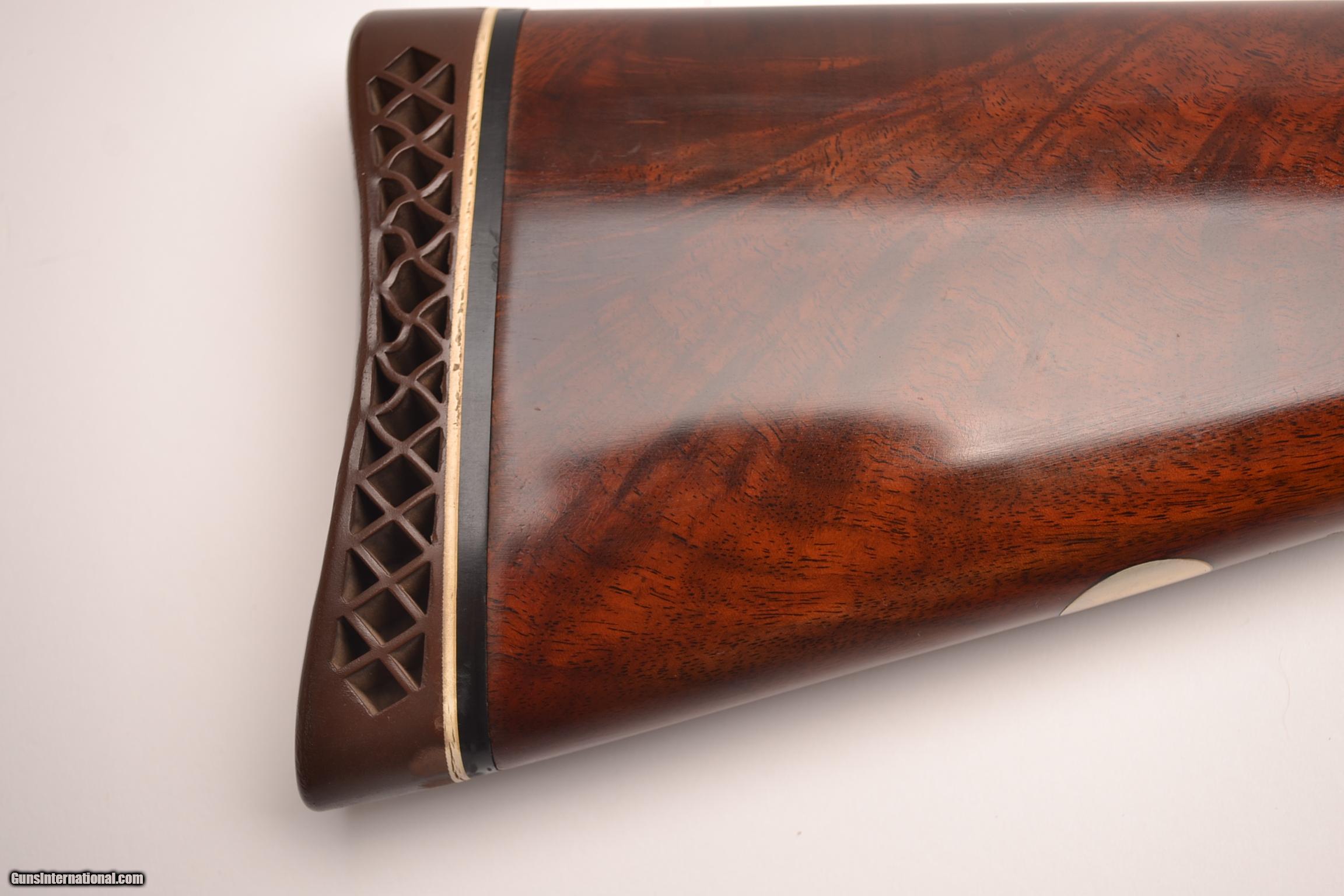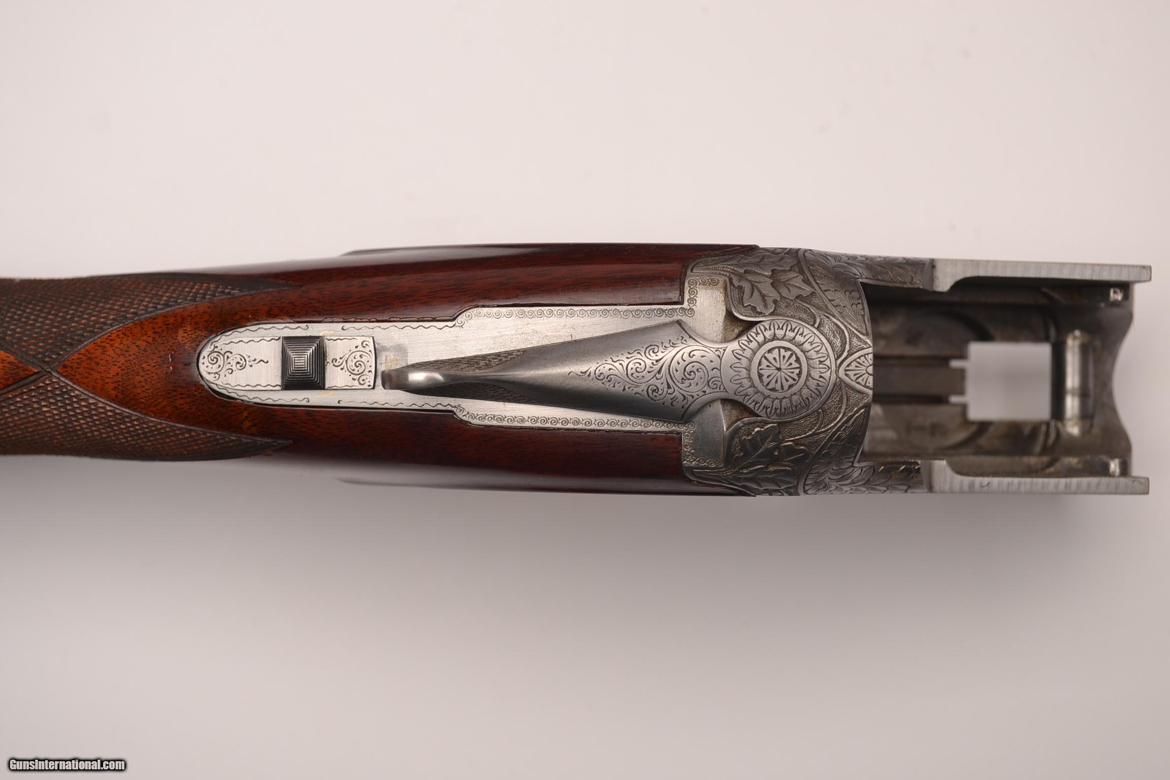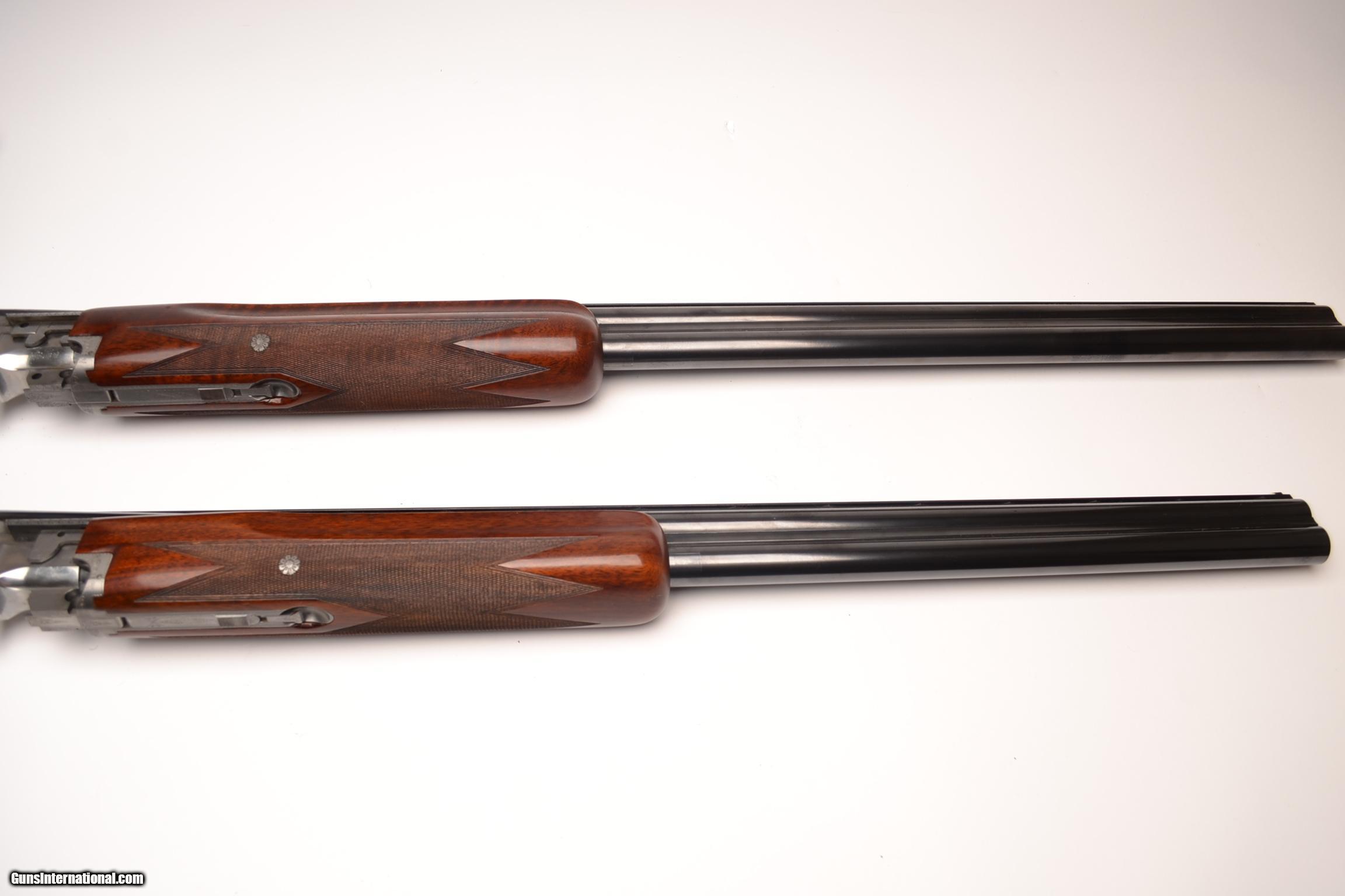 Description: Browning - Pigeon Grade, 12ga., Two barrel set, 26 ¼” barrels, M/IM choked, 30” barrels, IM/F choked, no salt gun, European walnut stock long tang square knob, Belgian manufacture, Browning butt plate, target style forends, gloss finish, gold single selective trigger, ventilated ribs, automatic ejectors, new and near perfect gun. In case. Inv# 19873 7 lbs. 5.3 oz. 14 1/8” x 1 3/8” x 1 3/8” $4,995.00 SOLD |