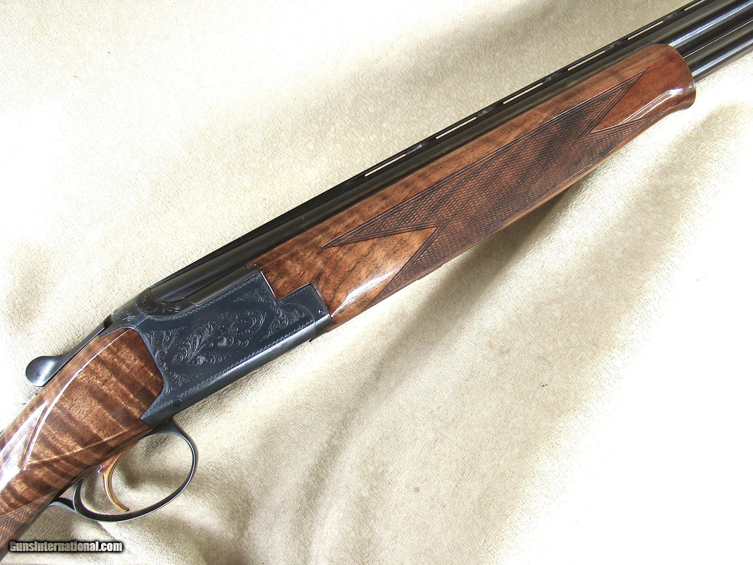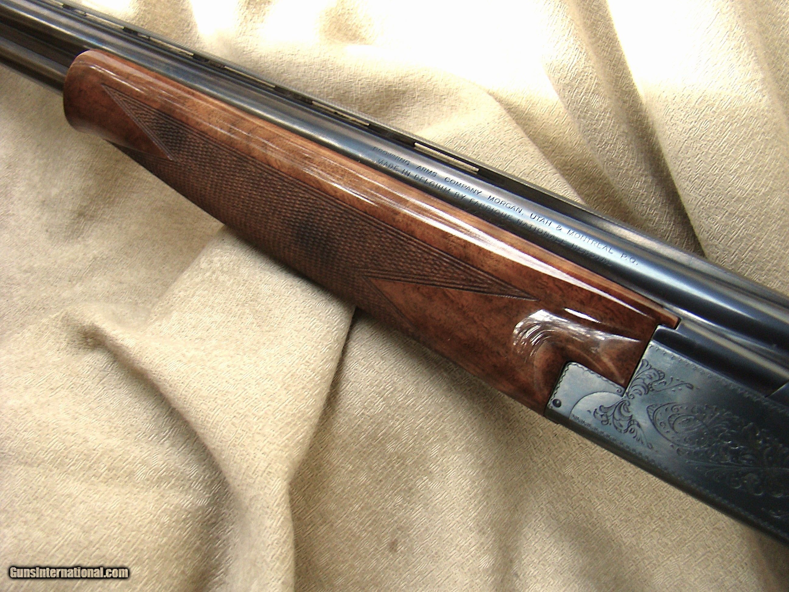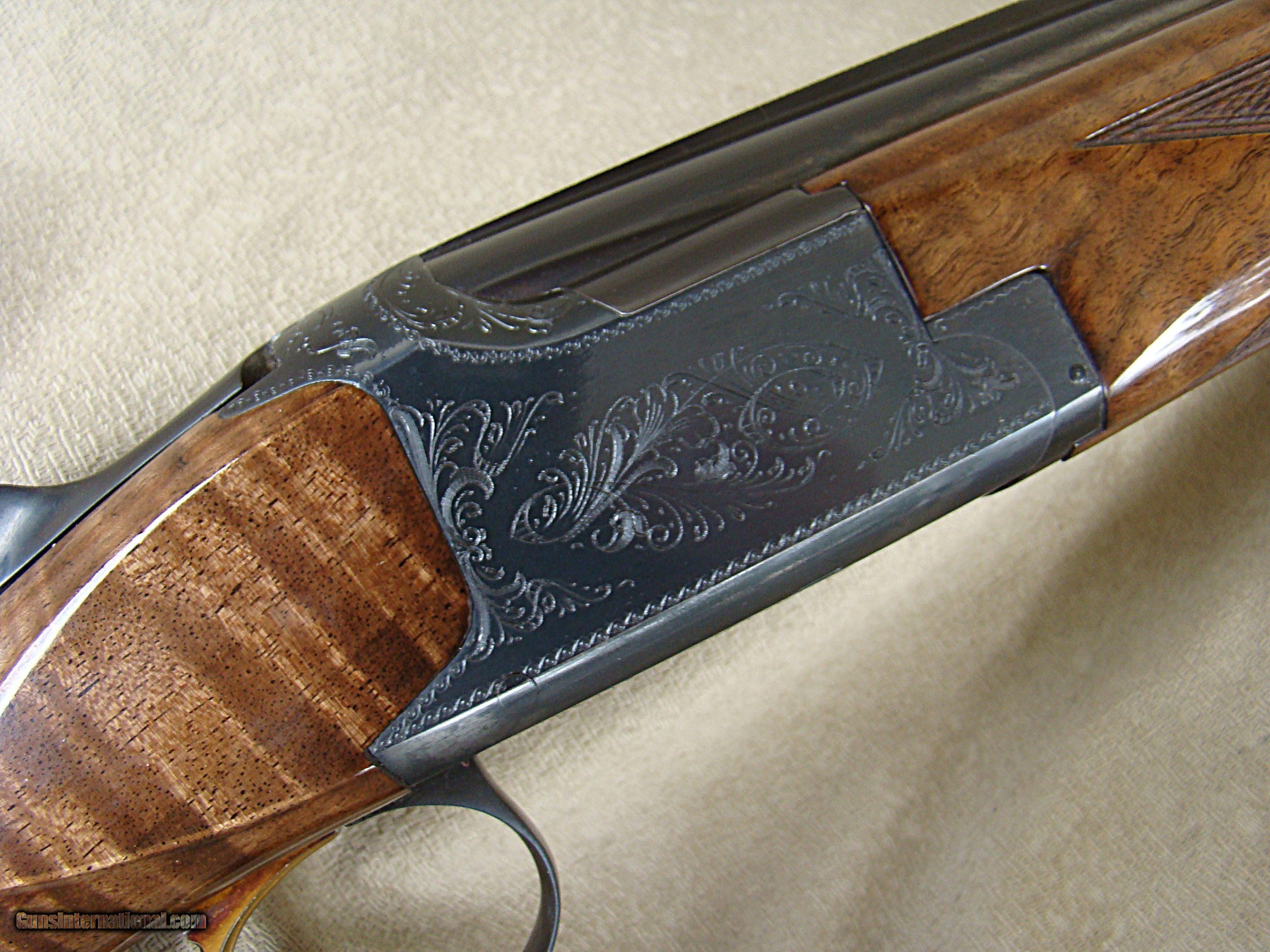 Description: Outstanding Browning Superlight 20 gauge. 26-1/2" vent rib barrels, special order choking, cylinder/improved cylinder (.003/.012). This is a late production example circa 1984. The action has the open scroll engraving signed A. Poes. Fabulous straight hand stock of wonderful color and bold flame grain figure that one would expect on a Pigeon grade! Schnabel forend with matching color and figure. With this choke combination and highly figured stock this just may be a special order. Measurements are 1-3/8" comb, 2-1/4" heel, 14-1/4" to the Browning butt plate. Weighs just 5 lbs 11 oz. A fine little Superlight with striking good looks. SOLD |
