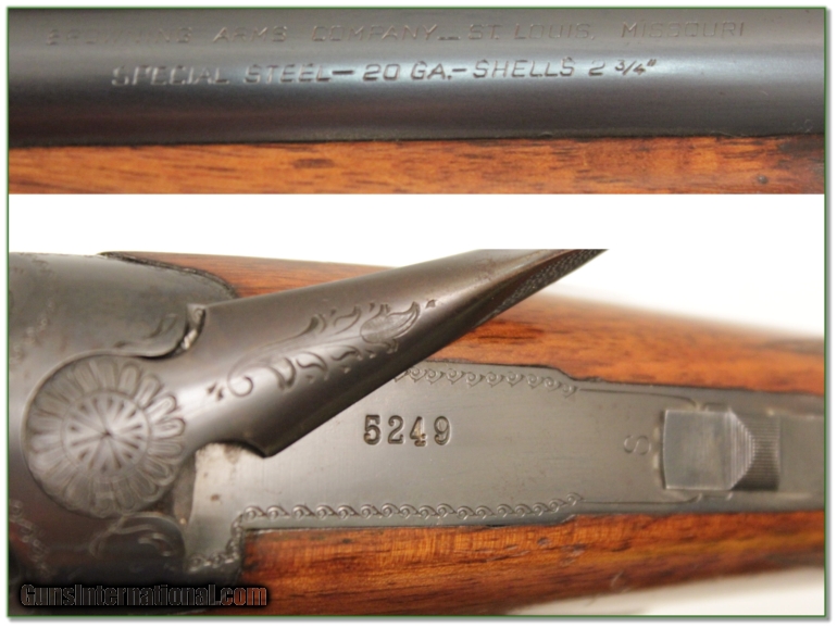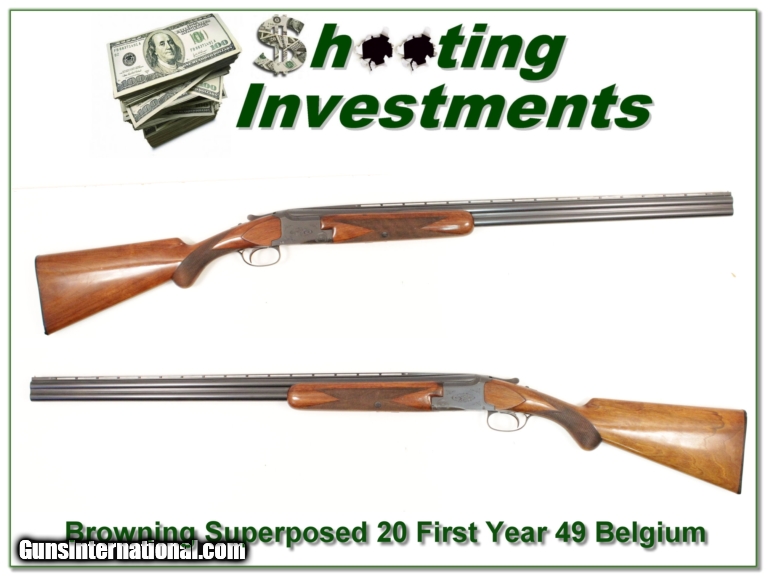 Description: Collectors, this is a VERY hard to find early Browning 1952 Belgium 20 Gauge Superposed. It was made in Belgium in 1949! This one is all original down to the horn butt plate. Many of these had recoil pads added over the year. This is even the harder to find 28in F and Mod. Most were 26in guns. This one has some honest careful use as seen. It could be restored to perfect or left original. In either case it is a classic Browning that is sure to increase in value over time. It is a Shooting Investment. Shipping and insurance is $30 or $18 more if you want it shipped in a new Plano hard case. Please email me with any questions or larger pictures. (I now consign quality firearms only 10%! Let me know if you have any you would like to sell!) [14-0687] Terms & Conditions Payment: Payment is by Money Order, Cashiers Check or Personal Check. I can now also accept MasterCard and Visa with a 3% convenience fee. PayPal can be used for some items but never firearms. Please let us know if you would like to pay via PayPal. Shipping: The shipping charge will be listed in each description. It is $30 for most guns. Some heavy guns or those insured for over $2000 may be higher. Shipments to Alaska and Hawaii are higher because air shipment is required. Most firearms are shipped within 5 days of receipt of payment. We prefer shipping at the beginning of the week to avoid firearms in transit over weekends. We package all shipments carefully and insure them for the full purchase price, rounded up to the next $100. In the unlikely event that damage occurs, it is important that you save all packaging material for the claims process. Optics are shipped Priority Mail and most other non-firearm shipments are shipped First Class. Returns: Our return policy is simple. If for any reason you are not pleased with your purchase, you may return your item for a refund. The only exception is ammunition, it cannot be returned. It is important to us that you are happy. Guns cannot be fired or dissembled before returning them and must be returned in the same condition as received. Notification of a return must occur with-in 3 days of receipt at your dealer. Shipping, convenience and dealer fees are not refundable and are the responsibility of the buyer. Lay-a-way: If needed, we offer a 60 day lay-a-way option on most firearms. It is 1/3 now, 1/3 in 30 days and 1/3 in 60 days. Lay-a-way firearm sales are final. Consigning your firearms with Shooting Investments: We will help you get top dollar for your firearms. While most local guns shops charge 20% or more, our fee is only 10% with a minimum of $50. At your local gun shop it might take months to sell. Selling on-line provides instant access to thousands of interested buyers. You won’t find any other on-line dealer willing to sell your firearms for only 10% or listing every gun on 4 separate s. Selling through an House typically costs 15% and you have to wait several months to sell and longer to receive funds. If properly priced, we will sell your firearms in a week or two. Send us an email or give us a call and we’ll explain how easy it is for you to get top dollar. Trading: We collect guns and usually just trade for guns we want to add to our collections. We often sell guns for others wanting to purchase one of ours. We find this the most fair to both of us. Our Commission is only 10% and we hold the gun you want until yours sells. Please contact us if you want to sell one of yours to buy one of ours. Help for California Buyers: We are happy to ship to California. It is the buyer’s responsibility to make sure any item you buy is legal in your state. We are also happy to help with your purchase of a firearm from someone other than us. If you see a gun you would like to buy but the seller can’t or won’t ship to California we can help. You buy the gun and have it shipped to us. We’ll then ship it to your California dealer. The cost for this service is only $30 + shipping. Let me know if we can help! SOLD |