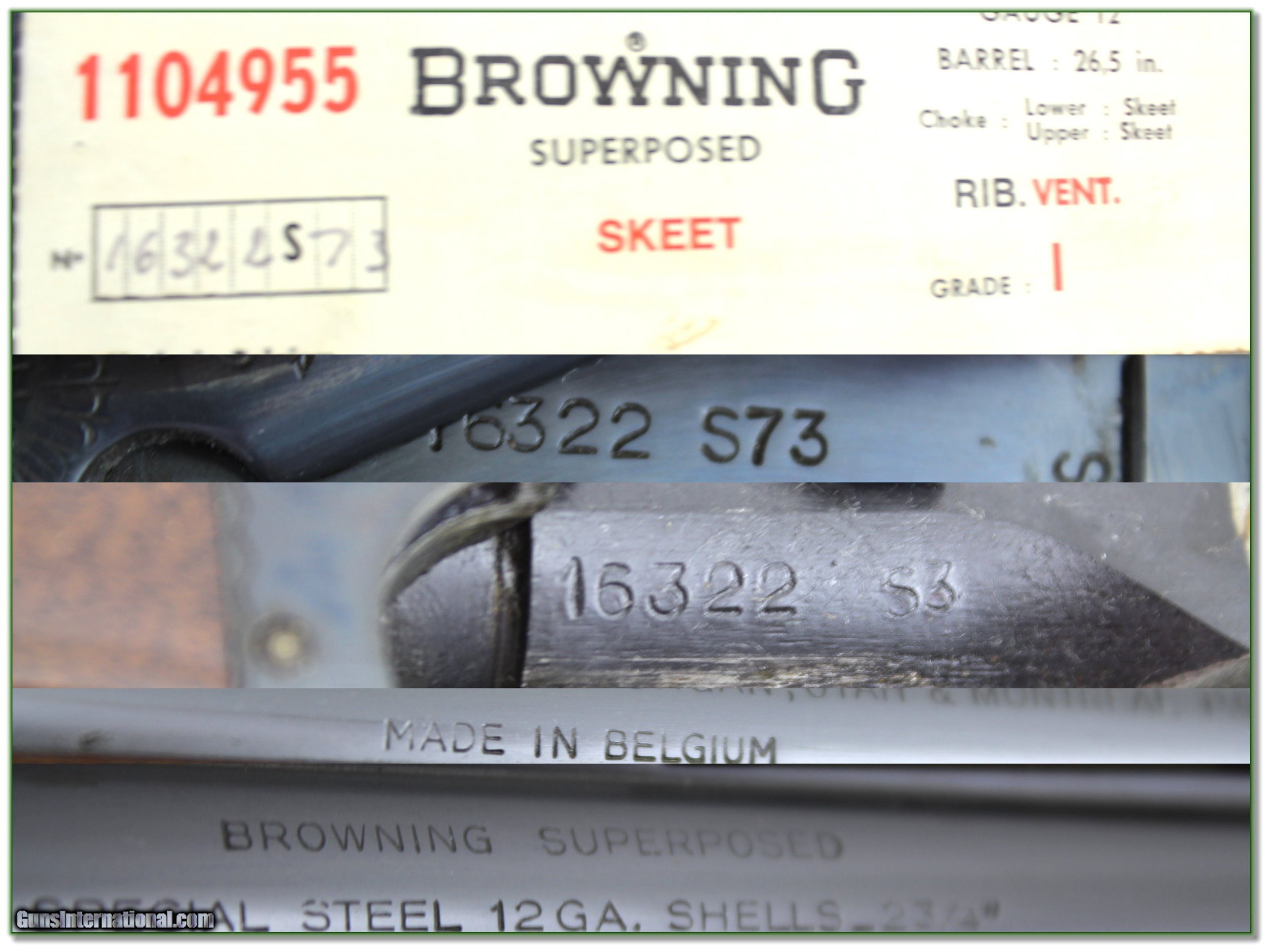 Description: Collectors and Skeet Shooters, this is a new condition and in the BOX 1973 Belgium made Browning Superposed. It DOES NOT HAVE SALTWOOD! It comes as seen in perfect box, in original shipping box with perfect papers. These have factory pads and 26.5in Skeet and Skeet barrels. Owner test fired this one only. You can not find a nicer example! I am selling this one on consignment and as such lay-a-way can’t be used. It does of course have the standard 3-day inspection. Shipping and insurance is $49. Please email me with any questions or larger pictures. (Consign your quality firearms with Shooting Investments for only 12%! Let me know if you have any you would like to sell!) 21-0357 Payment: Payment is by Money Order, Cashiers Check or Personal Check. I can now also accept Credit Cards (MasterCard, Visa, Discover & American Express) with a 3% convenience fee. Shipping: The shipping charge will be listed in each description. It is $39 for most firearms. Some heavy guns or those insured for over $2000 will be higher. Shipments to Alaska and Hawaii are higher because air shipment is required. Most firearms are shipped on Tuesday and Thursday and usually in 5 days of receipt of payment. We package all shipments carefully and insure them. Optics are shipped Priority Mail and most other non-firearm shipments are shipped First Class. Returns: Our return policy is simple. If for any reason you are not pleased with your purchase, you may return your item for a full refund of purchase price. Ammunition cannot be returned. It is important to us that you are happy. Guns cannot be fired or dissembled before returning them and they must be returned in the same condition as received. Notification of a return must occur with-in 3 days of receipt at your dealer. Shipping, convenience and dealer fees are not refundable and are the responsibility of the buyer. Lay-a-way: If needed, we offer a 60 day lay-a-way option on most firearms. It is 1/3 now, 1/3 in 30 days and 1/3 in 60 days. Lay-a-way firearm sales are final and if not completed the first payment cannot be returned. Consigning your firearms with Shooting Investments: We will help you get top dollar for your firearms. While most local guns shops charge 20% or more, our fee is only 12% with a minimum of $75. At your local gun shop it might take months to sell. Selling on-line provides instant access to thousands of interested buyers. You won’t find any other on-line dealer willing to sell your firearms for only 12% or listing every gun on 3 separate s. Selling through an House typically costs the seller 15% and the buyer an addition 15% (so 30%) and you have to wait several months to sell and longer to receive funds. If properly priced, we will sell your firearms in a few weeks. Send us an email or give us a call and we’ll explain how easy it is for you to get top dollar. Trading: Trading for use is really just buying your gun to re-sell. If you have a gun you want to trade, please email a picture and we will let you know what we can give or it. You will always get more if we sell it for you on consignment. Help for California Buyers: We are happy to ship to California. It is the buyer’s responsibility to make sure any item you buy is legal in your state. We are also happy to help with your purchase of a firearm from someone other than us. If you see a gun you would like to buy but the seller can’t or won’t ship to California they can ship to use and we’ll then ship it to your California dealer. The cost for this service is only $30 + shipping. Let us know if we can help! SOLD |