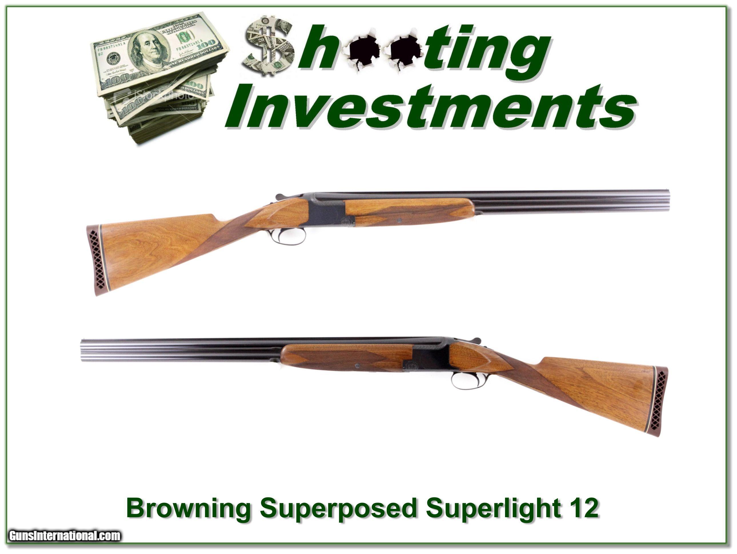 Description: This is a very nice had hard to find Browning Superposed Superlight! It is in excellent lightly used condition. This 12 Gauge was made in Belgium in 1968 and it does NOT have saltwood! It has a 13.5in LOP to Browning recoil pad. I am selling this one on consignment and as such lay-a-way can’t be used. It does of course have the standard 3-day inspection. Shipping and insurance is $49. Please email me with any questions or larger pictures. (Consign your quality firearms with Shooting Investments for only 12%! Let me know if you have any you would like to sell!) 18-0482 Payment: Payment is by Money Order, Cashiers Check or Personal Check. I can now also accept MasterCard and Visa with a 3% convenience fee. PayPal can be used for some items but never firearms. Please let us know if you would like to pay via PayPal. Shipping: The shipping charge will be listed in each description. It is $39 for most long guns and $29 for most handguns. Some heavy guns or those insured for over $2000 will be higher. Shipments to Alaska and Hawaii are higher because air shipment is required. Most firearms are shipped on Tuesday and Thursday and usually in 5 days of receipt of payment. We package all shipments carefully and insure them. Optics are shipped Priority Mail and most other non-firearm shipments are shipped First Class. Returns: Our return policy is simple. If for any reason you are not pleased with your purchase, you may return your item for a full refund of purchase price. Ammunition cannot be returned. It is important to us that you are happy. Guns cannot be fired or dissembled before returning them and they must be returned in the same condition as received. Notification of a return must occur with-in 3 days of receipt at your dealer. Shipping, convenience and dealer fees are not refundable and are the responsibility of the buyer. Lay-a-way: If needed, we offer a 60 day lay-a-way option on most firearms. It is 1/3 now, 1/3 in 30 days and 1/3 in 60 days. Lay-a-way firearm sales are final and if not completed the first payment cannot be returned. Consigning your firearms with Shooting Investments: We will help you get top dollar for your firearms. While most local guns shops charge 20% or more, our fee is only 12% with a minimum of $75. At your local gun shop it might take months to sell. Selling on-line provides instant access to thousands of interested buyers. You won’t find any other on-line dealer willing to sell your firearms for only 12% or listing every gun on 3 separate s. Selling through an House typically costs the seller 15% and the buyer an addition 15% (so 30%) and you have to wait several months to sell and longer to receive funds. If properly priced, we will sell your firearms in a few weeks. Send us an email or give us a call and we’ll explain how easy it is for you to get top dollar. Trading: Trading for use is really just buying your gun to re-sell. If you have a gun you want to trade, please email a picture and we will let you know what we can give or it. You will always get more if we sell it for you on consignment. Help for California Buyers: We are happy to ship to California. It is the buyer’s responsibility to make sure any item you buy is legal in your state. We are also happy to help with your purchase of a firearm from someone other than us. If you see a gun you would like to buy but the seller can’t or won’t ship to California they can ship to use and we’ll then ship it to your California dealer. The cost for this service is only $30 + shipping. Let us know if we can help! SOLD |