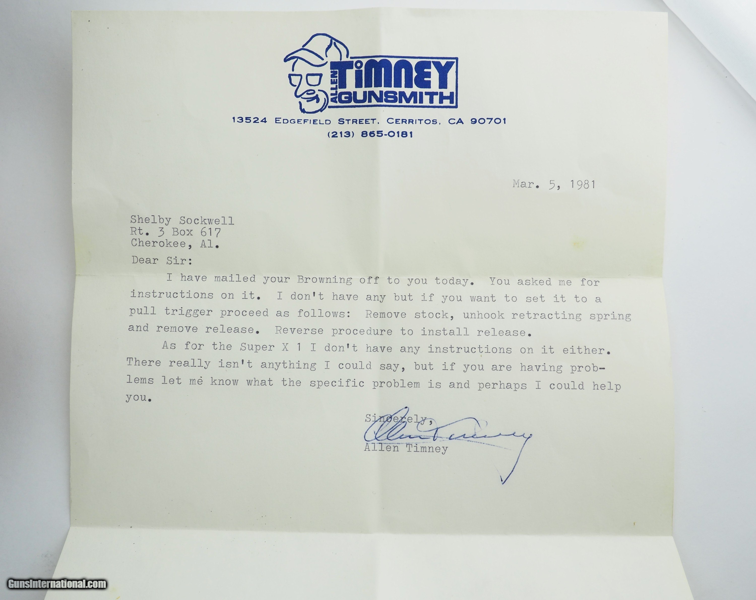 Description: Browning Superposed Broadway with 32” fixed-choke barrels which are also ported. Manufacture date is 1970, meaning this is a desirable late-production example. Features aftermarket adjustable comb and adjustable buttplate. Prior to listing for sale, the gun was given a full teardown service to include a strip clean, fresh locking bolt, and springs. Included are original Timney double release trigger components which we will install in the gun upon request. Otherwise, the parts are included. Comes in original Browning factory case with original booklet. Make: Browning Model: Superposed Broadway Gauge: 12ga Barrel length: 32” Hand: Right LOP: 14.6" DAC: 1.29" (33mm) DAH: (adjustable) Bore, bottom: .725” Bore, top: .725” Choke, bottom: .021” (Modified) Choke, top: .038” (Extra Full) Accessories: Timney double release parts (functioning when installed), comb spacers, comb wrench, Browning factory paperwork, Timney paperwork Case: Browning factory, original ICN #00842 Price: $2250.00 SOLD |