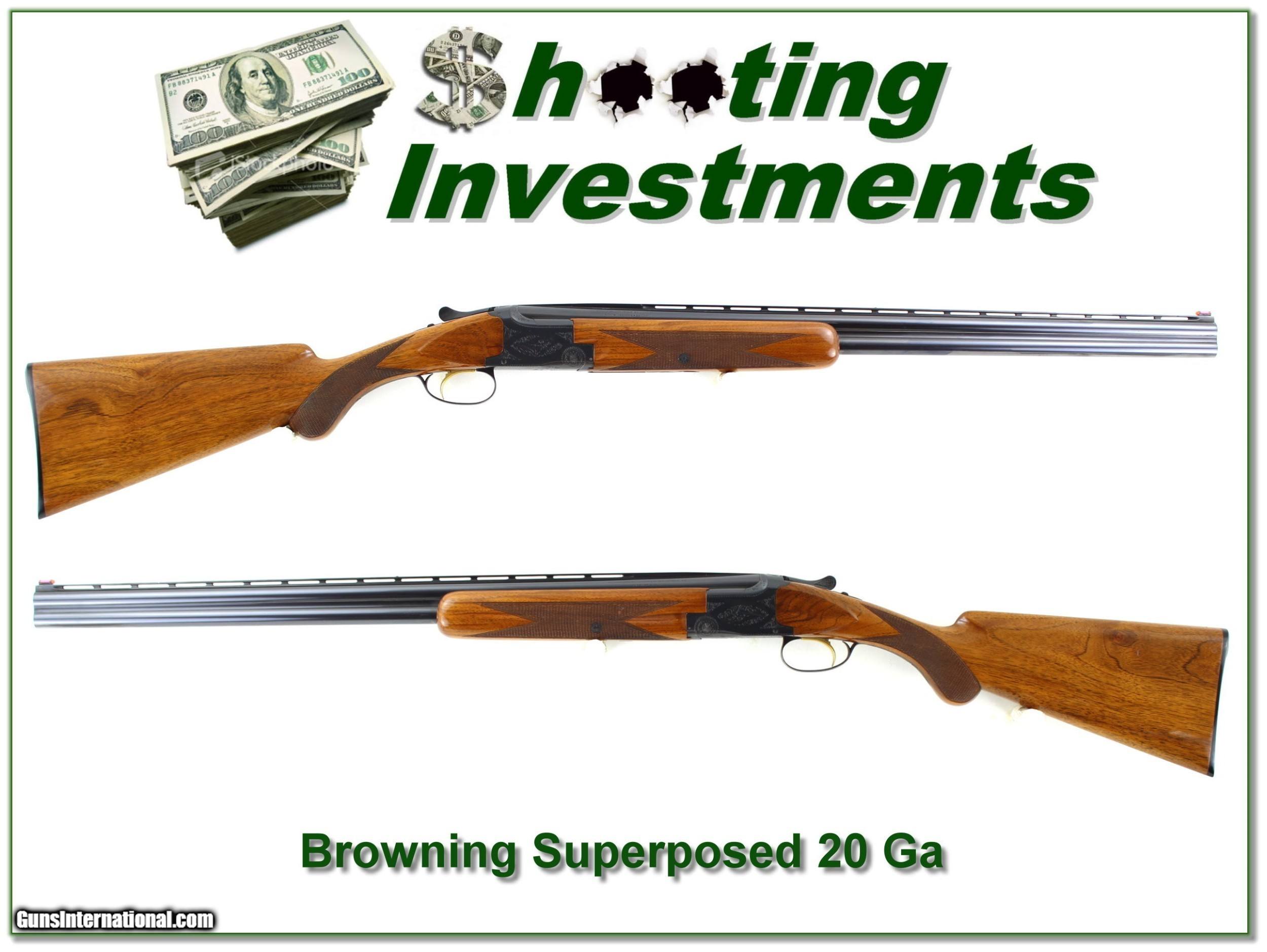 Description: This is an excellent condition Browning Superposed 20 Gauge. It was made in Belgium in 1964 so there are no saltwood worries. It has beautiful honey blond wood with extra nice grain. This is a Round Knob Long Tang Superposed. It is 26.5in barrels choked Skeet and Skeet. I don’t see any marks on the metal and no edge wear. The lock up is tight and the lever still way to the right. The wood has only a few light marks. This will make a classic Browning 20 Gauge and you can expect it to increase in value over time. That makes it a real Shooting Investment. Shipping and insurance is $59. Please email me with any questions or larger pictures. (Consign your quality firearms with Shooting Investments for only 12%! Let me know if you have any you would like to sell!) 21-0397 Payment: Payment is by Money Order, Cashiers Check or Personal Check. I can now also accept Credit Cards (MasterCard, Visa, Discover & American Express) with a 3% convenience fee. Shipping: The shipping charge will be listed in each description. It is $39 for most firearms. Some heavy guns or those insured for over $2000 will be higher. Shipments to Alaska and Hawaii are higher because air shipment is required. Most firearms are shipped on Tuesday and Thursday and usually in 5 days of receipt of payment. We package all shipments carefully and insure them. Optics are shipped Priority Mail and most other non-firearm shipments are shipped First Class. Returns: Our return policy is simple. If for any reason you are not pleased with your purchase, you may return your item for a full refund of purchase price. Ammunition cannot be returned. It is important to us that you are happy. Guns cannot be fired or dissembled before returning them and they must be returned in the same condition as received. Notification of a return must occur with-in 3 days of receipt at your dealer. Shipping, convenience and dealer fees are not refundable and are the responsibility of the buyer. Lay-a-way: If needed, we offer a 60 day lay-a-way option on most firearms. It is 1/3 now, 1/3 in 30 days and 1/3 in 60 days. Lay-a-way firearm sales are final and if not completed the first payment cannot be returned. Consigning your firearms with Shooting Investments: We will help you get top dollar for your firearms. While most local guns shops charge 20% or more, our fee is only 12% with a minimum of $75. At your local gun shop it might take months to sell. Selling on-line provides instant access to thousands of interested buyers. You won’t find any other on-line dealer willing to sell your firearms for only 12% or listing every gun on 3 separate s. Selling through an House typically costs the seller 15% and the buyer an addition 15% (so 30%) and you have to wait several months to sell and longer to receive funds. If properly priced, we will sell your firearms in a few weeks. Send us an email or give us a call and we’ll explain how easy it is for you to get top dollar. Trading: Trading for use is really just buying your gun to re-sell. If you have a gun you want to trade, please email a picture and we will let you know what we can give or it. You will always get more if we sell it for you on consignment. Help for California Buyers: We are happy to ship to California. It is the buyer’s responsibility to make sure any item you buy is legal in your state. We are also happy to help with your purchase of a firearm from someone other than us. If you see a gun you would like to buy but the seller can’t or won’t ship to California they can ship to use and we’ll then ship it to your California dealer. The cost for this service is only $30 + shipping. Let us know if we can help! SOLD |