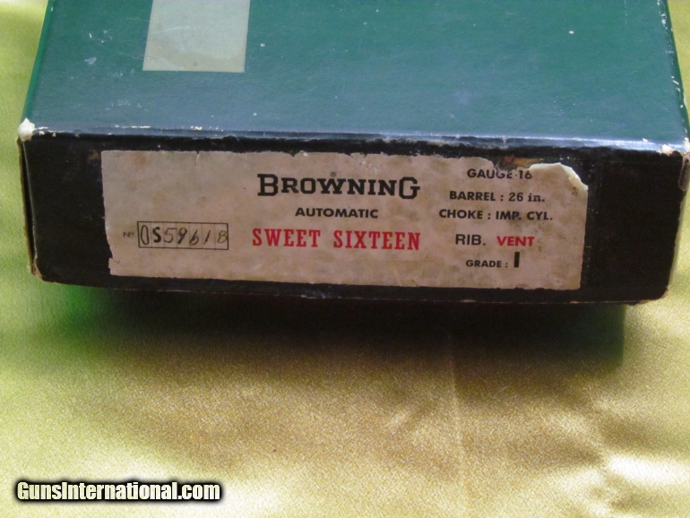 Description: Browning Sweet 16 round knob in the box with 26" vent rib, imp. cyl barrel. Gun is in 99% condition. Made in 1960 and is a great collectible piece. Gun S/N OS 596XX. Buyer pays $68.00 shipping. Must ship to FFL Dealer or C & R license For more info. call Wayne at 513-515-4250 or 513-726-4827 SOLD |