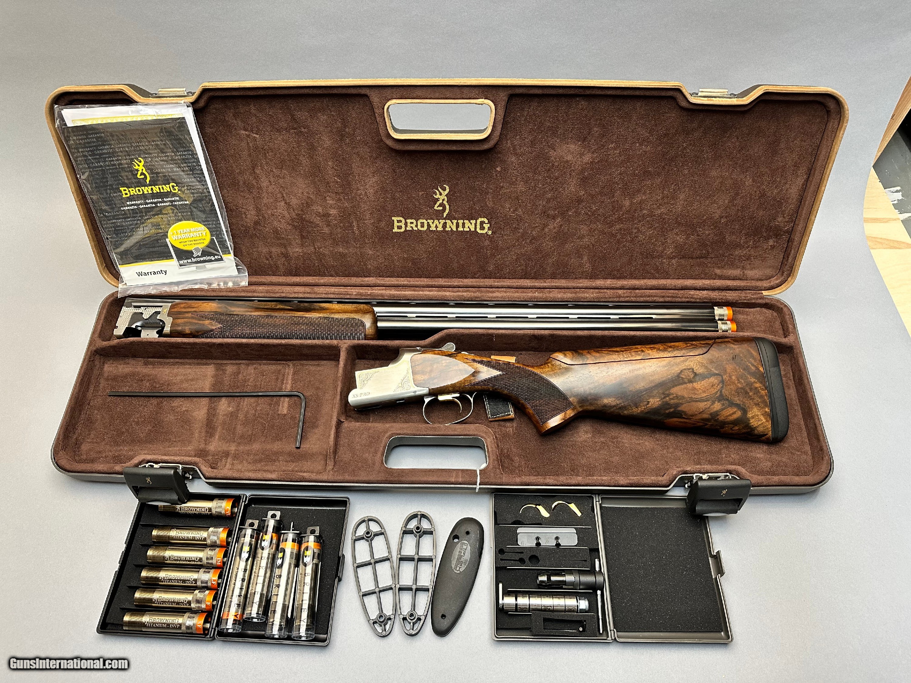 Description: Browning XS Pro 12 Ga upgraded wood - 30" barrels - 12 Browning Titanium Extended Chokes & weights [3" Chambers | 30" Barrels | 50" Overall Length | Near Mint Condition | No Case] Browning XS Pro Adj., 12 Ga, a precision Over/Under shotgun built for the clay range, featuring 30" barrels, 3" chambers, and a ventilated tapered rib. It features a walnut stock with a pistol grip and adjustable comb, and a 12 Browning Titanium Extended choke system for versatile shooting performance. This Browning XS Pro Adj. (2022, Japan) is in near-mint condition with a wood that is absolutely beautiful. It includes the weights system for the barrel and stock, 12 Browning Titanium Extended Chokes, two extra triggers, and tools to adjust the comb, plus a recoil pad and a tool to remove the stock. It has LOP 15", LOP to Wood 14", Cast Right, stock: Pistol Grip, Adj. Comb; Palm Swell: Right; 3" chambers, 30" barrels, 50" overall length, 12 Ga, Over / Under action, Ventilated tapered Rib, Steel Proof barrels, Ejectors, Manual Safety, and a Barrel Selector integrated in the Safety. It is licensed for FFL and made in Japan in 2022.