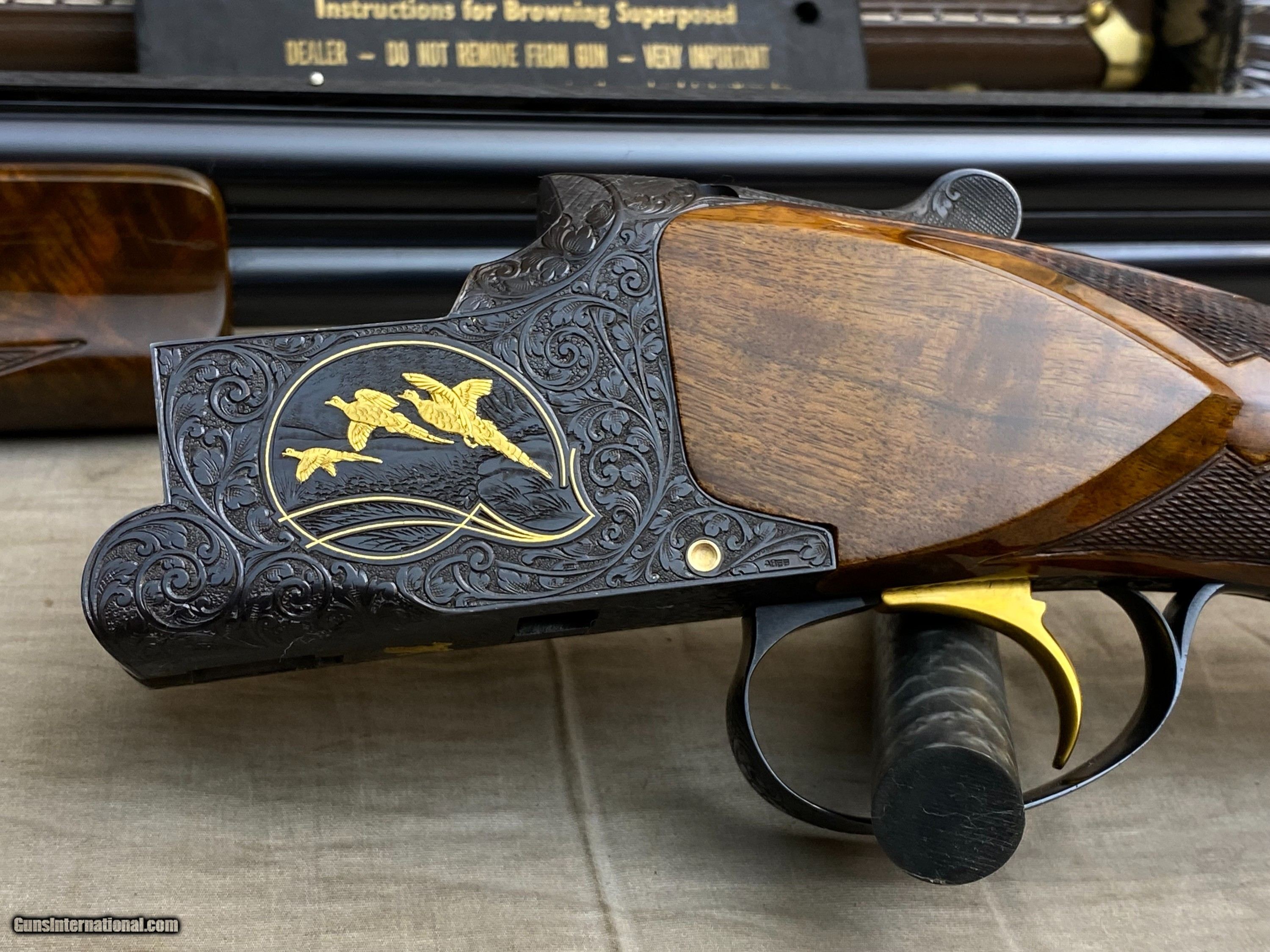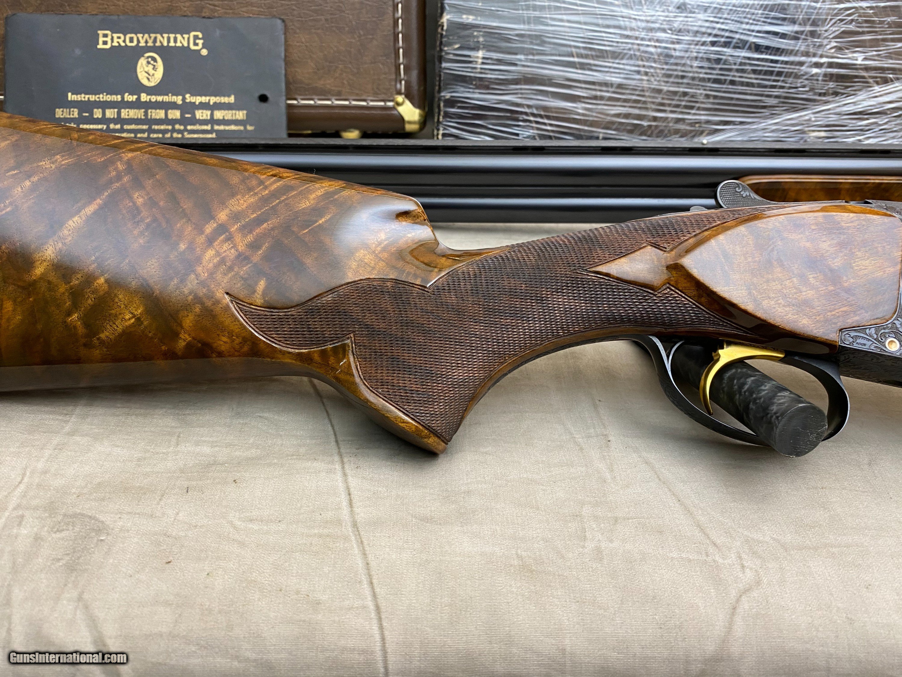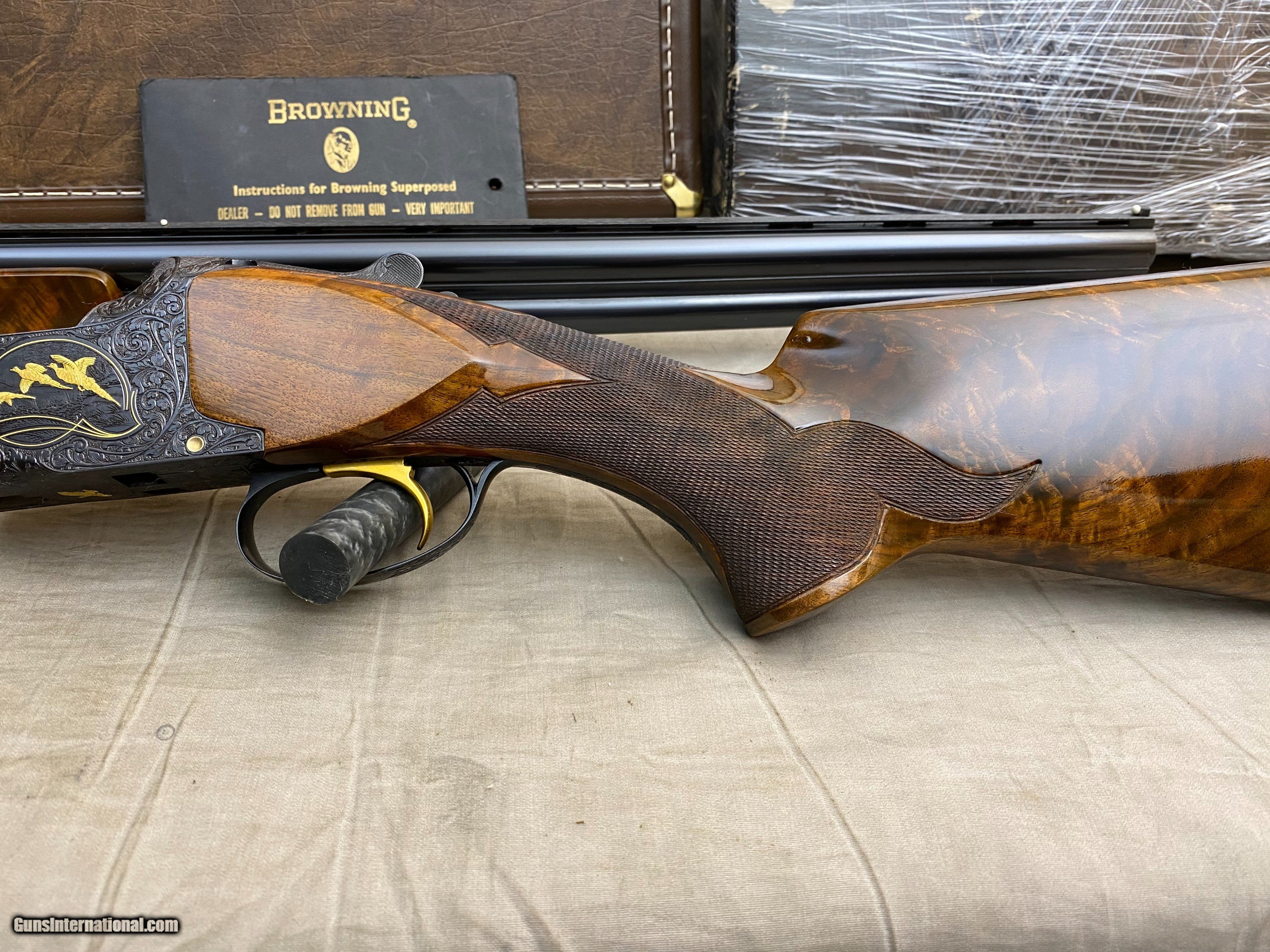 Description: For sale from my Dad and I's personal collection is a stunning Belgian Browning Superposed Midas Grade 12 gauge! This shotgun features 30 inch barrels that are choked Full (*) over Mod (**). I believe this is an upgrade done by Angelo but it is a complete match to the factory specs for a Midas grade, wood quality, finish, and checkering pattern, gold firing and locking pins, hand filed cross hatch vent rib with dual ivory beads, as well as factory white lined recoil pad for a 12ga target configured gun in the post-salt era. The wood on this shotgun is an extremely attractive golden feathered walnut with dark swirling grain that continues through both the stock and the forearm. The checkering is hand cut and extremely sharp! The engraving is also nothing short of exceptional, the gold inlaid game birds nearly pop off the receiver and the detailed scrollwork throughout the entire gun definitely warrant the term "Midas" grade. The condition is extremely nice, handling evidence and looks to have been used very little! Comes with re-numbered period box, original manuals, and a new Browning hard case with keys! Vintage firearms are a passion of mine. I am more than happy to provide any insight or info that I can regarding vintage Brownings and Colts you may have questions or concerns about. Do not hesitate to call/text me at 402-314-2729 even if it is not about the gun I have for sale! Love talking with people who have an appreciation for them, sharing my knowledge, and learning more when I can. From a large collection of fine firearms accumulated by my Dad and I over the last 30 years. I provide a 5 day inspection period to ensure you are happy with everything and that I was accurate in my description and photographs. I hope to find good homes where these collectible pieces will be appreciated and enjoyed. Shipping is a flat $75 to lower 48 (PRIORITY MAIL, INSURED FOR THE VALUE OF THE GUN, INDIVIDUAL TO FFL SHIPMENT), NO MORE PAYPAL! Local purchase must have Conceal Carry Permit or Nebraska Purchase Permit, otherwise transferred through a local FFL Thank you for looking and have a wonderful day! SOLD Shotgun Gauge: 12 Gauge Manufacturer: Browning Serial Number: 9092 S72 |