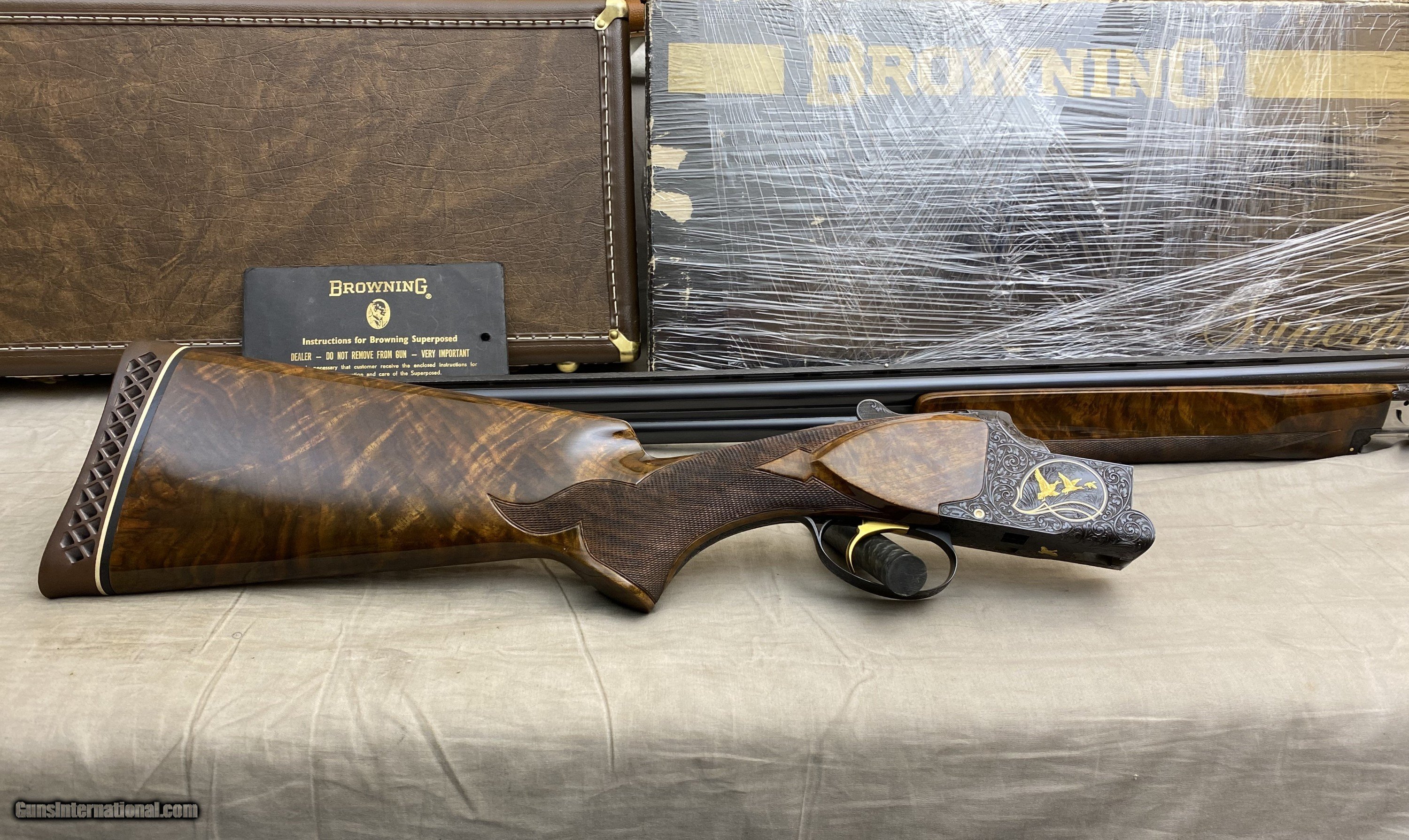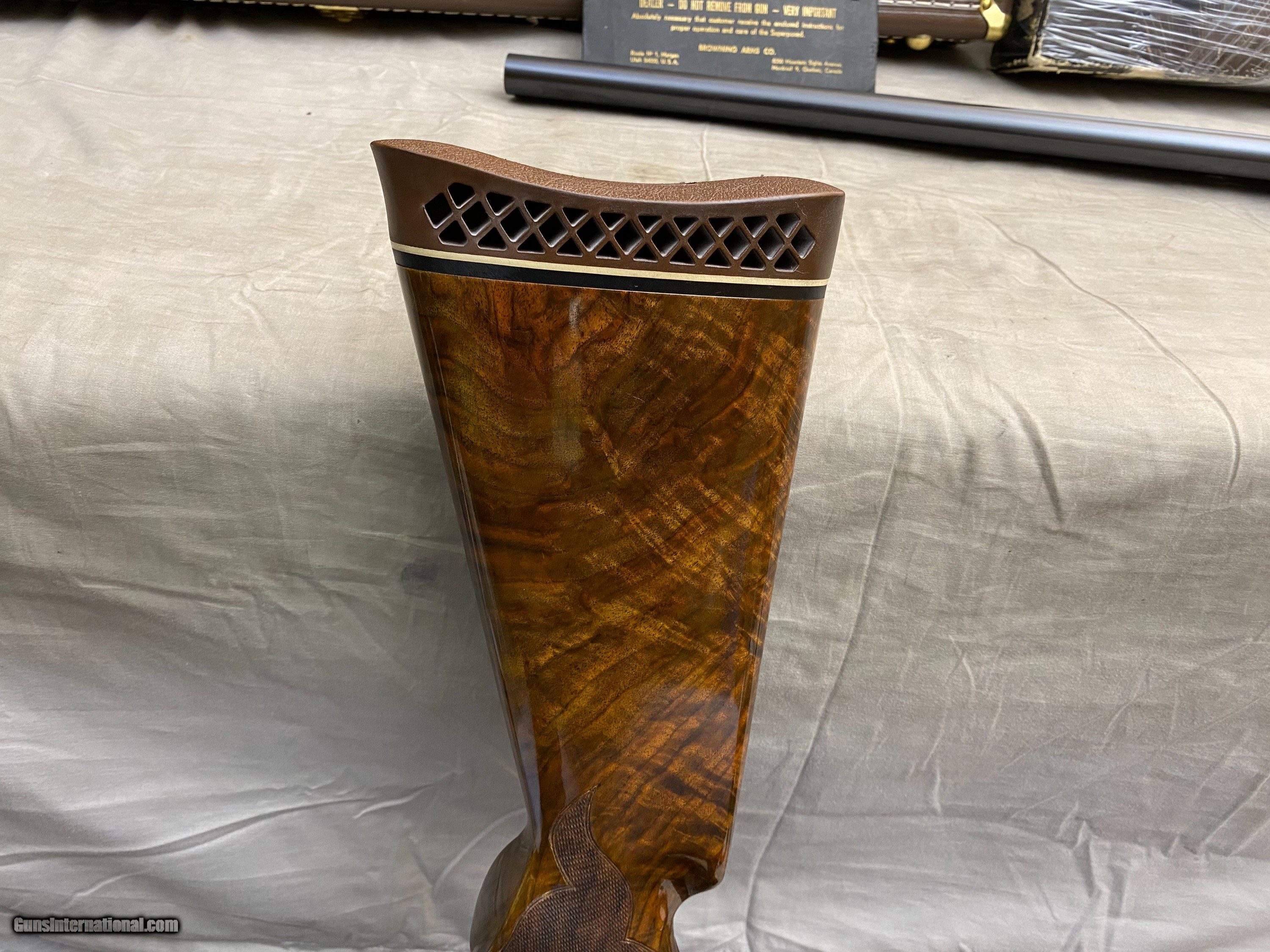 Description: For sale from my Dad and I's personal collection is a stunning Belgian Browning Superposed Midas Grade 12 gauge! This shotgun features 30 inch barrels that are choked Full (*) over Mod (**). I believe this is an upgrade done by Angelo but it is a complete match to the factory specs for a Midas grade, wood quality, finish, and checkering pattern, gold firing and locking pins, hand filed cross hatch vent rib with dual ivory beads, as well as factory white lined recoil pad for a 12ga target configured gun in the post-salt era. The wood on this shotgun is an extremely attractive golden feathered walnut with dark swirling grain that continues through both the stock and the forearm. The checkering is hand cut and extremely sharp! The engraving is also nothing short of exceptional, the gold inlaid game birds nearly pop off the receiver and the detailed scrollwork throughout the entire gun definitely warrant the term "Midas" grade. The condition is extremely nice, handling evidence and looks to have been used very little! Comes with re-numbered period box, original manuals, and a new Browning hard case with keys! Vintage firearms are a passion of mine. I am more than happy to provide any insight or info that I can regarding vintage Brownings and Colts you may have questions or concerns about. Do not hesitate to call/text me at 402-314-2729 even if it is not about the gun I have for sale! Love talking with people who have an appreciation for them, sharing my knowledge, and learning more when I can. From a large collection of fine firearms accumulated by my Dad and I over the last 30 years. I provide a 5 day inspection period to ensure you are happy with everything and that I was accurate in my description and photographs. I hope to find good homes where these collectible pieces will be appreciated and enjoyed. Shipping is a flat $75 to lower 48 (PRIORITY MAIL, INSURED FOR THE VALUE OF THE GUN, INDIVIDUAL TO FFL SHIPMENT), NO MORE PAYPAL! Local purchase must have Conceal Carry Permit or Nebraska Purchase Permit, otherwise transferred through a local FFL Thank you for looking and have a wonderful day! SOLD Shotgun Gauge: 12 Gauge Manufacturer: Browning |