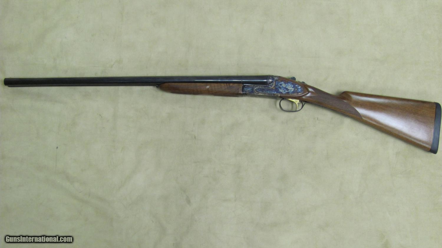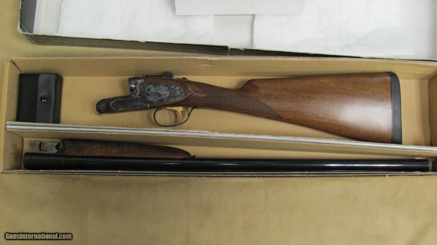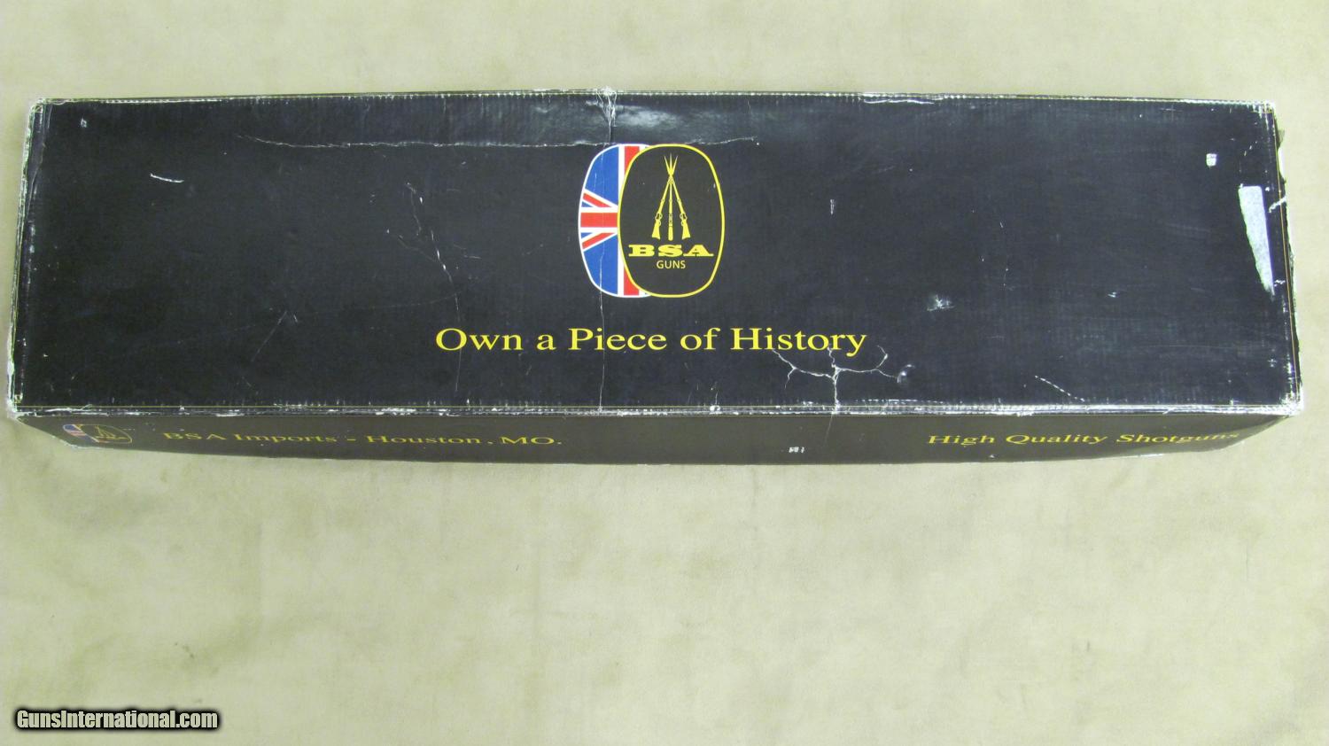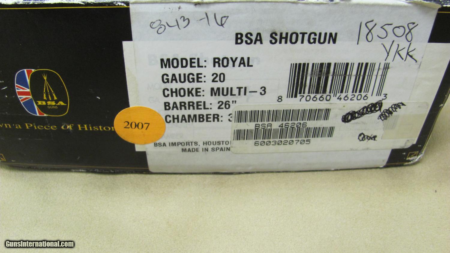Description: Beautiful BSA 20 Gauge Royal Grade Double Barrel Shotgun. Gun is unfired and in original carton. It has a selective single trigger, automatic ejectors and three choke tubes. Barrels are 26" long. LOP is 14.5". Gun is in new condition. SOLD Model: Royal Serial Number: 6003020705 Condition: Excellent Metal Condition: Excellent Wood Condition: Excellent Gauge Info: 20 Ga. LOP: 14.5 Rib: Raised Chokes: Screw-in Proof:Nitro: Nitro |