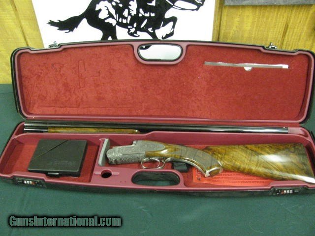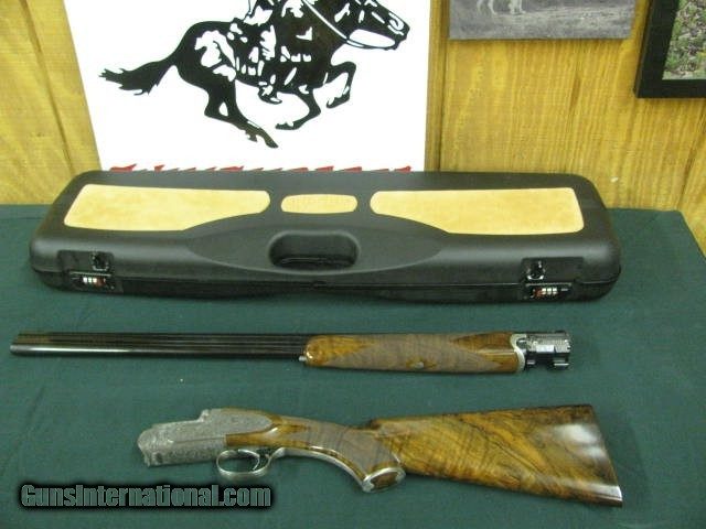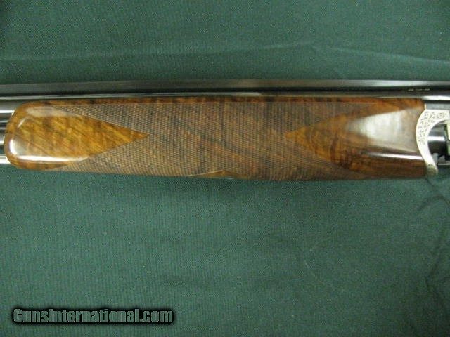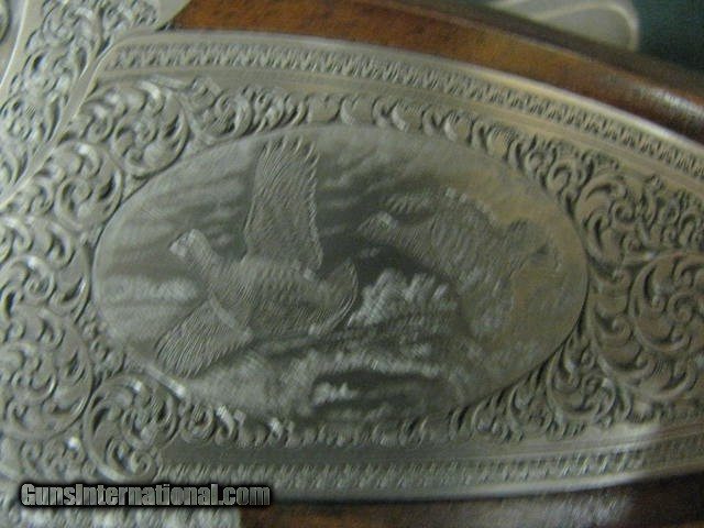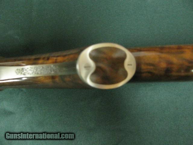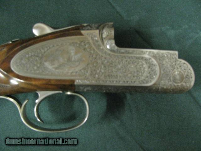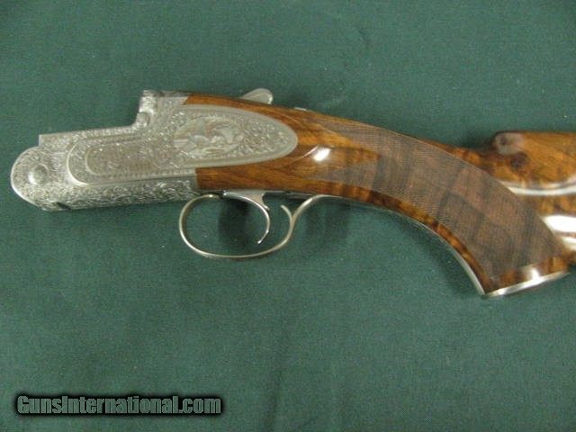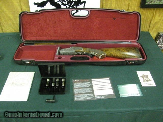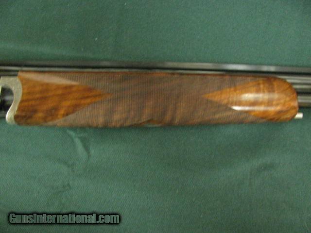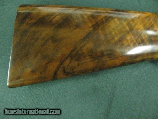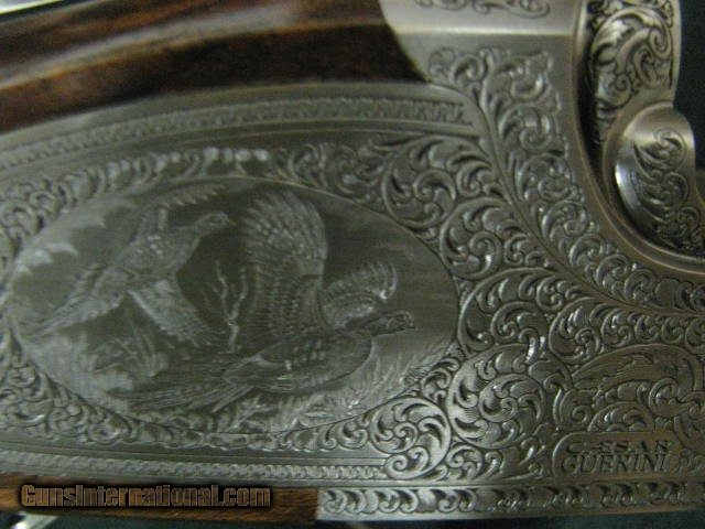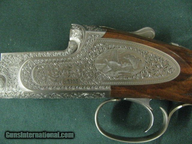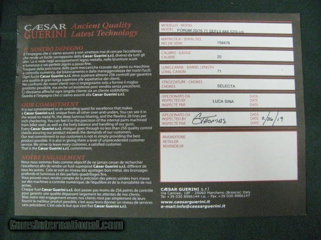 Description: 7389 Caesar Guerini FORUM 20 gauge 28 inch barrels 6 chokes cy, 2 ic m im full wrench, booklets, standing raised rib, 100% coin silver engraved receiver pheasants/quail Bottega Ginovelli, single select trigger, AAA+++ FANCY FULL FIGURE WALNUT, checkered butt, skelton pistol grip cap.99.9% condition. strikingly beautiful. AS NEW IN CASE SOLD Shotgun Gauge: 20 Gauge |