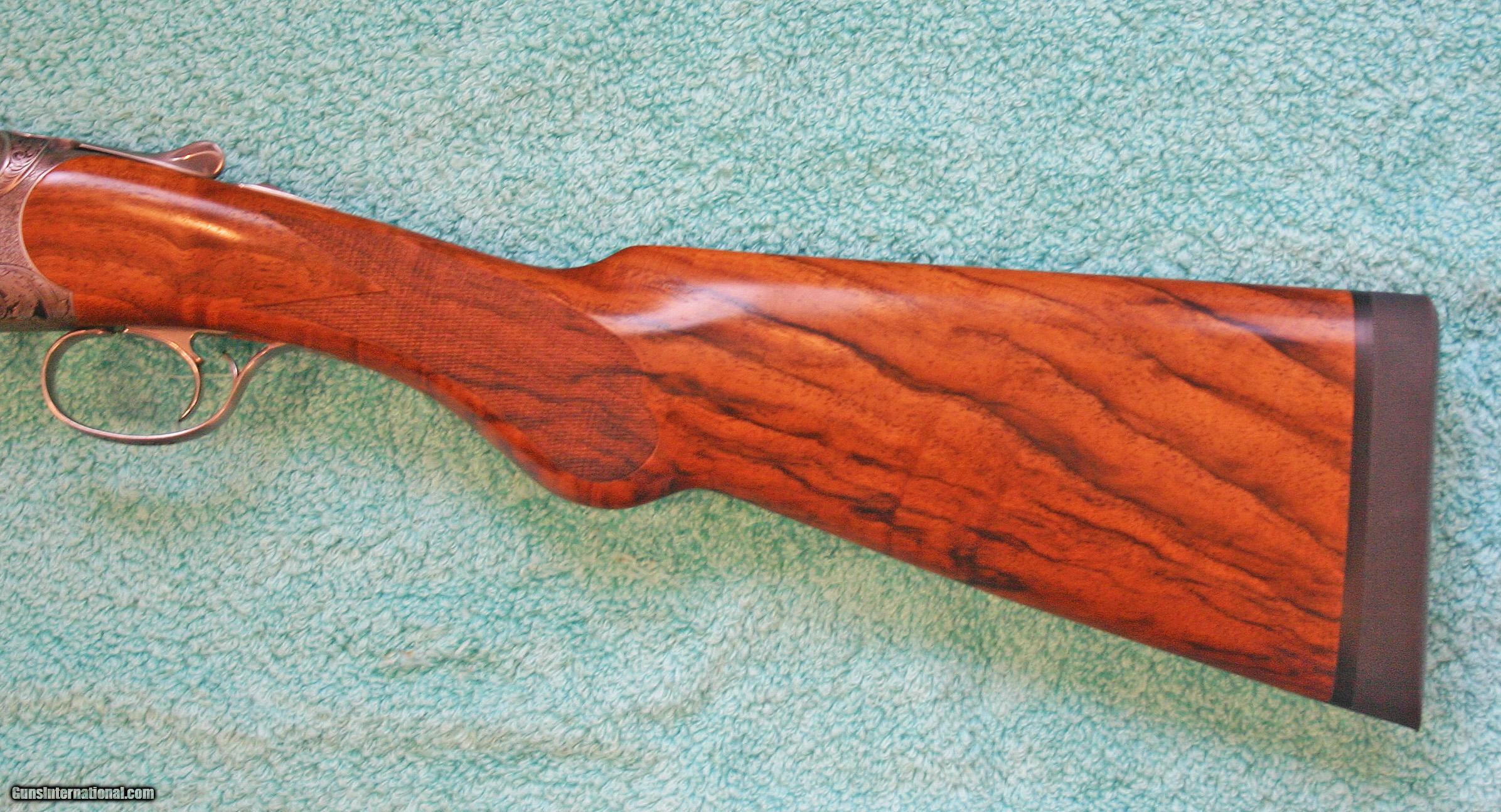 Description: SOLD ** Caesar Guerini Ellipse Evo, 20 ga., 3”, 28”bls, chokes, Signed Engraving, Near New Near new condition in maker’s case in original box with warranty card, this rounded action is light weight with its titanium alloy receiver, engraved and signed “Botega C. Giovanelli” on the lower tang, from the same engravers’ studio that engraves many Beretta SO3 and SO5 EELLs. A close look shows the scroll and floral work is masterfully executed. This great handling little shotgun features a 28” ventilated 6mm top rib with solid mid rib, 3” chambers, five factory screw chokes, a single adjustable selective trigger, an auto safety, and automatic ejectors. The stock is more beautiful than most, made of very nice AAA Turkish walnut with attractive grain patterns, color and contrast. It includes a checkered round-knob pistol grip (Prince of Wales grip), with checkered forearm with Anson push-button release and Caesar Guerini’s proprietary inlaid silver teardrop. Total weight is an astounding 6 lbs. 7 oz. Stock dimensions are 1 ½” x 2 ¼“ x 14 ½” over 1” Decelerator recoil pad, neutral cast for right or left hand. These are very nice and lightweight guns and great for those long days in the field! Caesar Guerini's shotguns are among the finest field type shotguns made. A mono block is used to show the superb scroll hand-engraving as well as the deep chiseled floral patterns which are cut in precisely with the shape of the action and shaded to add depth. All the major parts are hand fit and hand finished. Coin silver finish and wood surfaces are hand polished. The care and craftsmanship taken in building this model is second to none. Caesar Guerini’s Ellipse Evo is manufactured using the finest state of the art engineering and precision tools. Combine that with skilled human hands to achieve results that make these guns feel and shoot so well. Mechanical details include intercepting sears, rebounding hammers and independent inertia block, and extra heavy duty ejectors – all of which make this gun effortless to shoot. Cesar Guerini’s shotguns have been chosen as the best new shotguns by a panel of experts at Outdoor Life Magazine and rated as truly extraordinary shotguns. Every detail is carefully considered to reduce weight yet maintain balance. The frame and forend steel are machined from a solid forging of the best aircraft aluminum alloy with Titanium. Durability is insured through the use of hardened steel at all high-wear points. Comes with a factory velvet-lined lockable hard case and five precision patterned flush chokes (CYL, IC, M, IM, F) and a plastic choke case for the field. Caesar Guerini is one of the premium gunmakers in the Italian Gun Pantheon of Brescia Italy. Their shotguns are produced to the exacting specifications as laid out by the world’s best shooters, combining the finest craftsmanship, precise manufacturing tolerances and premium materials that Brescia gun makers are famous for the world over. From the fine 24 lpi cut checkering flawlessly executed on oiled Turkish Circassian walnut to the precise wood-to-metal fit with the most contemporary shooting features, the Caesar Guerini meets the highest standards of a best quality gun made today – and its an exceptional design. Compare this gun to Bautista Rizzini’s Inverness Round Body Deluxe Over and Under with heavier steel frame introduced in 2007 or Connecticut Shotgun Manufacturing Co.’s Inverness with steel frame introduced in 2011 with MSRP of $8,995. Introduced in 2010, today the MSRP is $6,150.00 plus $300.00 for Decelerator pad or $6,450.00 Priced here to sell at $5,250.00 Buyer must furnish FFL for shipping, payment by money order, cashier’s check, wire transfer, electronic deposit, or personal check with delay for clearing. Buyer pays $50 toward shipping. Seller is the author of The Rifleman’s Rifle (pre-64 Winchester Model 70s) and will furnish a Letter of Provenance that this gun is from the author’s collection. Feedback can be checked on eBay under rcrwin70roger. 3-day non-firing return privilege, no questions asked. SOLD |