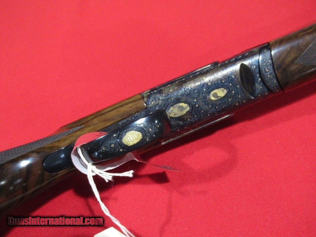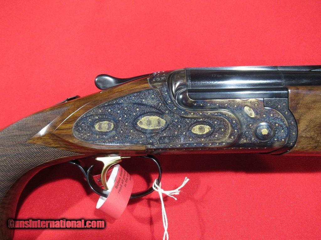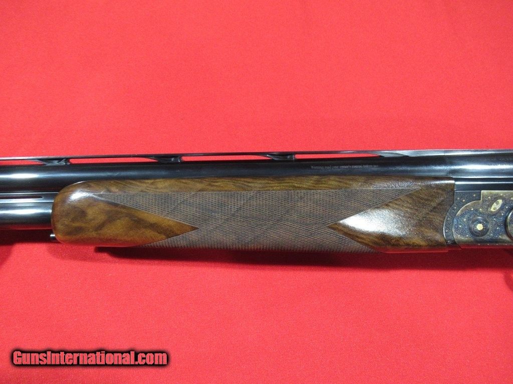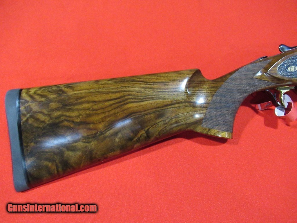 Description: Limited production sideplated gun with full coverage engraving with multi-colored gold highlights. This particular gun has an exceptional stock and round forend, high polished blued barrels, selective manual safety, threaded for Maxis Competition choke tubes (six included), adjustable trigger. Comes with a hard case, choke tube wrench with thread cleaner, wrench to adjust the trigger, and owner's manual with warranty card. SOLD |