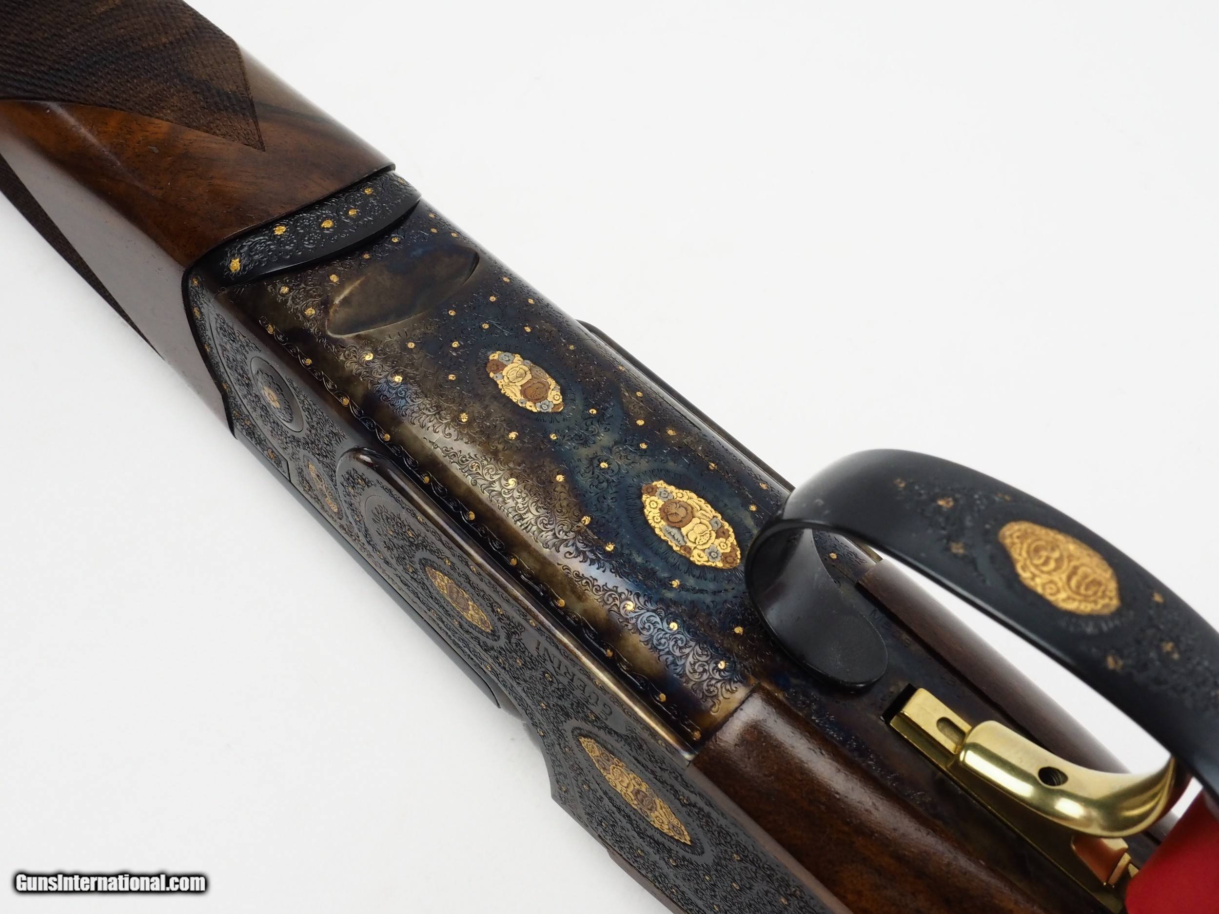 Description: Book #162. Call or email for competitive pricing, utiful shotgun exclusive to Caesar Guerini Elite Dealers for 2019! Case color, three shades of gold, and English-style rose-and-scroll engraving makes the Essex Ltd. Gold a truly stunning shotgun with a really unique look not found elsewhere. Also available left-handed or with a factory adjustable comb. Call us today! Drop at comb: 1.5" Drop at heel: 2.25" Length of pull: 14.75" Cast at heel: .12" Cast at toe: .2" Pitch: 5° Gauge: 12 Barrel length: 30" (76cm) Avg. Weight: 8lbs. Receiver finish: Case colored with Invisalloy™ protective finish Stock Finish: Hand rubbed oil Chamber: 2 3/4" Top Rib Width: 10mm (.4") parallel and ventilated Rib Height: 6mm (flat rib) Forcing Cones: 5" DuoCon Avg. Bore: .735, Chrome lined Chokes: 6 MAXIS competition chokes Accessories: Stock and trigger wrench, choke case, friction choke wrench Case: Plastic hard case with fit interior and velvet stock sleeve and barrel sleeve SOLD |