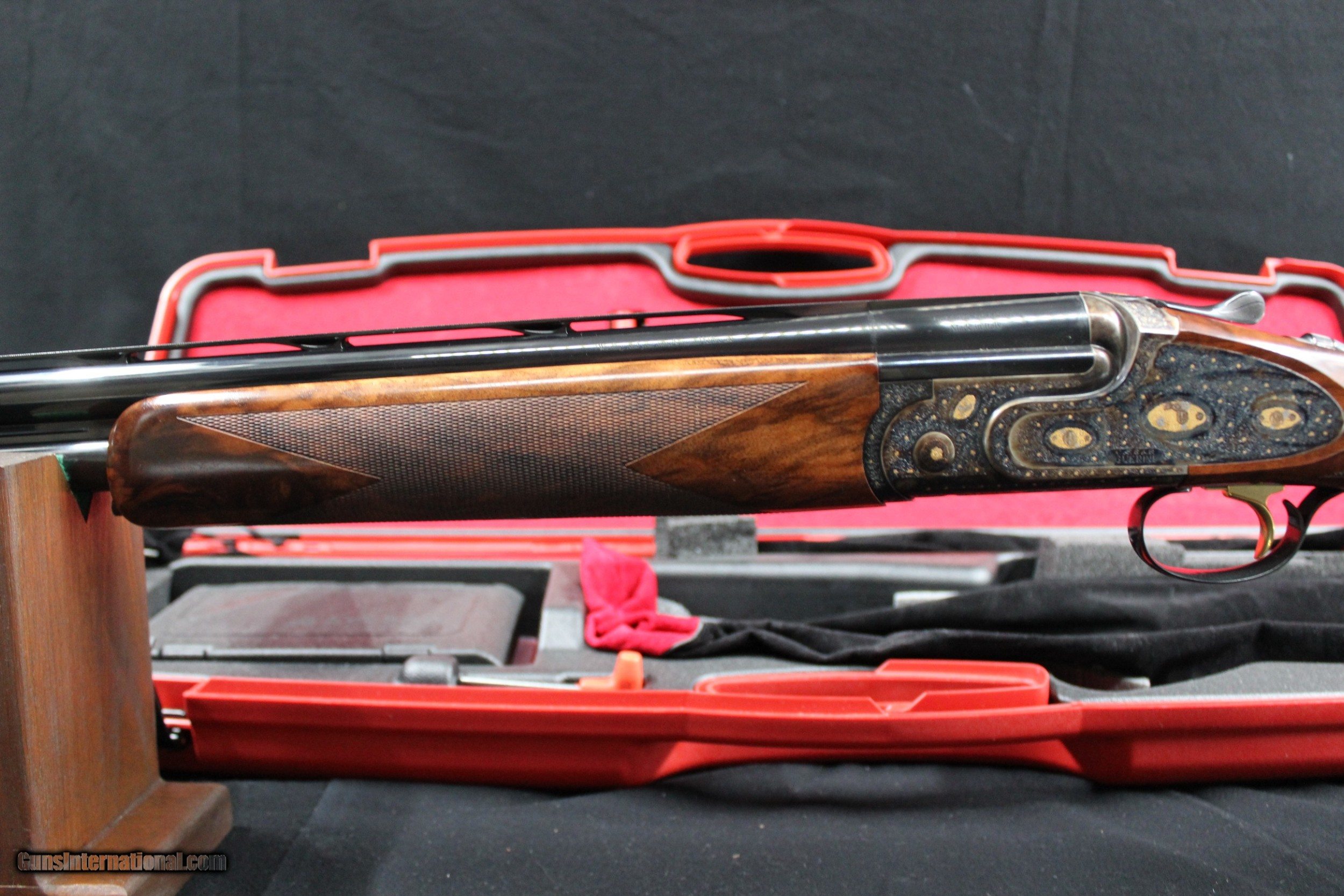 Description: The Essex Limited Gold Sporting features a beautiful case colored receiver contrasted by white, rose and yellow gold subjects framed by English scroll engraving. Enhancing the fine scroll engraving's beauty is an Extra Deluxe grade of Turkish walnut; this one was ordered with upgraded wood and adjustable comb, and a natural oil finish hand rubbed to a stunning sheen. This limited-edition offering is only available at our Caesar Guerini ELITE Dealers, and once it's gone, it's gone. If this beauty is one you seek, you would be wise not to let her pass you by. This shotgun is N.I.B.; Dimensions are as follows: 32"-2 3/4" chambers, WT: 8LB 5 OZ, DIM: 14 3/4"x1 1/2"x2 3/4 SOLD Shotgun Gauge: 12 Gauge |
