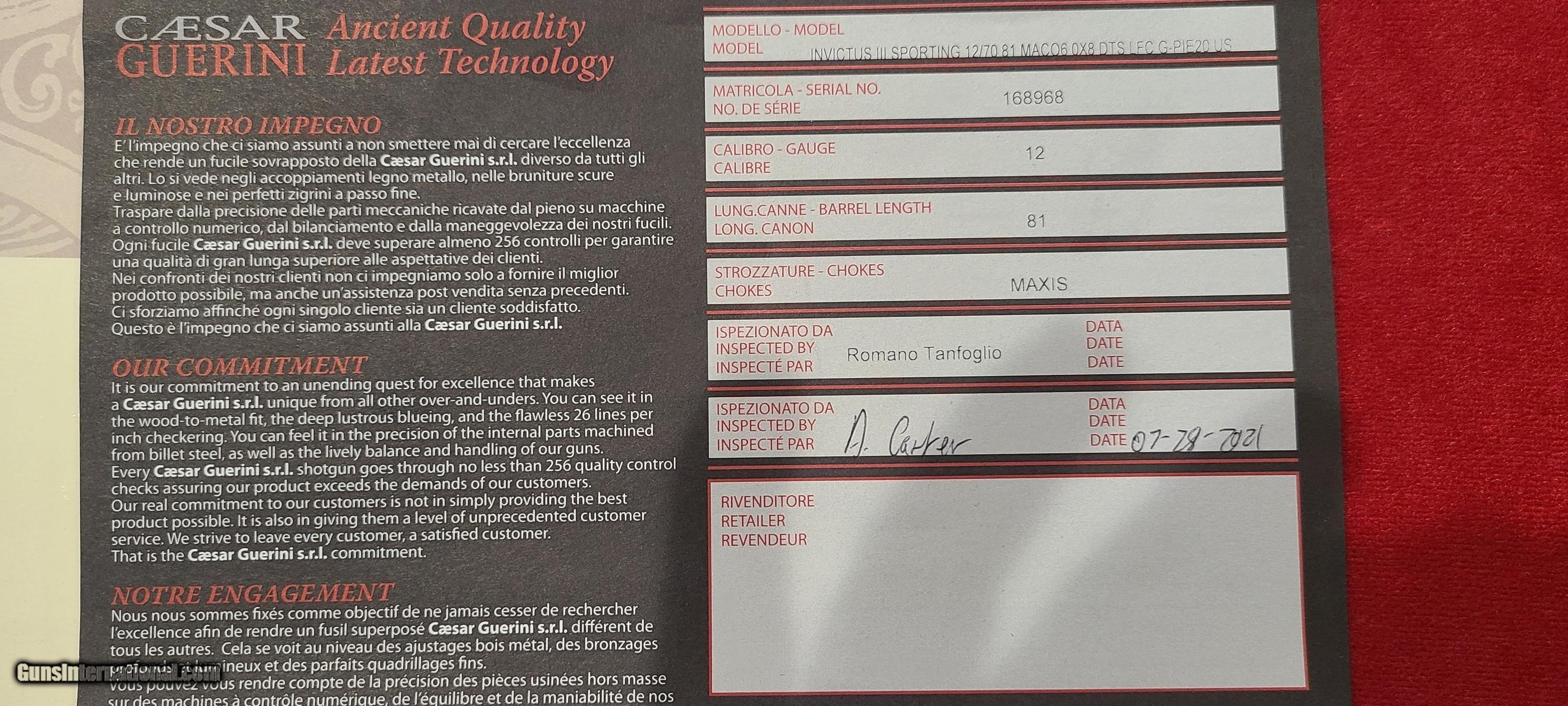 Description: Caesar Guerini Invictus III Sporting 12/70 81 RH Adjustable Comb 32" Barrel, Sporting Rib LOP 14.75" Adjustable Trigger Original Owner Serial Number 168968 Comes with ALL original paperwork. Original Hard case and accessories. Soft Case and 1/2 sleeves. SET OF 8 GUERINI MAXISCHOKE COMPETITION CHOKES: C /C / S / S / IC / IC / LM / M (INCLUDED) OPTIONAL Set of 8 Rhino Chokes: ICY / 007 / LTM / 017 / MOD / 022 / IMD / FULL (Additional $800 for the Rhino Chokes) I just had it serviced about 4 months ago. Wood is beautiful, I had it sprayed. The ONLY reason I am selling it is because I purchased the Invitus IX. Purchase Price: $6795 Plus Buyer Pays Shipping of $75.00 I will Ship From My FFL to your FFL ONLY If you would like verification of the condition of the CG Invictus III, you can call South Florida Shooting Club in Palm City, FL where I shoot. I'm there every weekend and the stock maker, Tom Smith can verify the quality of the gun and the condition. Call or text (best) if you have any questions: Chris 561.202.5395 (Also Accept Payment by Bank Check, Bank Wire Transfer, plus other more options, just ask). SOLD Shotgun Gauge: 12 Gauge Manufacturer: Caesar Guerini Model: Invictus III Sporting Serial Number: 168968 Barrel Length: 32 Ejectors: excellent Condition: excellent Metal Condition: excellent Wood Condition: excellent Bore Condition: excellent Barrels: excellent |