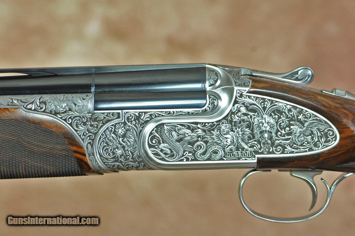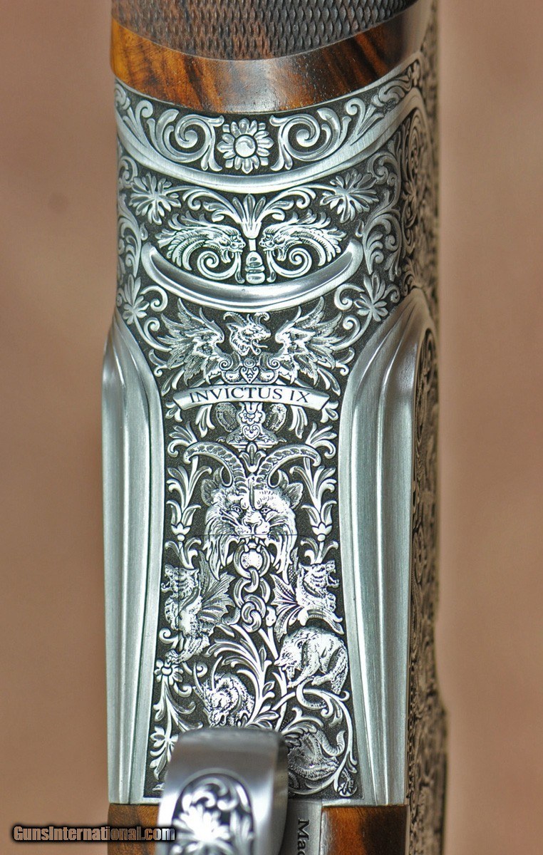 Description: New Caesar Guerini Invictus IX Sporting 12ga. Features factory extended choke tube 32" barrels with flat sporting rib. Side plate receiver featuring deep scroll engraving patterns with mythic creatures with long tang and Boss style forend iron hand engraved by Italian master engravers at Bottega Giovanelli. Outstanding right handed Sporting stock with adjustable comb and Round forend. Comes in factory case. SOLD Shotgun Gauge: 12 Gauge |