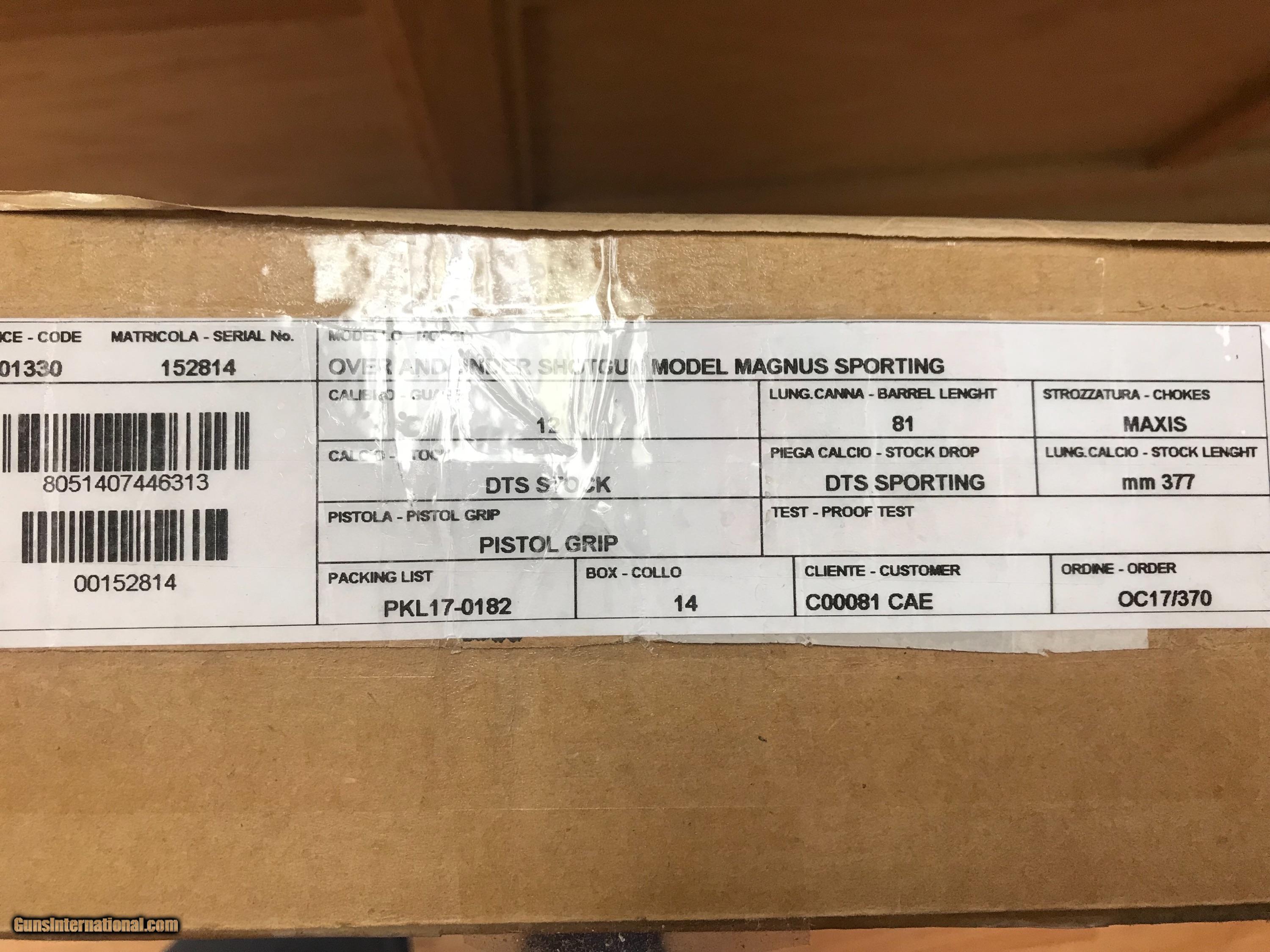 Description: Up for is a New Carsar Guerini Magnus Sporting. This fine target gun Is chambered in 12 Ga and sports 32-inch barrels. The stock is the upgraded DTS Stock. The wood is outstanding and pictures cant do it justice. The MAP price for this Caesar is $5,980.00. Caesar Guerini has strict MAP pricing guide lines that as an authorized dealer we must fallow. Please Call 570-733-2042 for the lowest delivered price. The specs are listed below. Thanks for looking. Model Magnus Sporting Gauge 12 Barrel length 32" (81cm), Avg. Weight** 7lbs. 14oz., Receiver finish Hand polished coin finish with Invisalloy™ protective finish Hand polished coin finish with Invisalloy™ protective finish Hand polished coin finish with Invisalloy™ protective finish Stock Finish Hand rubbed oil Checkering 26 lines per inch Recoil Pad Black rubber Chamber 2 3/4" Top Rib Width 10mm (.4") parallel and ventilated Rib Height* 6mm Center Rib Ventilated Forcing Cones 5" DuoCon Avg. Barrel Weight 32"-1.52kg (3.35lbs.) Avg. Bore .735, Chrome lined Chokes 6 MAXIS competition chokes Sight(s) White Bradley style front Silver center bead Fore-end Schnabel S Trigger New DTS trigger system with two trigger pull weight options, take up, over travel and length of pull adjustments. Factory selective release triggers available in single and double release for 12g. New DTS trigger system with two trigger pull weight options, take up, over travel and length of pull adjustments. New DTS trigger system with two trigger pull weight options, take up, over travel and length of pull adjustments. Safety Manual Accessories Stock and trigger wrench, choke case, friction choke wrench Case Plastic hard case with fit interior and velvet stock sleeve and barrel sleeve Model Magnus Sporting 12 All Measurements are subject to change without notice and are based on average measurements. *Measured from the center of trigger adjustment. Drop at comb 1.5" 1.5" 1.5" Drop at heel 2.25" 2.25" 2.25" Length of pull 14.75" 14.75" 14.75" Cast at heel .12" .12" .12" Cast at toe .2" .2" .2" Pitch 5° 5° 5° Breech to comb 7.75" 7.75" 7.75" Reach *4.25" *4.25" *4.25"MSRP PRICING Item Description MSRP *Pricing is subject to change. If your desired configuration is not listed, please contact your dealer for a Special Order. **Case Hardened Receiver is by special order only. A23154 Magnus Sporting 12g 32" Barrels $5,595 Additional Charge for Adjustable Comb $385 SOLD |