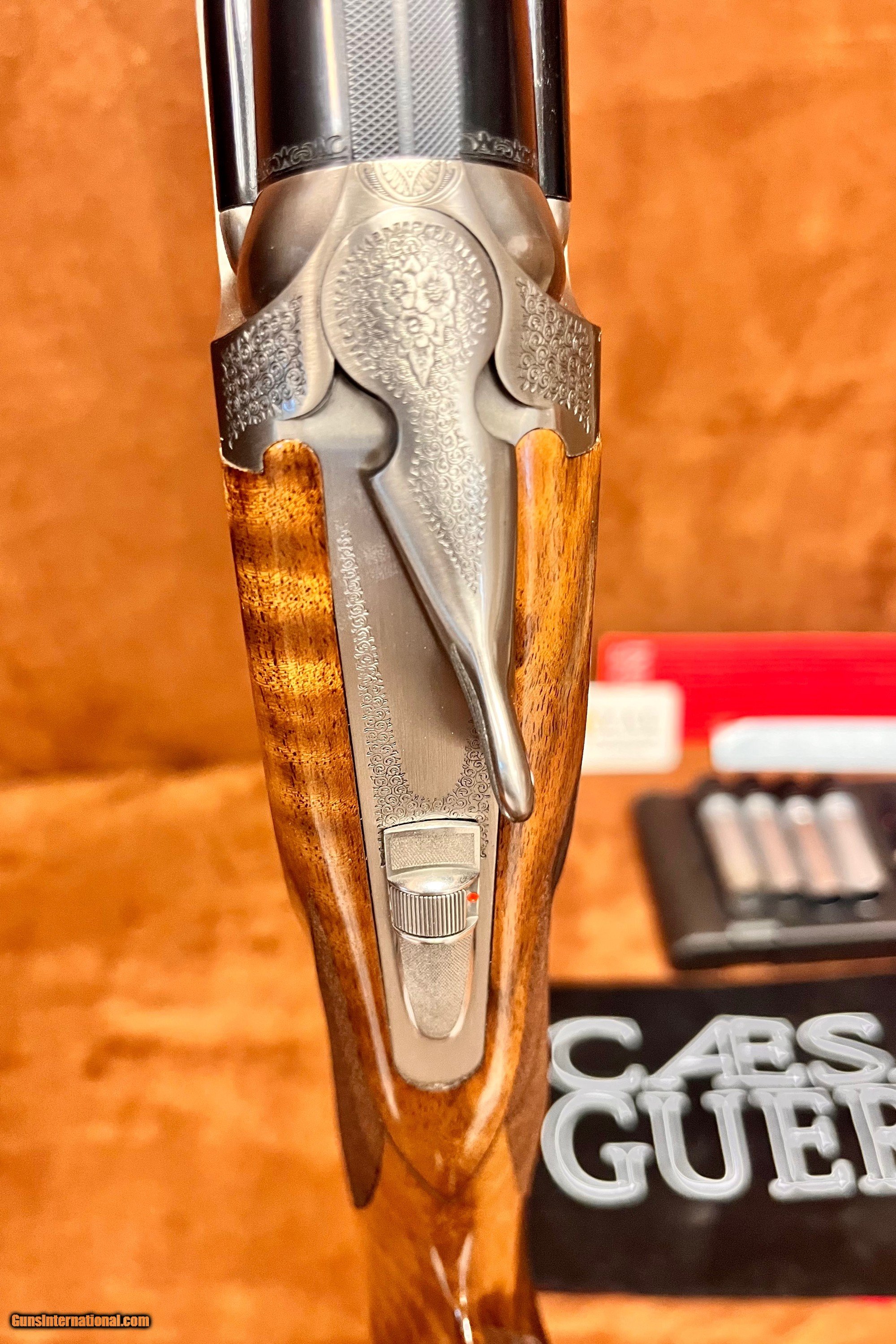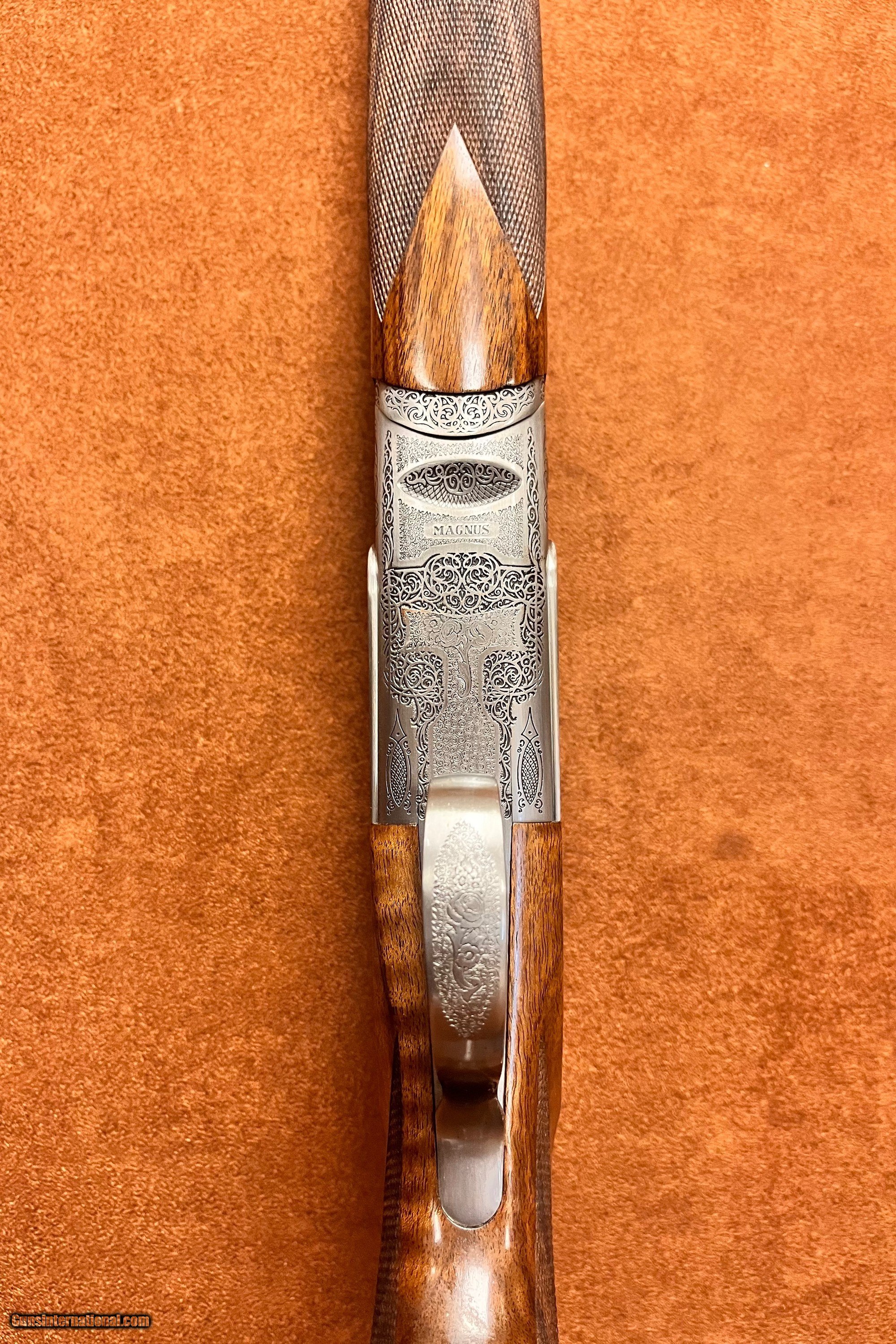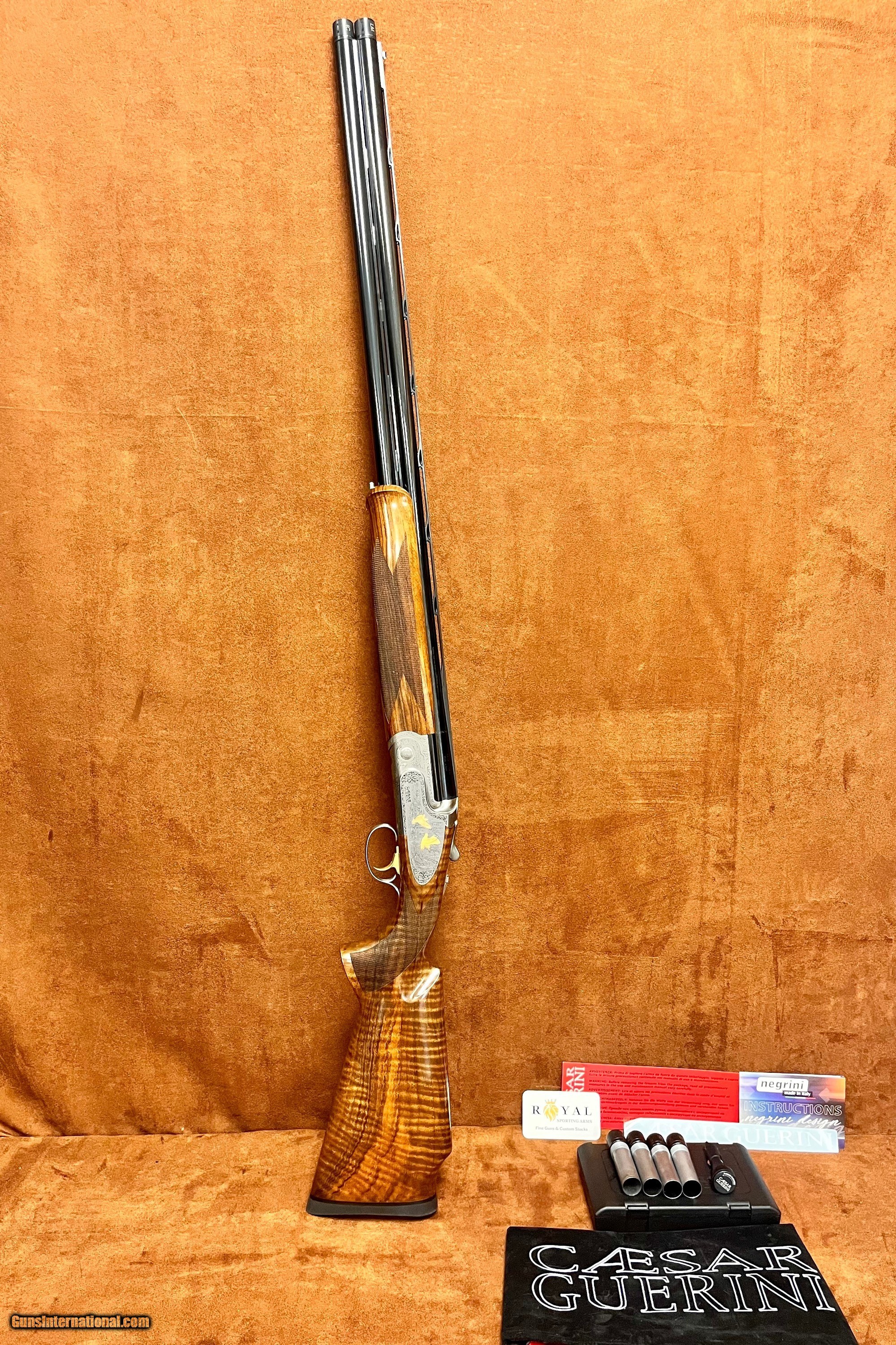 Description: JUST IN AT ROYAL SPORTING ARMS! AS NEW CAESAR GUERINI MAGNUS SPORTING COMPACT 30" Condition: Excellent as new Gauge: 12 Barrel length: 30" (76cm) Avg. Weight: 7lbs. 15oz. Receiver finish: Hand polished coin finish with Invisalloy™ protective finish Stock Finish: Hand rubbed oil Checkering: 26 lines per inch Recoil Pad: Black rubber Chamber: 2 3/4" Top Rib: Width 10mm to 8mm Tapered Rib Heigh:*6mm Center Rib: Ventilated Forcing Cones:5" DuoCon Avg. Barrel Weight: 30"-1.49kg (3.28lbs.) Avg. Bore .735, Chrome lined Chokes: 6 MAXIS competition chokes Sight(s): White Bradley style front Silver center bead Fore-end: Schnabel Trigger: pull/pull selectable Safety: Manual (Automatic as an option) Accessories:Stock and trigger wrench, choke case, friction choke wrench Case :Plastic hard case with fit interior and velvet stock sleeve and barrel sleeve Overall length of gun w/ chokes: 47.25” (30” barrels) Stock Specifications: Drop at comb: 1.37" Drop at heel: 2.5" Length of pull: 13.9" Cast at heel: 0.25" Cast at toe: 0.5" Pitch: 5° Breech to comb:7.0" Reach*:3.5" (adjustable) This Magnus Sporting Compact Is extremely nimble and dynamic , making absolute puffballs out of clays on the course with complete authority, and with Caesar Guerini pedigree it is sure to last a lifetime of shooting. Call 954-676-0714 to purchase! SOLD Shotgun Gauge: 12 Gauge |