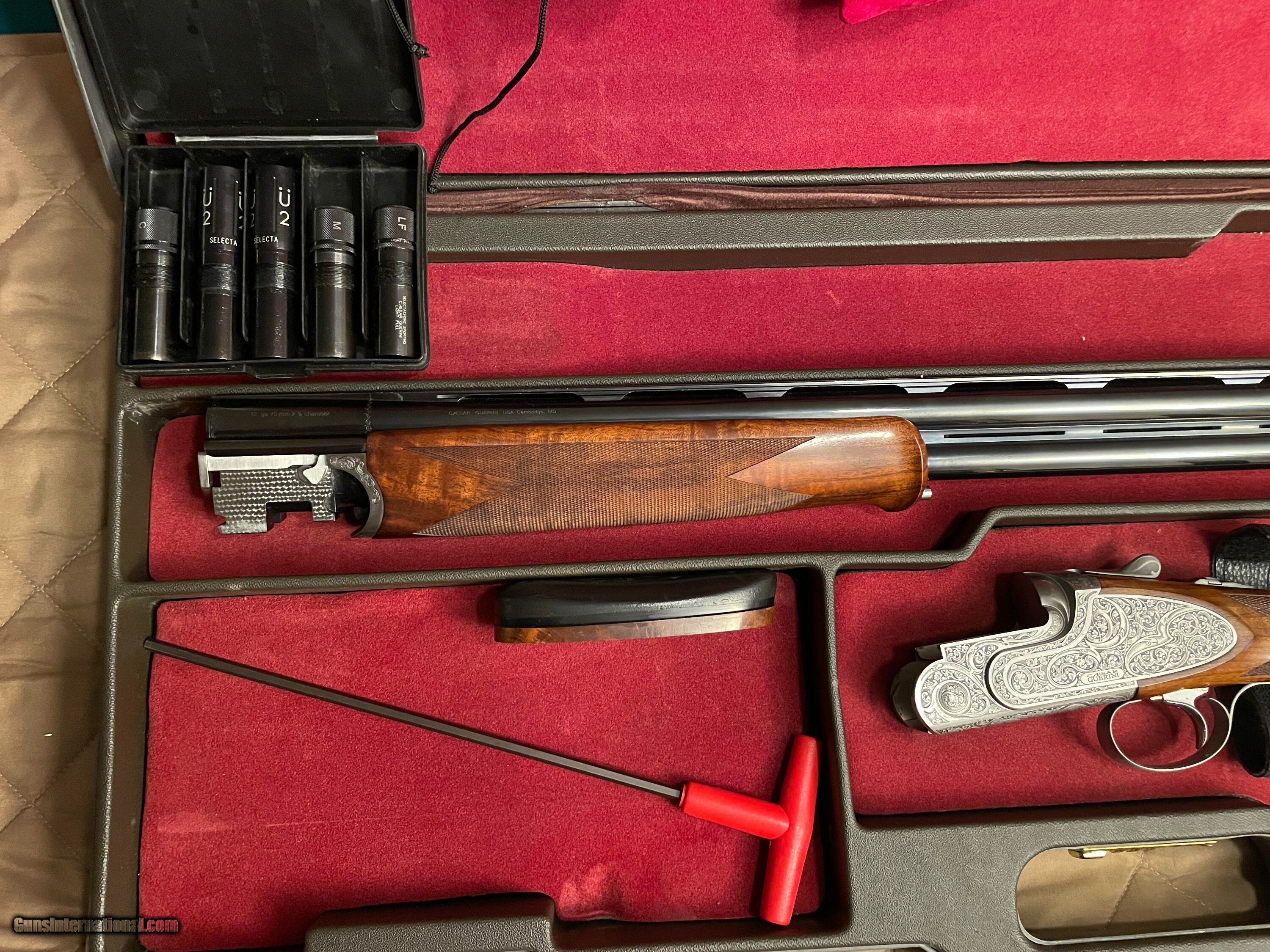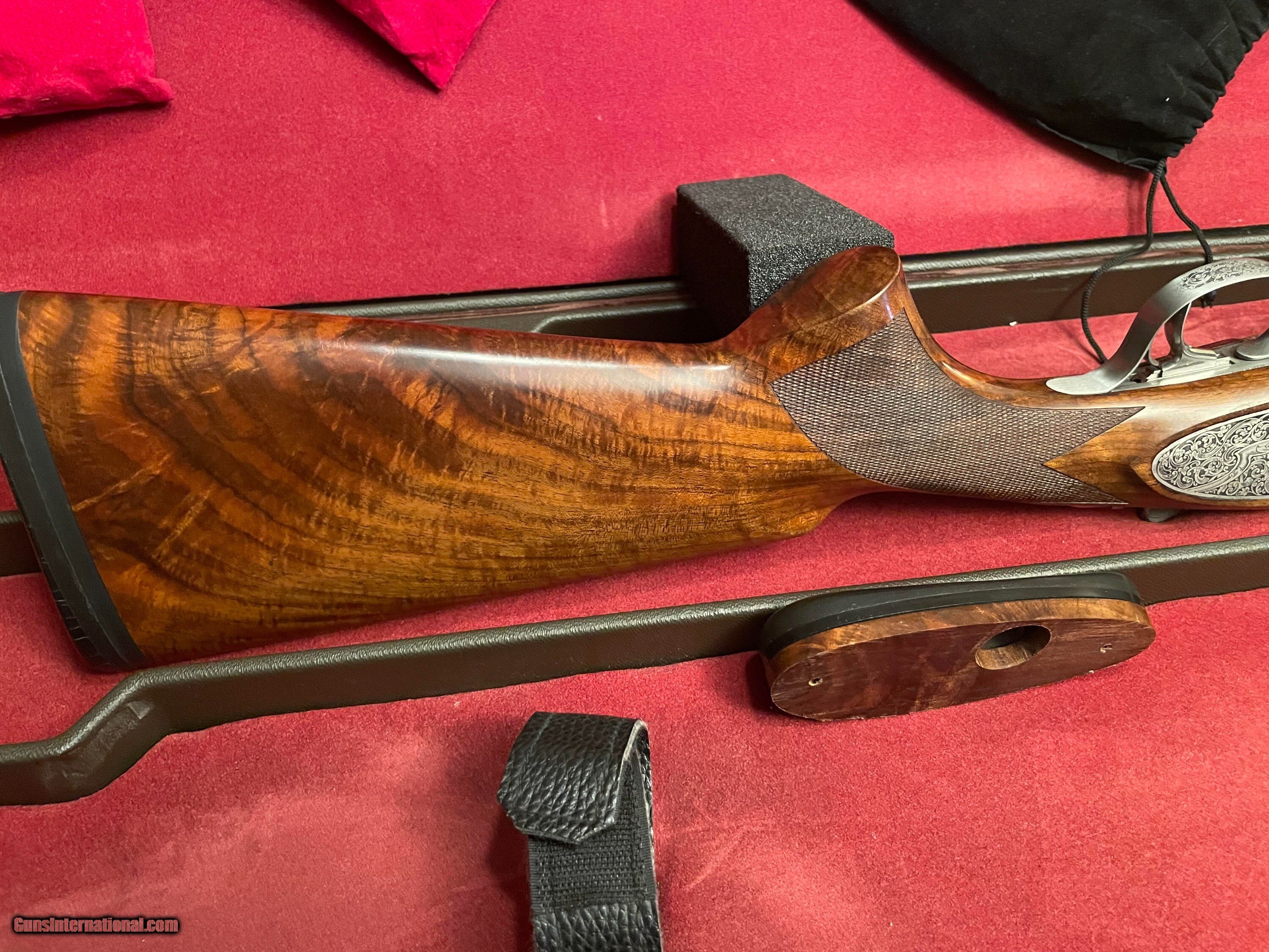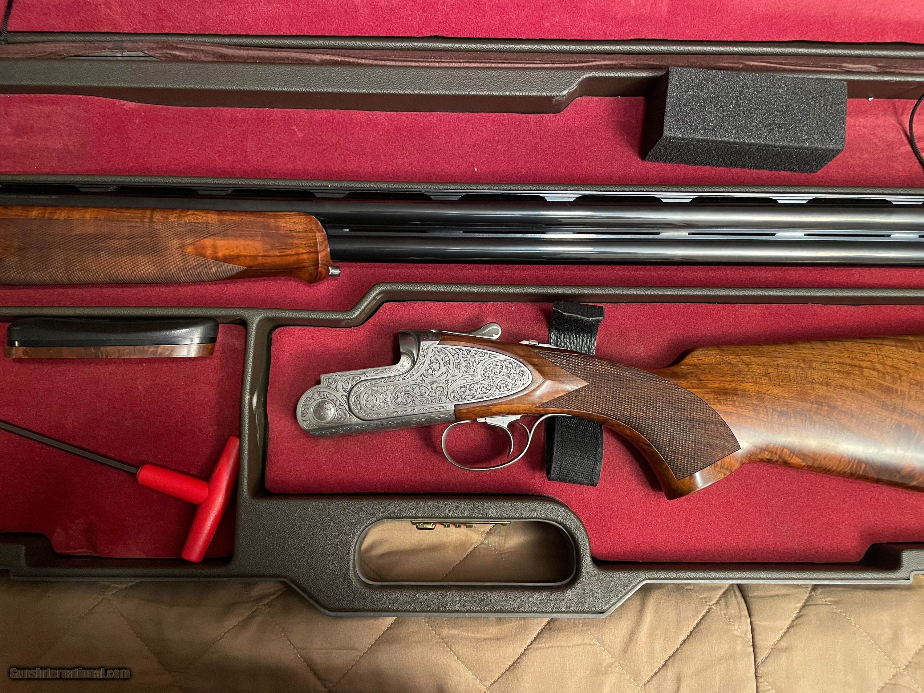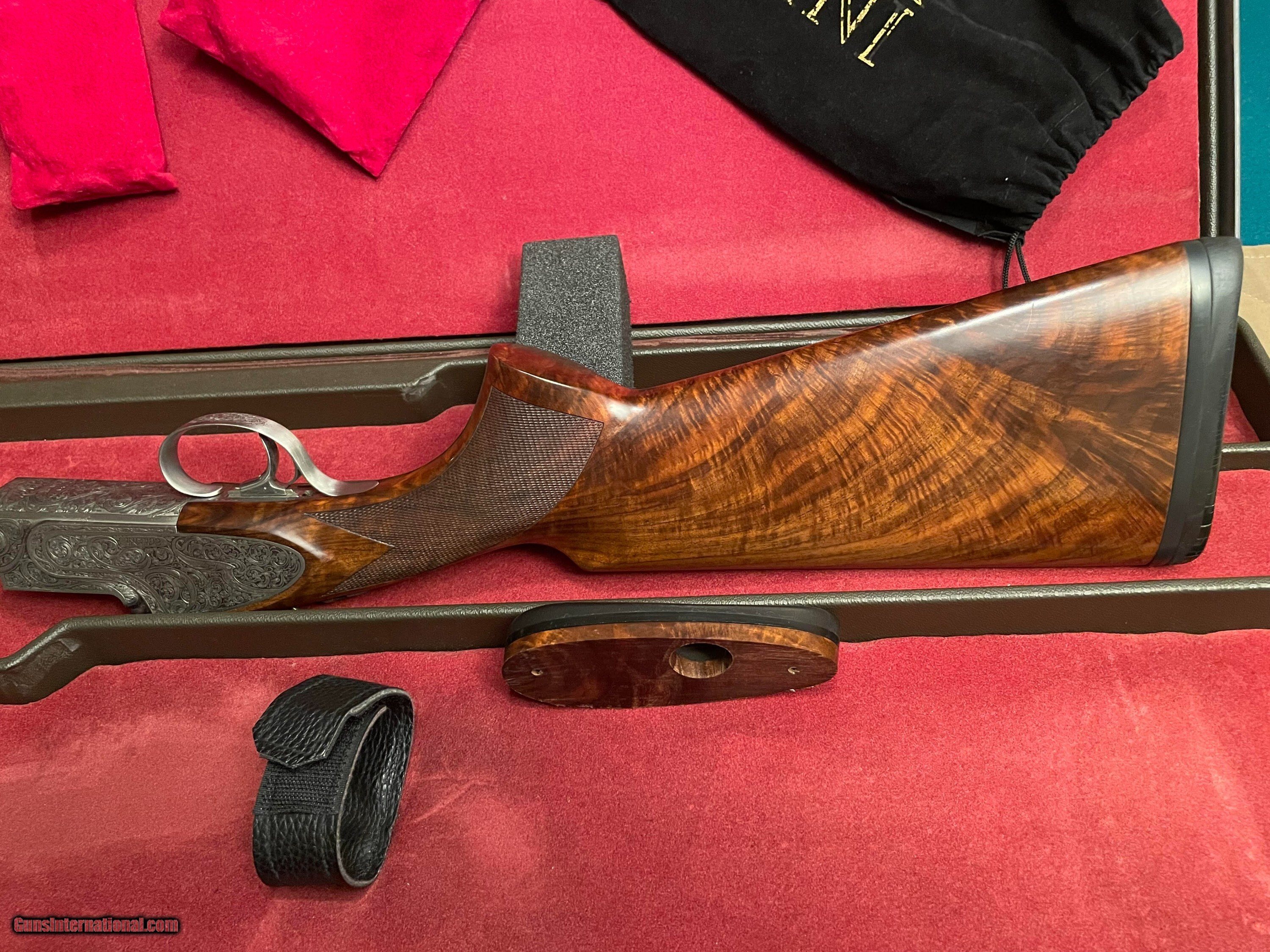 Description: Caesar Guerini MAXUM Sporter with 32" barrels. 12 gauge. Manufactured in 2005. Only the slightest handling marks on wood and metal. Estimate 98% or better. Excellent like new condition. Well maintained by Caesar Guerini services. Defies its age. Bores are shiny and bright. Great looking wood. Non adjustable comb. 14.5" LOP as is. Extra Caesar Guerini recoil pad and a 1/4" original wood spacer are included to reach original 14.75 LOP if desired. Includes Caesar Guerini hard case, stock wrench, and FIVE factory chokes, plus TWO additional Muller U2 aftermarket chokes. C,SK,IC,U2,U2,M,LF. The bores are original .725, a European standard (including Perazzi, etc.). The chokes are the corresponding Seletachokes, including the two Muller chokes. Later imports moved to the 18.6 or .735 bores common in the U.S. and those became the Maxis chokes. I can't tell the difference from this gun and my 18.6 Krieghoff or my 18.6 bore CG Invictus III guns in recoil or patterns. Lastly, this is a highly engraved side plated receiver. More wood is removed to allow for the side plate metal. This gun has been reinforced and serviced by Caesar Guerini, so the stock is stabil. This gem is a looker and gets noticed. Shoots great too! Shotgun Gauge: 12 Gauge Manufacturer: CAESAR GUERINI Model: MAXUM SPORTING Serial Number: 106770 Barrel Length: 32 Bore Info: .725 Chambers: 2.75 Ejectors: YES Condition: EXCELLENT Metal Condition: EXCELLENT Wood Condition: EXCELLENT Bore Condition: EXCELLENT Barrels: GLOSS BLUE Barrel Type: FLAT SPORTING Action: OU Triggers: SINGLE SELECTIVE Stock: SPORTING Stock Dimensions: FACTORY Stock Drop: FACTORY Stock Comb: NON ADJUSTABLE Stock Heel: FACTORY Stock Cast: RIGHT HAND Fore End: SPORTING Butt Pad: FACTORY LOP: 14.5 Rib: FLAT Finish: FACTORY OIL Weight: 8 lbs 2 oz Sights: DOUBLE BEAD Manufacture Date: 2005 Chokes: SELECTACHOKES Engraving: MAXUM SIDE PLATE Case: FACTORY HARD CASE Price: $4,900.00 Buy Now Contact Seller |