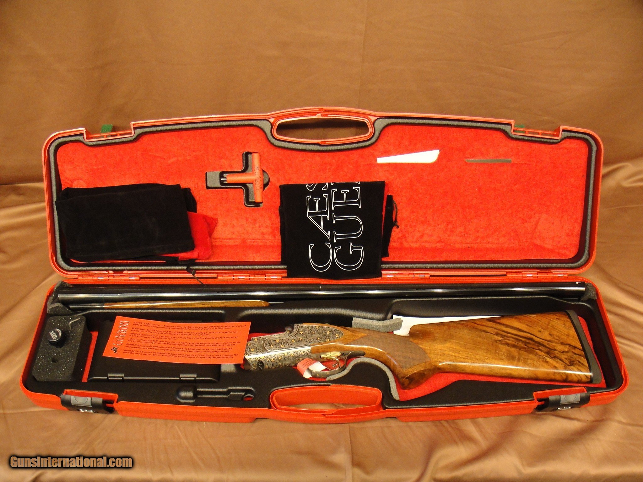 Description: Book #2006 Limited Edition Maxum "Gold" Sporting Factory Description: The Maxum Sporting is truly a stunning over/under shotgun. The deep relief gothic scroll hand finished engraving on the receiver, side plates, and fore-end assembly make this sporting gun unique among others on the clays course. The handwork and design are from the studios of the world renowned Italian engraving house, Bottega Incisioni C. Giovanelli. The coin finish frame is painstakingly hand polished. Balancing the beauty of the deeply sculpted engraving is a deluxe grade of Turkish walnut, featuring precision cut 26 lines-per-inch checkering and a natural oil finish, hand rubbed to a sheen that enhances the highly figured wood grain. The Maxum Sporting is available in 12, 20 and 28 gauge; 12 gauge models feature the new Maxis Bore/Choke System and are offered in barrels up to 34” for the serious competitor. Combination two-barrel sets in 20/28 gauge and three-barrel 20/28/.410 gauge sets are also available. Condition: new Gauge: 12 Barrel length: 32" (81cm) Avg. Weight: 8lbs. Receiver finish: Hand polished coin finish with Invisalloy™ protective Stock Finish: Hand rubbed oil Checkering: 26 lines per inch Recoil Pad: Black rubber Chamber: 2 3/4" Top Rib: Width 10mm (.4") parallel and ventilated Rib Height: 6mm Center Rib: Ventilated Forcing Cones: 5" DuoCon Avg. Barrel Weight: 32"-1.52kg (3.35lbs.) Avg. Bore: .735 Chrome lined Chokes: 6 MAXIS competition chokes Sight(s): White Bradley style front Silver center bead Fore-end: Schnabel Trigger: New DTS trigger system with two trigger pull weight options, take up, over travel and length of pull adjustments. Factory selective release triggers available in single and double release for 12g Safety: Manual Accessories: Stock and trigger wrench, choke case, friction choke wrench Case: Plastic hard case with fit interior and velvet stock sleeve and barrel sleeve SOLD |
