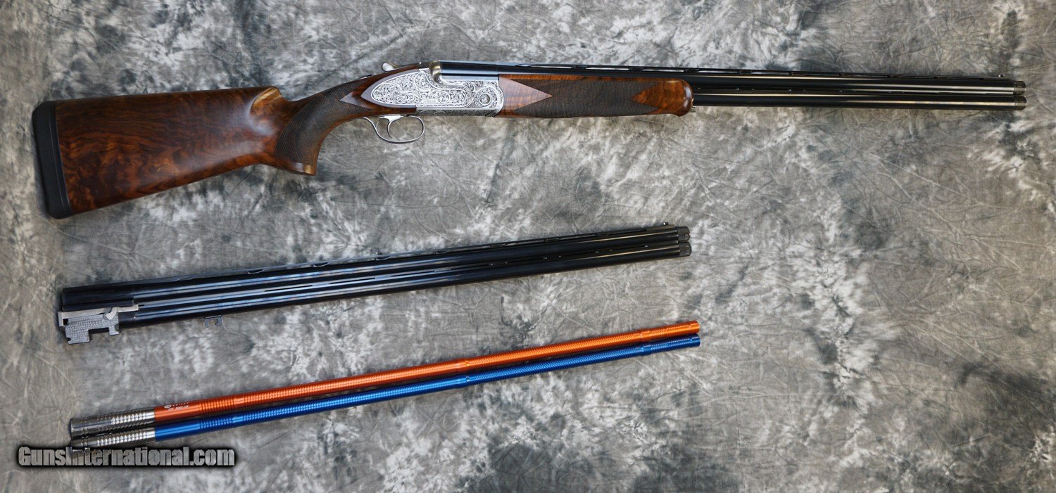 Description: Pre-Owned Caesar Guerini Maxum Sporting 12GA with 32" factory choke tubed barrels, flat tapered sporting rib; additional 30" factory choke tubed flat rib barrels with Briley Ultralight Sub-Gauge Tubes (20GA and 28GA fitted Ultralights). Nitride finished action with full coverage deep scroll engraving, factory pistol grip sporting stock with schnabel forearm. Handling marks and finish wear on stock and forearm, minor checkering wear. Very minor bluing wear on barrels. Includes case, chokes and tools. SOLD Shotgun Gauge: 12 Gauge |