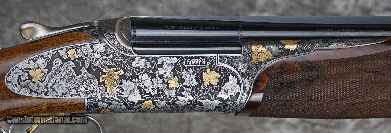 Description: New Caesar Guerini Revenant Game 20GA with 28" factory choke tubed barrels, solid game rib and solid side-ribs. Nitride finished, scaled 20GA action featuring fully engraved sideplates with game scenes, gold inlaid grape leaves and scrolls, Boss style, fully engraved forearm iron with Prince of Wales pistol grip, fully checkered round game forearm. Includes case, chokes and tools. Call 626-633-1002 for pricing. SOLD Shotgun Gauge: 20 Gauge |