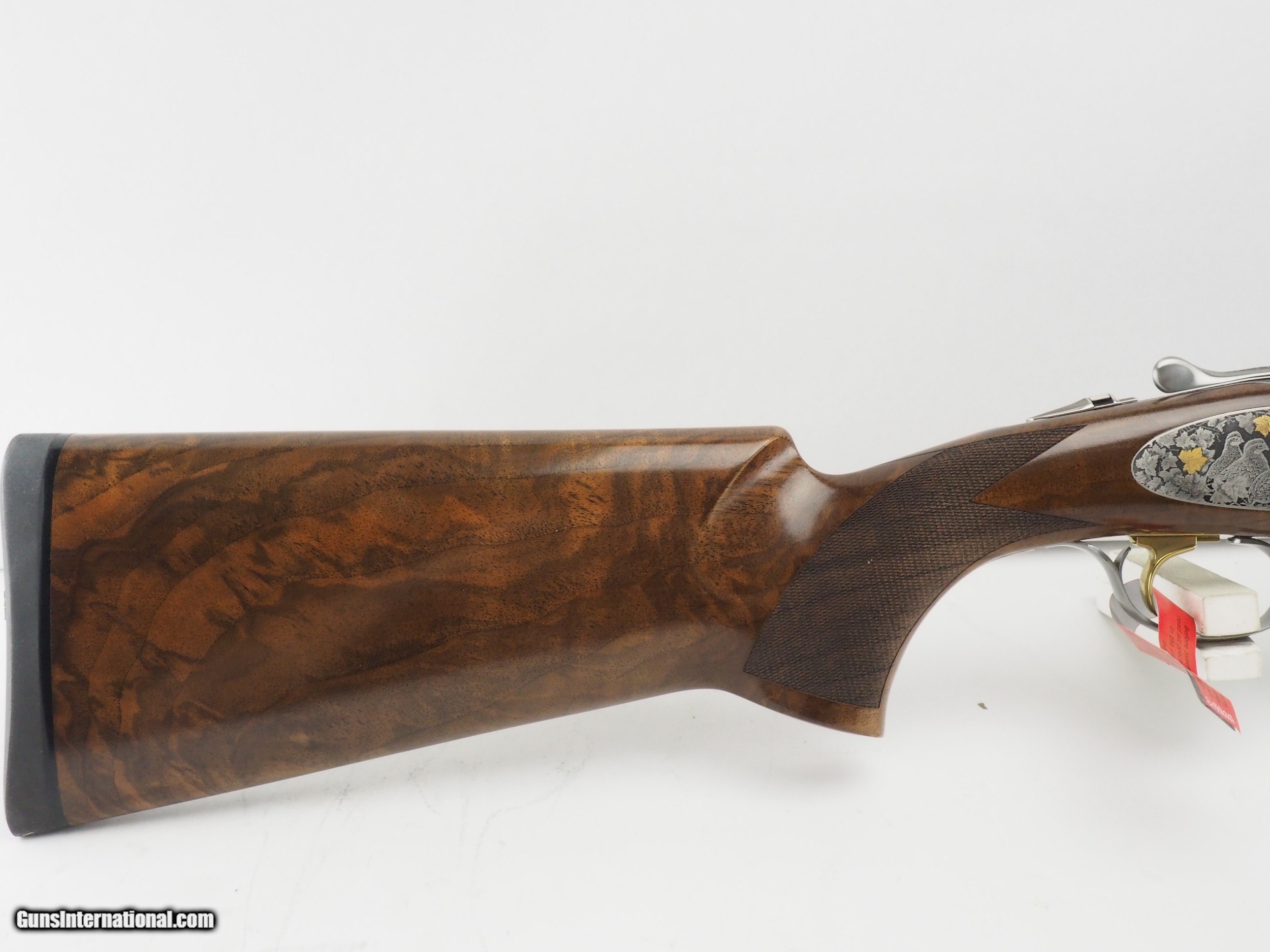 Description: Featured here is the 20 Ga Caesar Guerini Revenant, a true blend of classic style and modern technology. The Revanent is one of the finest examples you will see of mastercraft and artistry. The graceful round body of the receiver not only adds to the overall beauty of this firearm but also adds to the overall balance and feel. The revenant is an absolute perfect example of classic elagance, and style while still envoking the gorgeous gold depicted hunting theme. Whether you are a master of the clays or the avid hunter the revenant is right for you!! Drop at comb:1.5" Drop at heel: 2.25" Length of pull: 14.75" Cast at heel.: 12" Cast at toe.: 3" Pitch: 5° Gauge: 20 Barrel length: 30" (76cm) Avg. Weight: 6lbs. 11oz., Receiver finish: Hand polished coin finish with Invisalloy™ protective finish Stock Finish: Hand rubbed oil Sporting Butt plate Checkering: 26 lines per inch Chamber: 3" Top Rib Width: 8mm to 6mm Tapered Forcing Cones: standard Avg. Bore: .626, Chrome lined Chokes: 6 Selectachokes Price: Call for pricing SOLD |