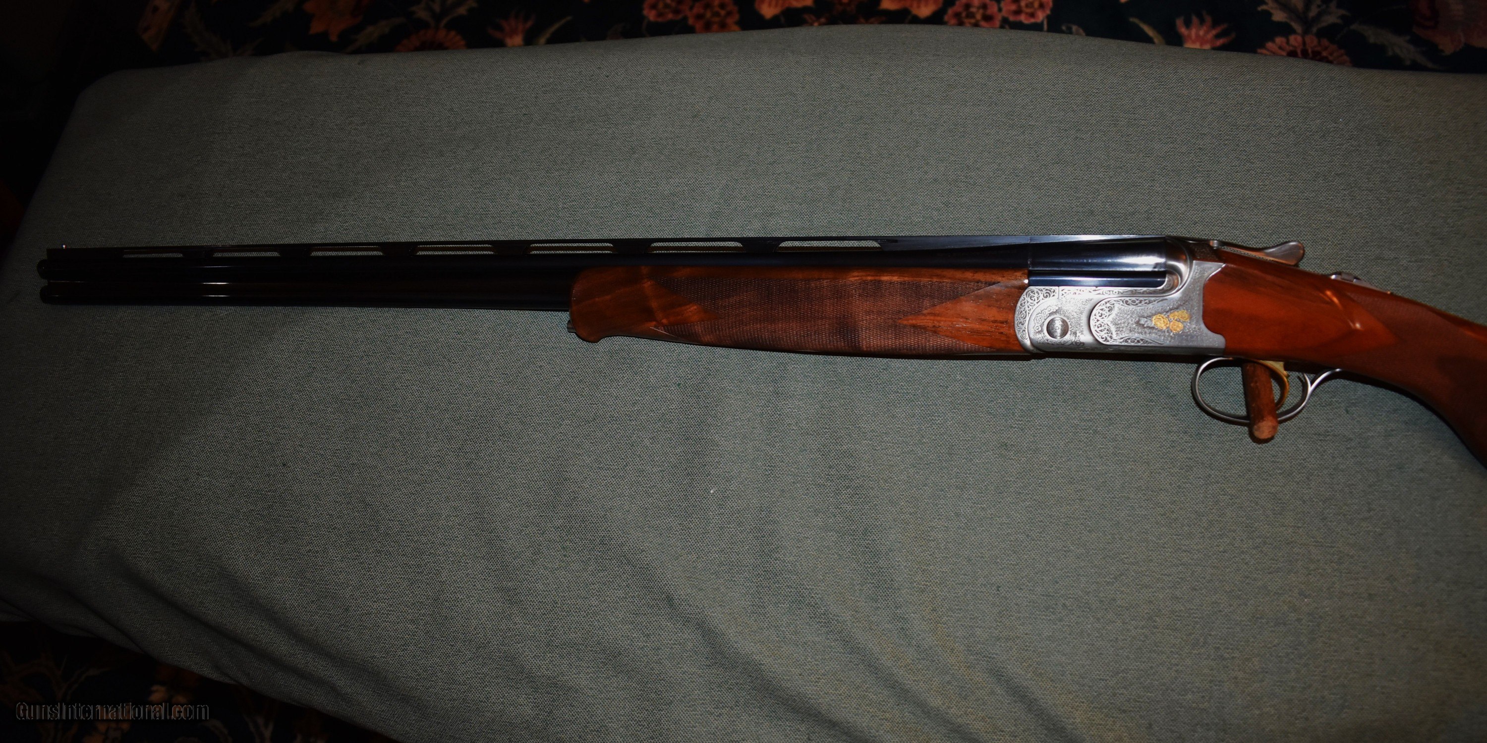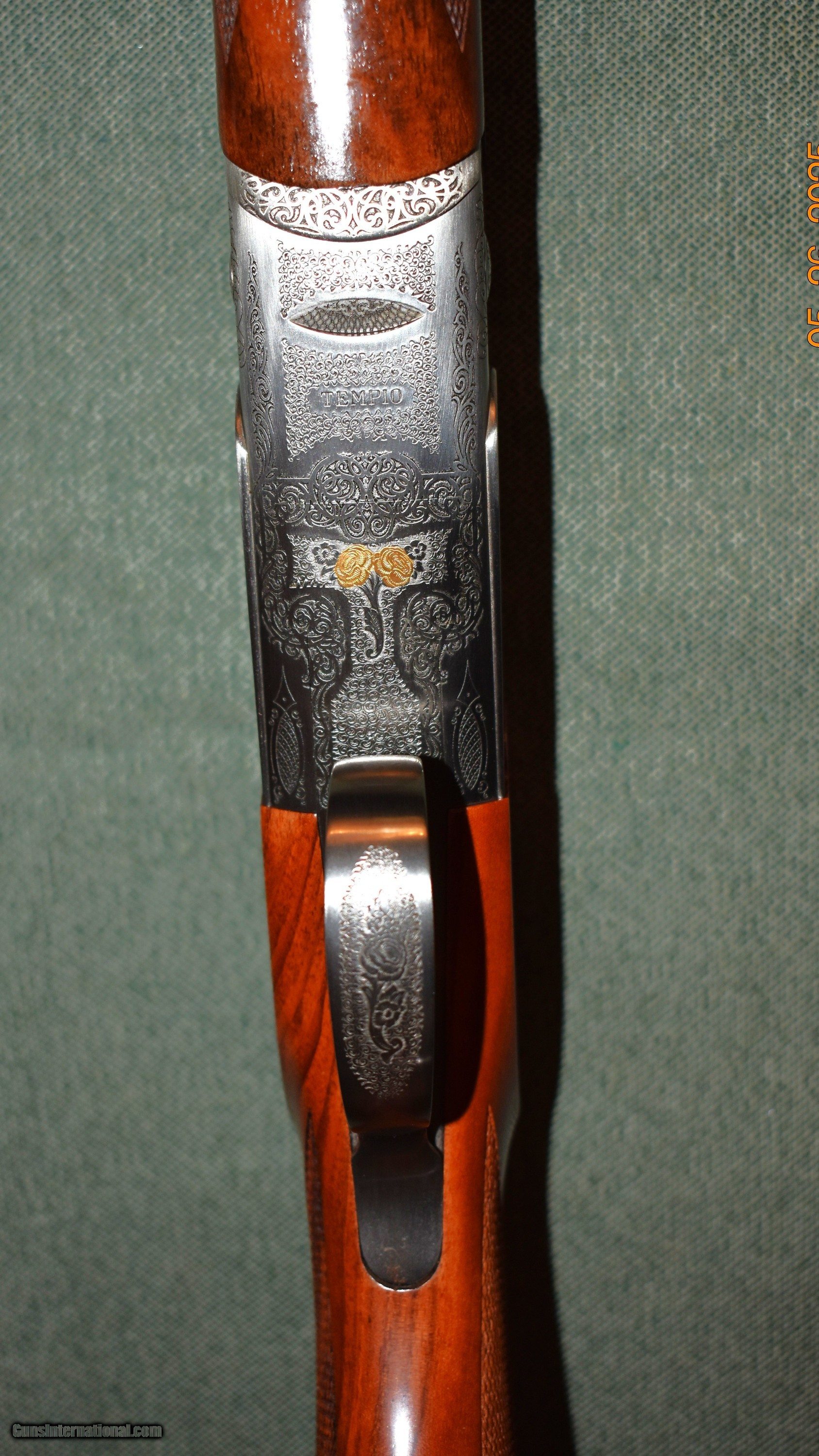 Description: Caesar Guerini Teimpio grade 410 gauge. This beautiful little gun is in like new condition. It has been fired but retains 100% of the wood and metal finishes. It has a coin finished receiver with gold inlaid floral scenes. It has 28" vent rib barrel with Guerini screw in chokes. It comes with 4 extanded chokes and 6 flush chokes. The barrels are chambered for 3" shells. A great little gun for fin clays or preserve bird shooting. It comes in the makers case with manual and gun slips. Price includes shipping to your FFL. SOLD Shotgun Gauge: .410 Gauge Manufacturer: Caesar Guerini Model: Tiempio Serial Number: 144649 Barrel Length: 28 Chambers: 3 Ejectors: Yes Condition: mint Metal Condition: mint Wood Condition: mint Bore Condition: mint Action: Over Under Triggers: Single Selective Butt Pad: factory wood butt Chokes: Guerini chokes Engraving: Game Scene Gold Case: factory case |