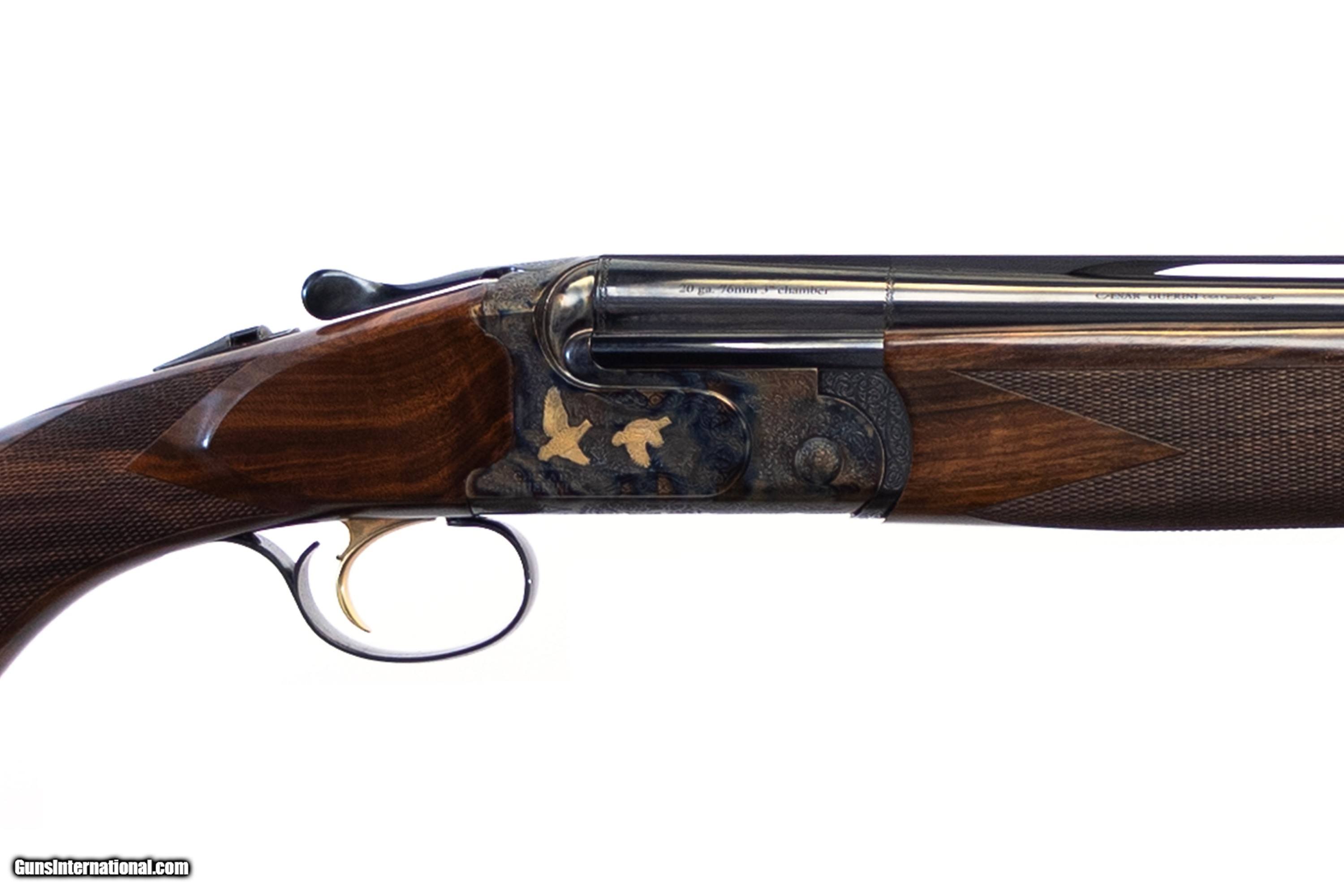 Description: Caesar Guerini Tempio SE Field Shotgun | 20GA 28” | SN: 180779 Previously chosen by the Editors of Field and Stream Magazine as “Best of the Best” in Shotguns, the Tempio is designed to be a sleek and fast pointing shotgun in the field; the perfect companion for upland game hunters. Its low-profile receiver matched with a trim stock, classic Prince-of-Wales grip and Schnabel fore-end make the gun a perfect match for fast game birds. The Tempio SE is a special limited production run version of the popular Tempio field gun that features a unique game scene of Doves in the left action and Bobwhite Quail on the right action with tasteful gold accents. Each Caesar Guerini game gun is carefully engineered to balance near the hinge point, distributing the weight evenly between the hands, which is the secret to a finely crafted shotgun. The Tempio SE also features a deluxe grade of Turkish walnut enhanced with a hand rubbed oil finish. All Caesar Guerini field guns come with a velvet lined lockable hard case and five precision patterned flush chokes (CYL, IC, M, IM, F). A plastic choke case is also included. Cole Gunsmithing is one of the only shotgun dealers in the US that is also a factory authorized service center for the brands we sell. We are authorized to perform gunsmithing services on Beretta, Blaser, Perazzi, Rizzini, and Zoli, shotguns. Being the world’s largest Beretta premium shotgun dealer, with over 40 years of knowledge, superior service, and expertise, we specialize in the repair and customization of fine Shotguns. Not to mention, TSK Professionals. No matter if you choose to buy, service, or customize shotguns from us, you will savor the Cole Experience. We're your one stop shop, and we've been waiting for you! Federal firearms laws do not allow us to ship firearms directly to you. Please contact us for ordering and shipping information. Gauge: 20 GA Barrel Length: 28" Barrel Weight: 1215g Bore Diameter: .735 Chrome Lined Chamber: 3" Chokes: 5 Nickel Plated Flush Rib: 7mm Parallel Vented Stock Dimensions Drop At Nose: 1 ½" Drop At Heel: 2 ¼" Cast: RH Length Of Pull: 14 ¾" Forend Style: Schnabel Comb: Fixed Weight: 6lbs 11oz. Warranty: Limited Lifetime SOLD Shotgun Gauge: 20 Gauge |