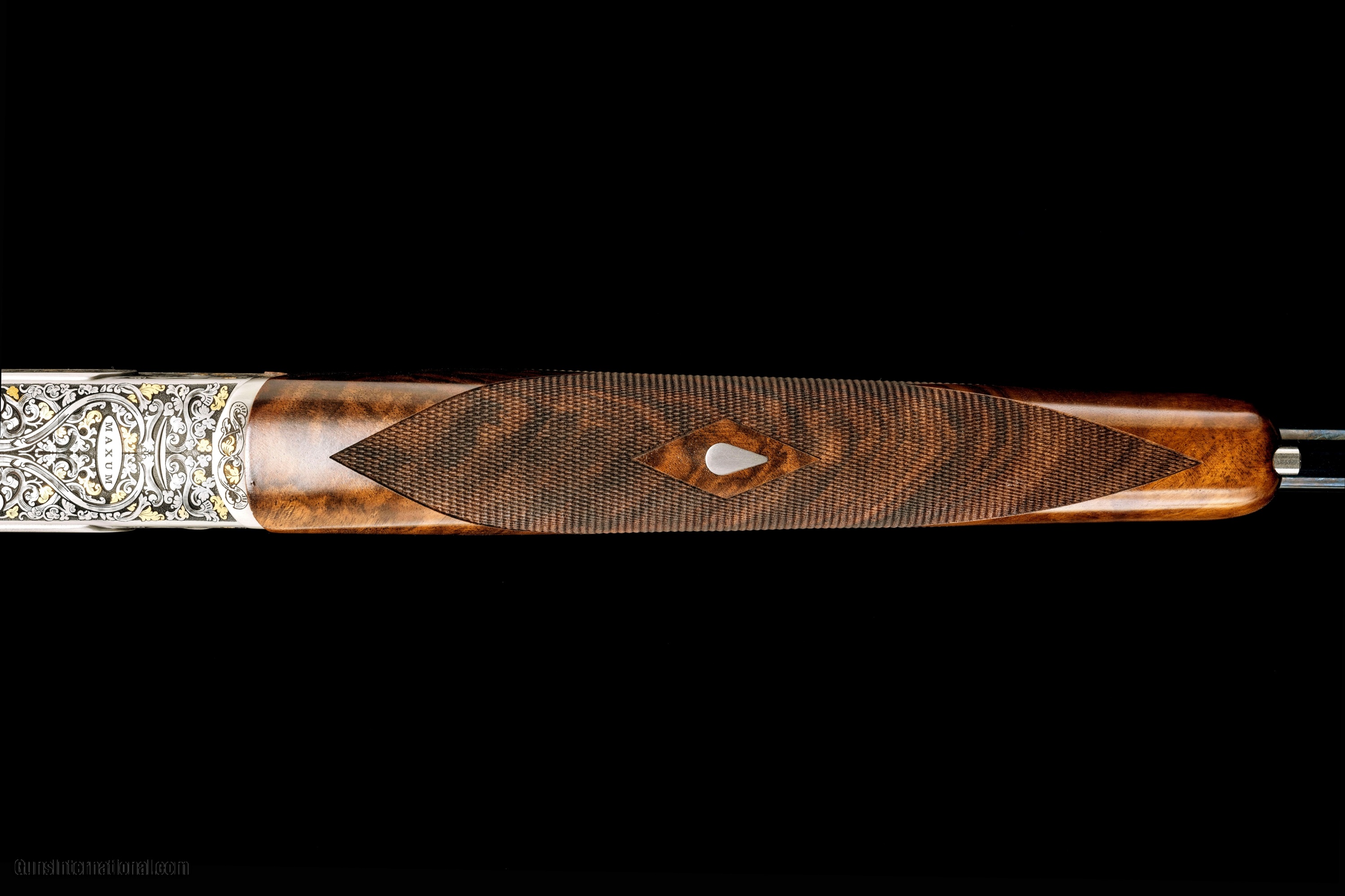Description: The Caesar Guerini Maxum gold in a two barrel set includes a 20ga/28ga. The barrels are 28" and include solid flat matte ribs with both sets of flush interchangeable chokes. The reciever features hand chased engraving with gold flower embelishment. Its a manual safety with a single selective trigger. The stock features a prince of wales style grip and a rounded tapered forearm. SOLD Manufacturer: Caesar Guerini Model: Maxum Caliber Info: 20ga/28ga Barrel Type: Over / Under Gauge Info: 20ga/28ga Weight: 6.11 |