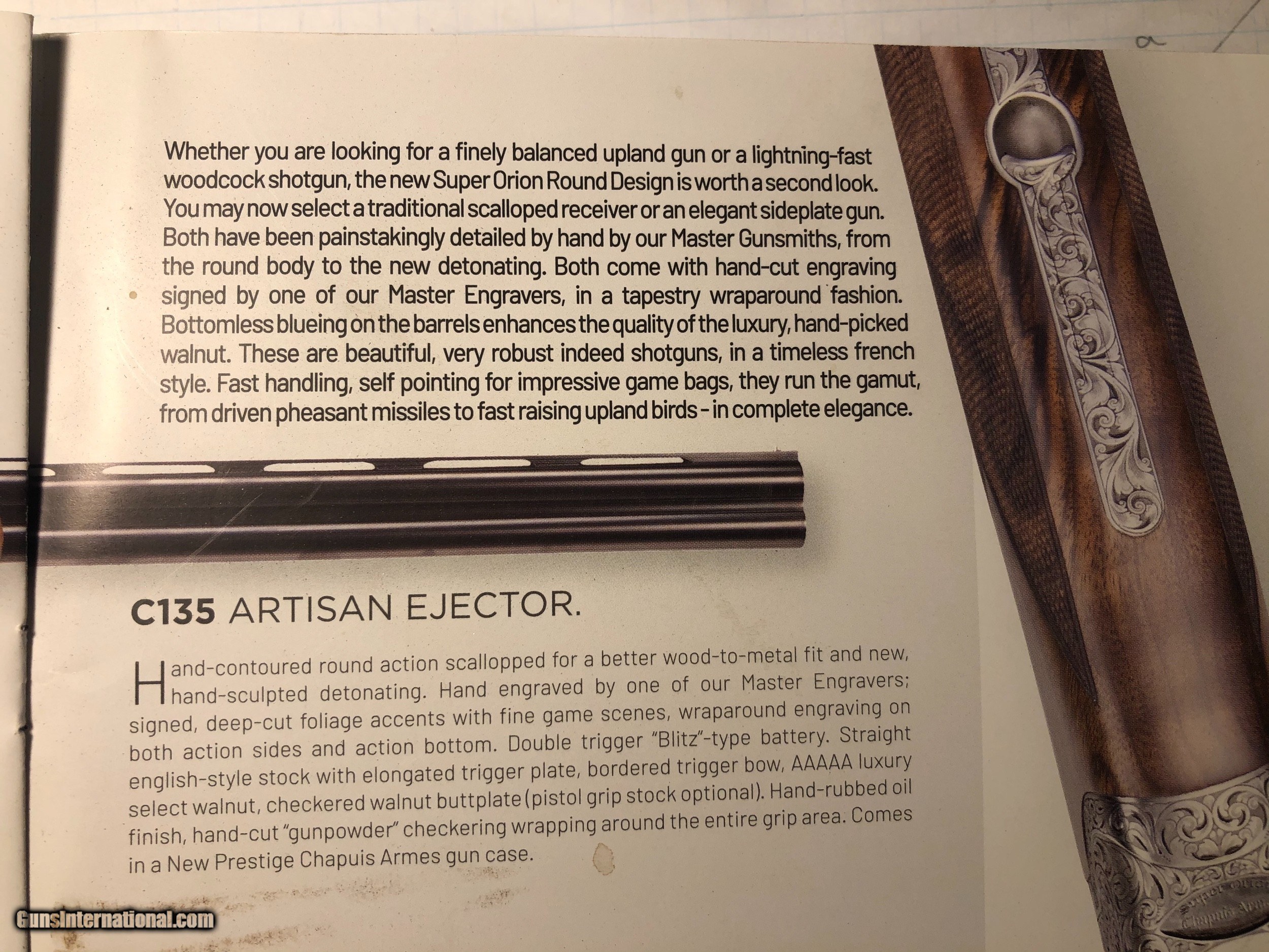 Description: Chapuis Armes 12 gauge C135 Artisan Collection Hand Engraved 12 gauge with two trigger system with Long Tang trigger, fixed chokes Improved Cylinder Top (-.009), Bottom Skeet 1 (-.003) and 27 1/2” barrel length. Dressor pneumatic recoil system with a leather butt plate and Heavy Kick-Ez butt plate; LOP 14.60” or 15.25”. Drop at Comb 1.5” and Drop of Heal (wood) 2.20”. EXCELLENT condition no handling marks a true piece of art and a great shooter. See additional discription from Chapuis Catalog in photos. SOLD Manufacturer: Chapuis Artisan Model: C135 Barrels: 27.5 Gauge Info: 12 |