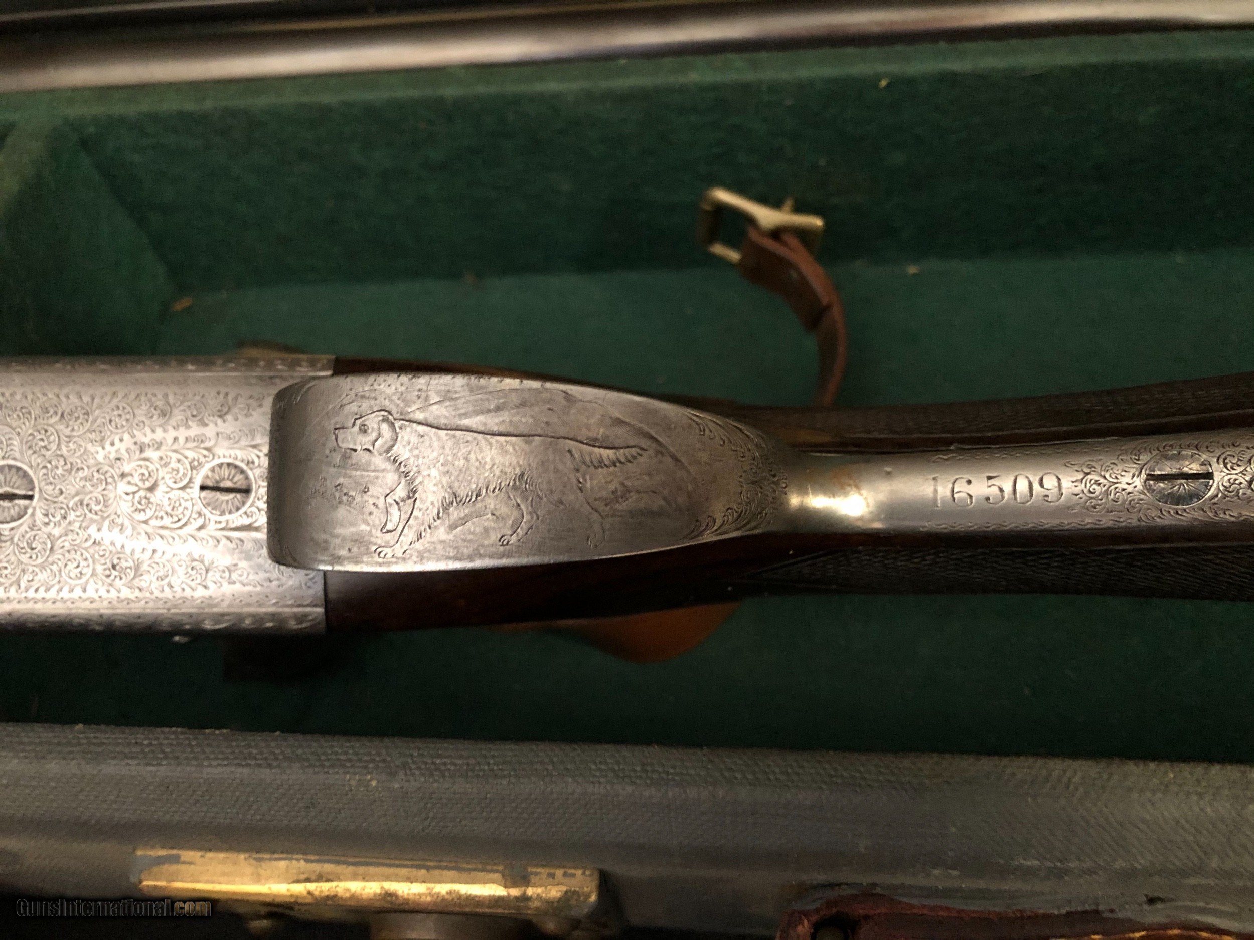Description: Beautifully engraved Charles Bosell made on Anson & Deeley boxlock action with Greener Crossbolt. This gun was fabulous carved fences and made with Anson type push button forend release. Action is profusely engraved as seen in the photos in game scene and scroll. Beatufiully checkered side panels and wrist checkering with fancy figured buttstock that terminates with a lined hard rubber buttplate. Gun made with double triggers, extractors, round knob pistol grip buttstock. "SAFE" in gold above safety. Barrels have been sleeved and nitro proved for heavy proof. 3 in chambers. Mechanics are crisp. Bores are excellent. This gun is priced at $3495 plus shipping to your FFL. Please dont hesitate to contact me with any questions or reasonable offers at (704) 280-2382 or via PM on this site. SOLD Curio/Relic: Yes Shotgun Gauge: 12 Gauge Manufacturer: Charles Boswell Model: Deluxe Boxlock Serial Number: 16509 Barrel Length: 30 Chambers: 3 Ejectors: Extractors Condition: Excellent Metal Condition: Excellent Wood Condition: Excellent Bore Condition: Bright and shiny Triggers: Double Triggers Stock Comb: 1-1/2 Stock Heel: 2 Fore End: Splinter Forend Butt Pad: Lined HRBP LOP: 14-1/2 Weight: 7lbs 13oz Choke Left: .727 with .039 choke Choke Right: .728 with .031 Proof:Nitro: Yes - heavy proof Minimum Wall Thickness Left: .034 Minimum Wall Thickness Right: .034 |