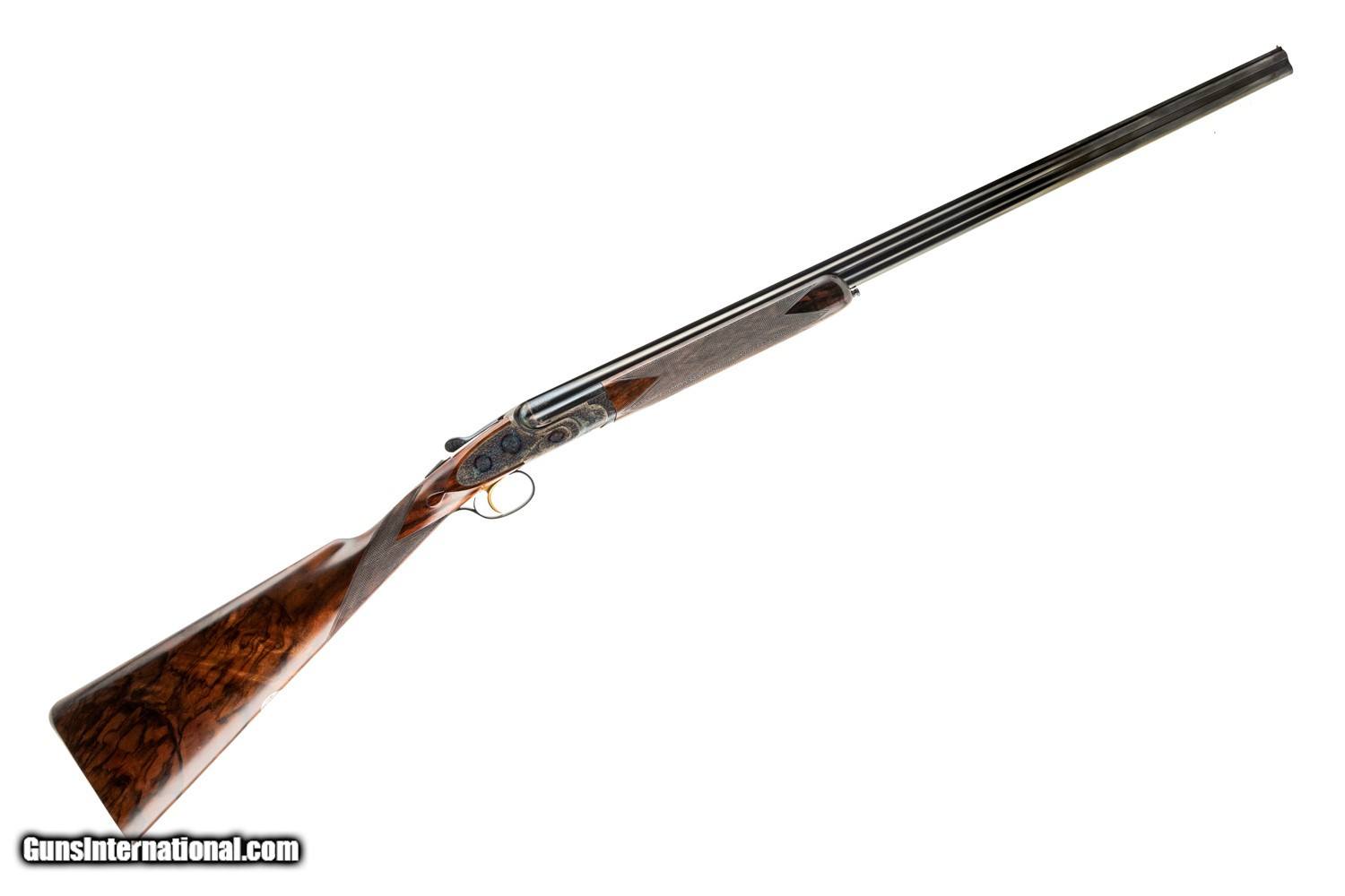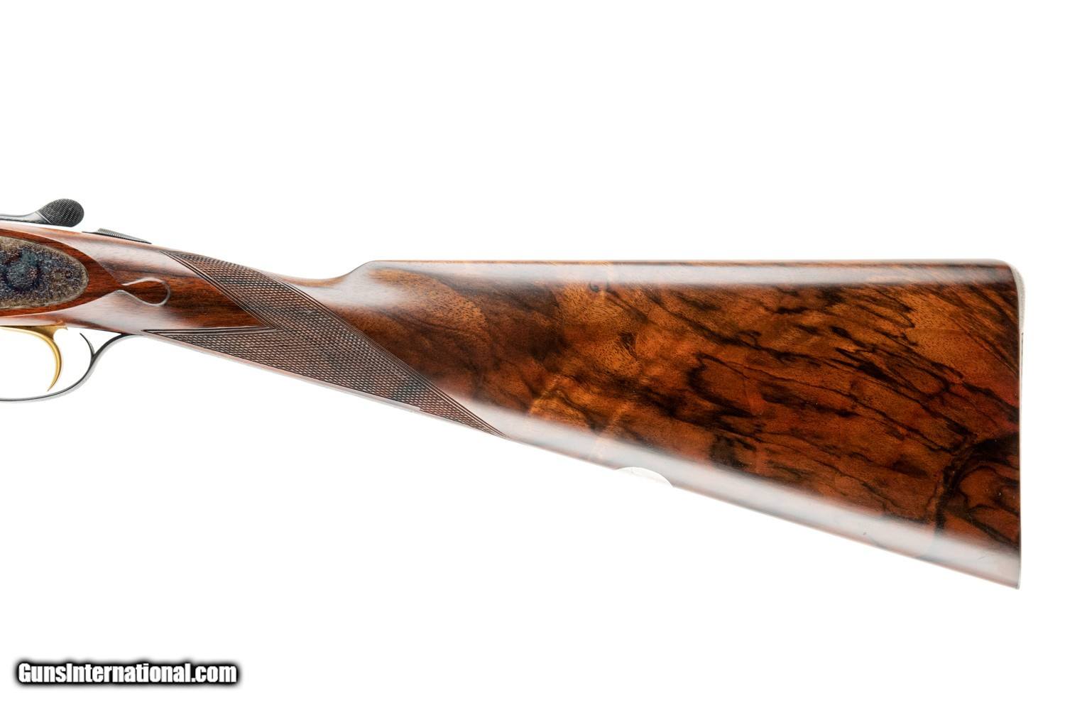 Description: 30 1/4" solid rib barrels full and full 3" chambers single trigger ejectors field forearm english grip 5lbs 11 oz 2 1/4 dah 1 7/16 dac 14 7/8 lop (2007) Chris Batha obtained the rights to the Charles Boswell name in 2004, and makes bespoke best quality guns under this name, with prices starting at $85,000.00. This beautifully filed, fitted, and finished creation of functional art by many Purdey and Holland trained gunmakers (Gerry Swanson, finisher) would certainly be well in excess of that number. This gun has 30 - 1/4" demi bloc barrels fitted with solid matted rib. Left side of top barrel is engraved "Charles Boswell London." Breech end of top barrel and ejector bolsters are scroll engraved. Flat of bottom barrel is stamped with 2007 London nitro proofs for 3" chambers. Serial number is engraved on bottom barrel along with importer (C B S S OKAITE SC). Beautifully sculpted small sized over/under action fitted with pinless sidelocks is somewhat rounded with nicely filed beads. Action features non-automatic safety and gold plated non-selective single trigger and is engraved with near full coverage well cut rose and scroll by noted ex-Purdey engraver Dave Tallet. (Signature on trigger plate) "Charles Boswell" is in gold diagonally across front portions of lockplates, and also in arched banner on bottom of action over "London". Blued single beaded small bow trigger guard with matching scroll has serial number in gold on tang. Well marbled and figured European walnut straight grip buttstock measures 14 - 7/8" over checkered wood butt with engraved steel heel and toe plates. Classic drop points are behind lockplates, and well cut semi flat top point pattern checkering is at grip. A silver oval engraved "CW" is on toe line. Matching slim one piece ejector forend has Anson type release. Best quality oak and brown leather case by Ian Tomlin, has gold canvas brown leather trimmed outer cover. Case is lined in burgundy cloth and has Boswell paper label in lid. Tops of case partitions are also of oak, and case contains Boswell marked square oil bottle and snap caps. Two piece cleaning rod is still in its original wrapper. Cleaning brushes are in black leather case. Also included are black cloth bags for barrels and action. CONDITION: Excellent, very close to "as new" with only a few scattered exceptionally light handling and assembly marks in all original factory finishes. Case and accessories are also "near new". A lovely and dynamic small bore London best. 30 SOLD |