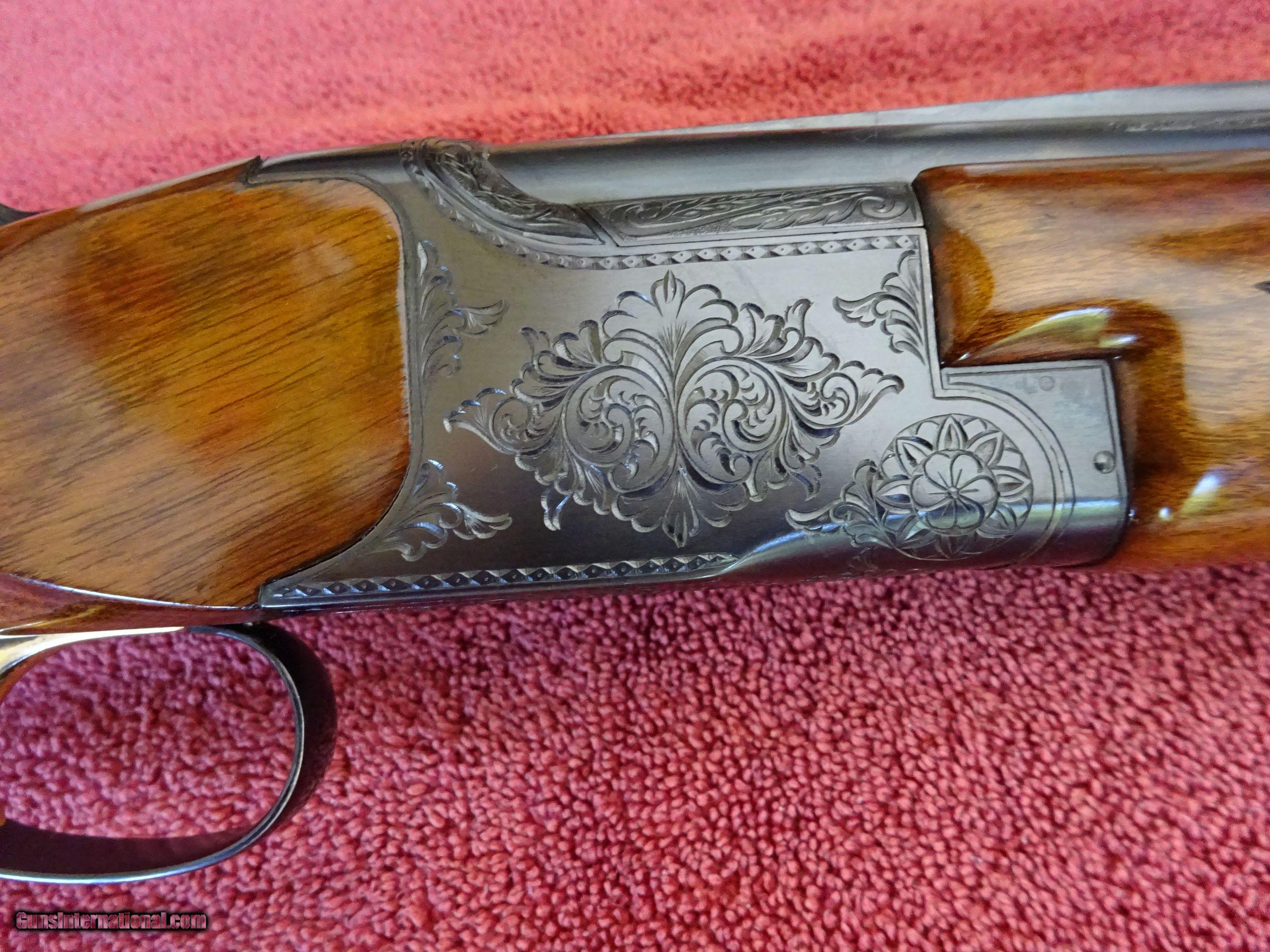 Description: CHARLES DALY, MIROKU, SUPERIOR GRADE, 20 GAUGE. 26" SKEET AND SKEET BARRELS WITH 3" CHAMBERS, 99% BRIGHT BLUE, MIRROR BRIGHT BORES, TWIN SIGHTS AND AUTOMATIC EJECTORS. GOLD SINGLE SELECTIVE TRIGGER, FULLY ENGRAVED WITH DEEP CUT SCROLLWORK AND FINE BORDERS. ROUND KNOB PISTOL GRIP STOCK, BEAVERTAIL FOREARM, EXCELLENT CHECKERING AND WOOD FINISH. ORIGINAL BUTTPLATE, 1 3/8" X 2 1/4" X 14". 100% ORIGINAL CONDITION IN IT'S ORIGINAL BOX WITH THE INSTRUCTION BOOKLET AND WARRANTEE CARD. MADE IN THE 1970'S. $1375.00 + $50.00 Insured shipping to an FFL address. See all Pats listings We also have hundreds of pieces of ORIGINAL gun company advertising & memorabilia available for sale. We have no reprints or reproductions. Email for more information. SOLD |