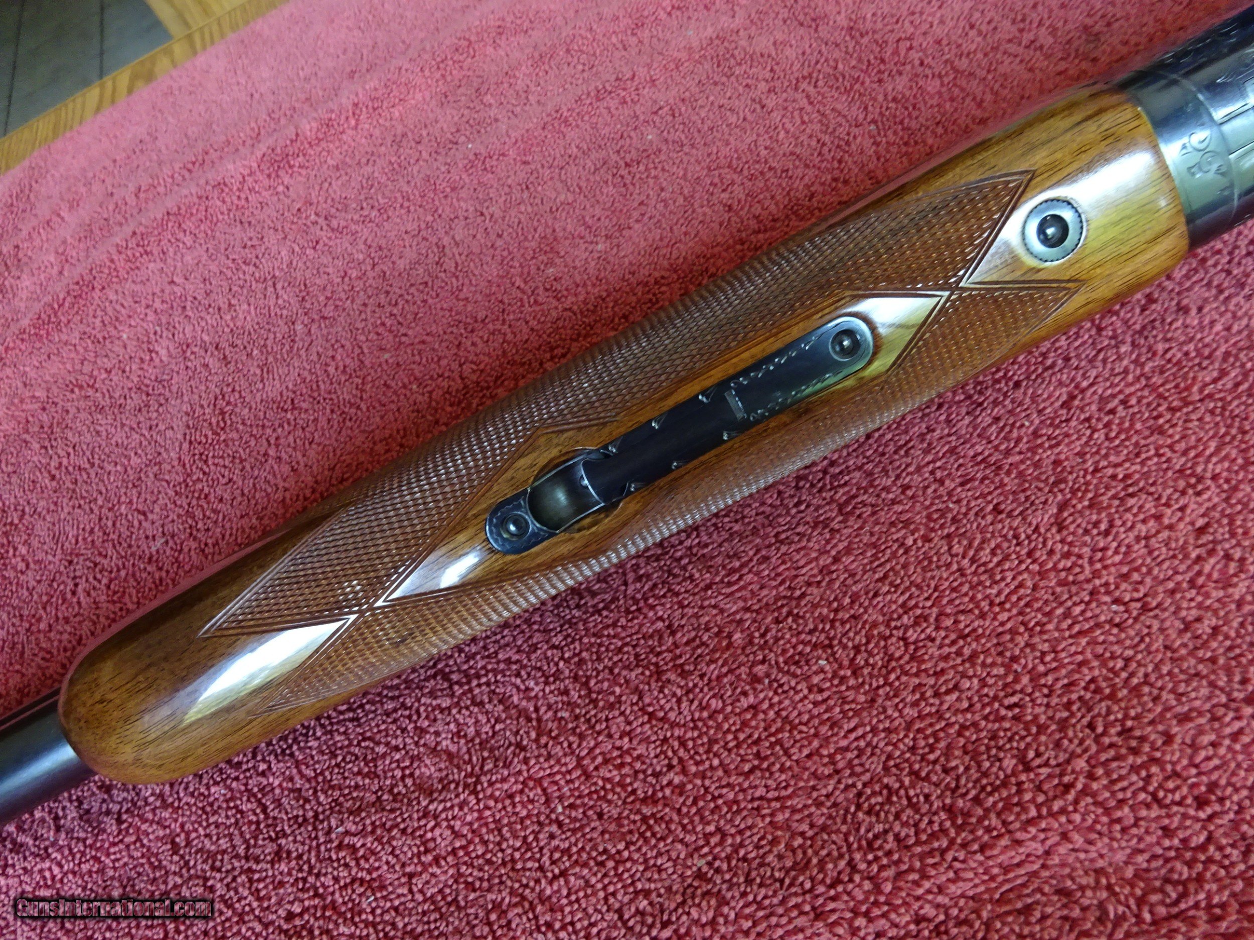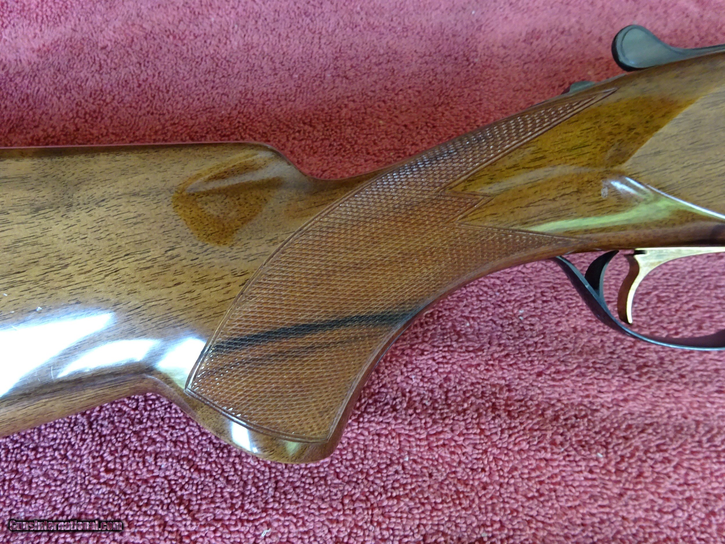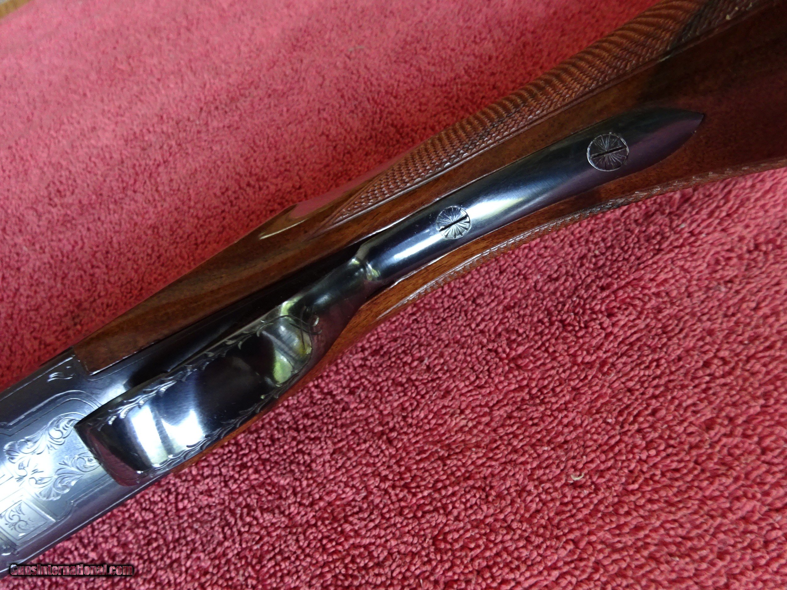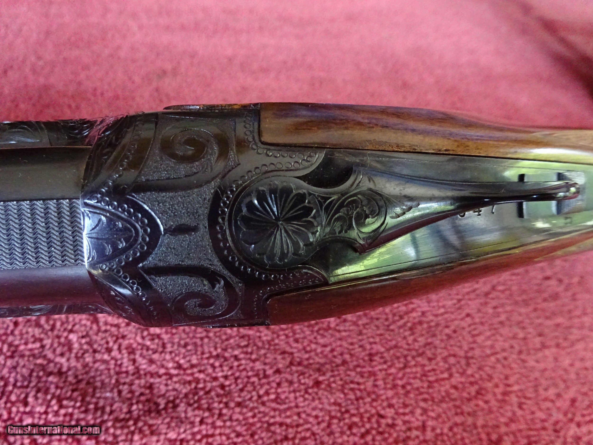 Description: CHARLES DALY, MIROKU, JAPAN, SUPERIOR GRADE 12 GAUGE O/U. 26" VENT RIB BARRELS, IMCYL. AND MODIFIED, 2 3/4" CHAMBERS, TWIN SIGHTS, AUTOMATIC EJECTORS. SINGLE SELECTIVE GOLD TRIGGER, DEEP CUT ACANTHUS SCROLL ENGRAVING PATTERN, FINE BORDERS. TOP IS ESPECIALLY ATTRACTIVE WITH A STIPPLED BACKGROUND. PISTOL GRIP STOCK, BEAVERTAIL FOREARM, FINE HAND-CUT CHECKERING, MIROKU MARKED BUTTPLATE. VIRTUALLY NO BLUE WEAR ON ANY METAL SURFACES. VERY MINOR HANDLING MARKS IN THE VARNISH. I DOUBT THE GUN WAS EVER HUNTED WITH CASED IN ITS ORIGINAL CHARLES DALY MARKED FITTED TRUNK CASE. 1 3/8" X 1 3/4" X 14", 7 POUNDS 5 OUNCES. VERY ATTRACTIVE GUN IN 100% ORIGINAL CONDITION. $1250.00 + $50.00 Insured shipping to an FFL address. See all Pats gun listings on this site! We also have hundreds of pieces of ORIGINAL gun company advertising & memorabilia available for sale on our site SPORTINGCOLLECTIBLES. We have no reprints or reproductions. Email for more information. SOLD |