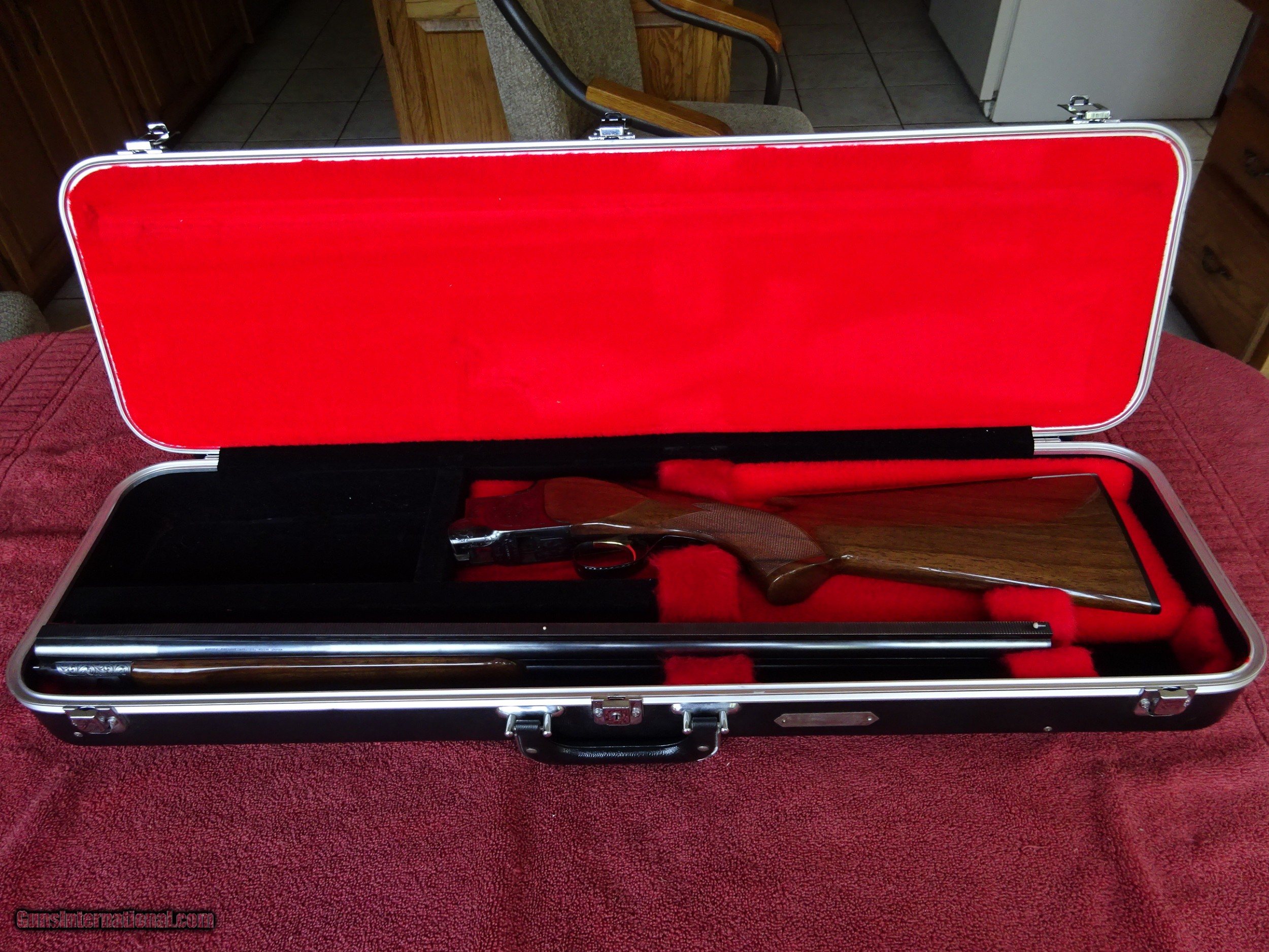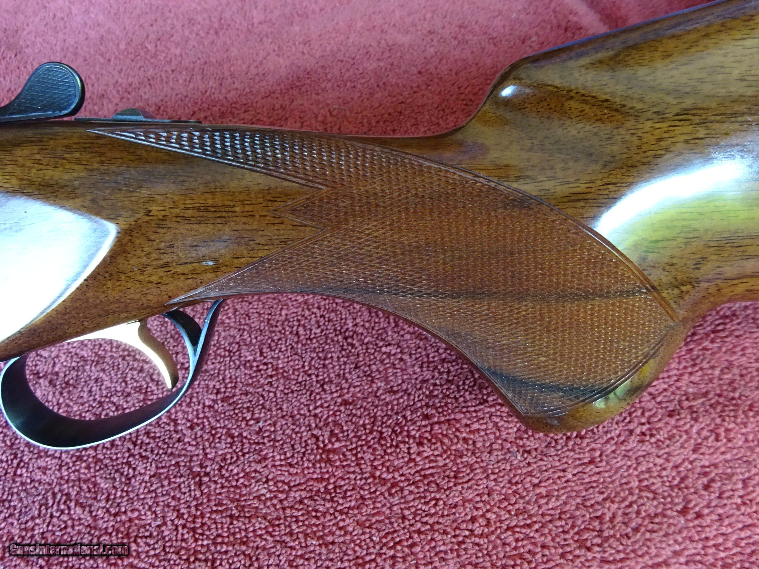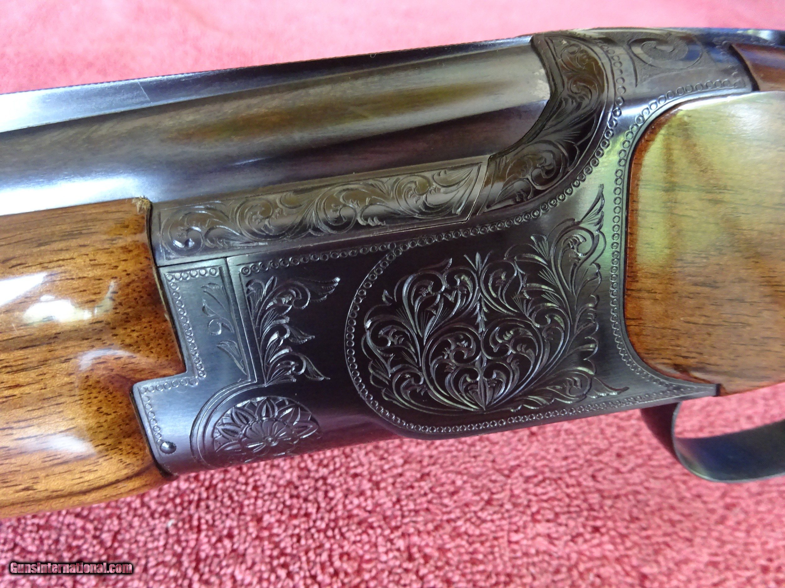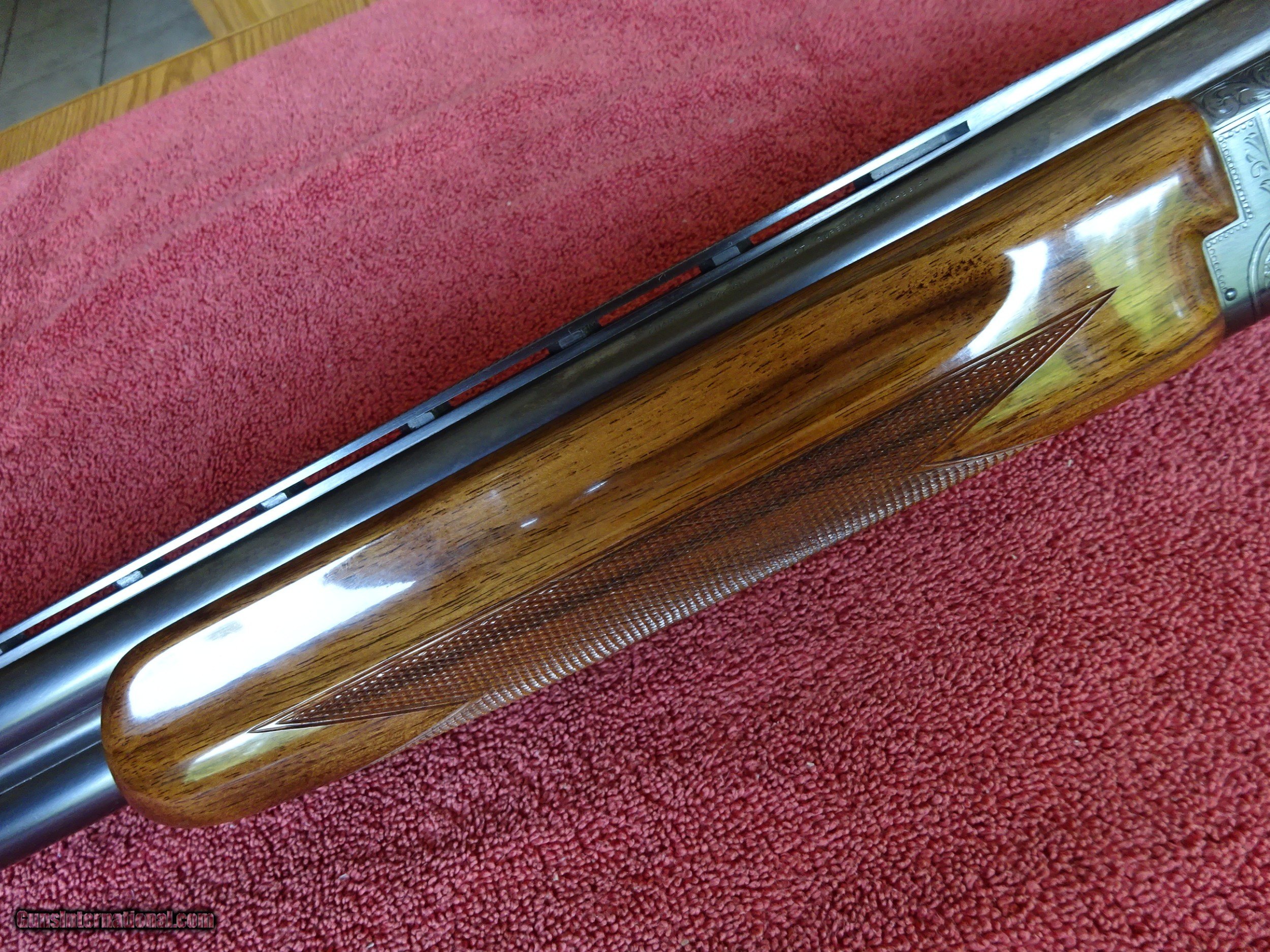 Description: CHARLES DALY, MIROKU, JAPAN, SUPERIOR GRADE 12 GAUGE O/U. 26" VENT RIB BARRELS, IMCYL. AND MODIFIED, 2 3/4" CHAMBERS, TWIN SIGHTS, AUTOMATIC EJECTORS. SINGLE SELECTIVE GOLD TRIGGER, DEEP CUT ACANTHUS SCROLL ENGRAVING PATTERN, FINE BORDERS. TOP IS ESPECIALLY ATTRACTIVE WITH A STIPPLED BACKGROUND. PISTOL GRIP STOCK, BEAVERTAIL FOREARM, FINE HAND-CUT CHECKERING, MIROKU MARKED BUTTPLATE. VIRTUALLY NO BLUE WEAR ON ANY METAL SURFACES. VERY MINOR HANDLING MARKS IN THE VARNISH. I DOUBT THE GUN WAS EVER HUNTED WITH CASED IN ITS ORIGINAL CHARLES DALY MARKED FITTED TRUNK CASE. 1 3/8" X 1 3/4" X 14", 7 POUNDS 5 OUNCES. VERY ATTRACTIVE GUN IN 100% ORIGINAL CONDITION. $1250.00 + $50.00 Insured shipping to an FFL address. See all Pats gun listings on this site! We also have hundreds of pieces of ORIGINAL gun company advertising & memorabilia available for sale on our site SPORTINGCOLLECTIBLES. We have no reprints or reproductions. Email for more information. SOLD |