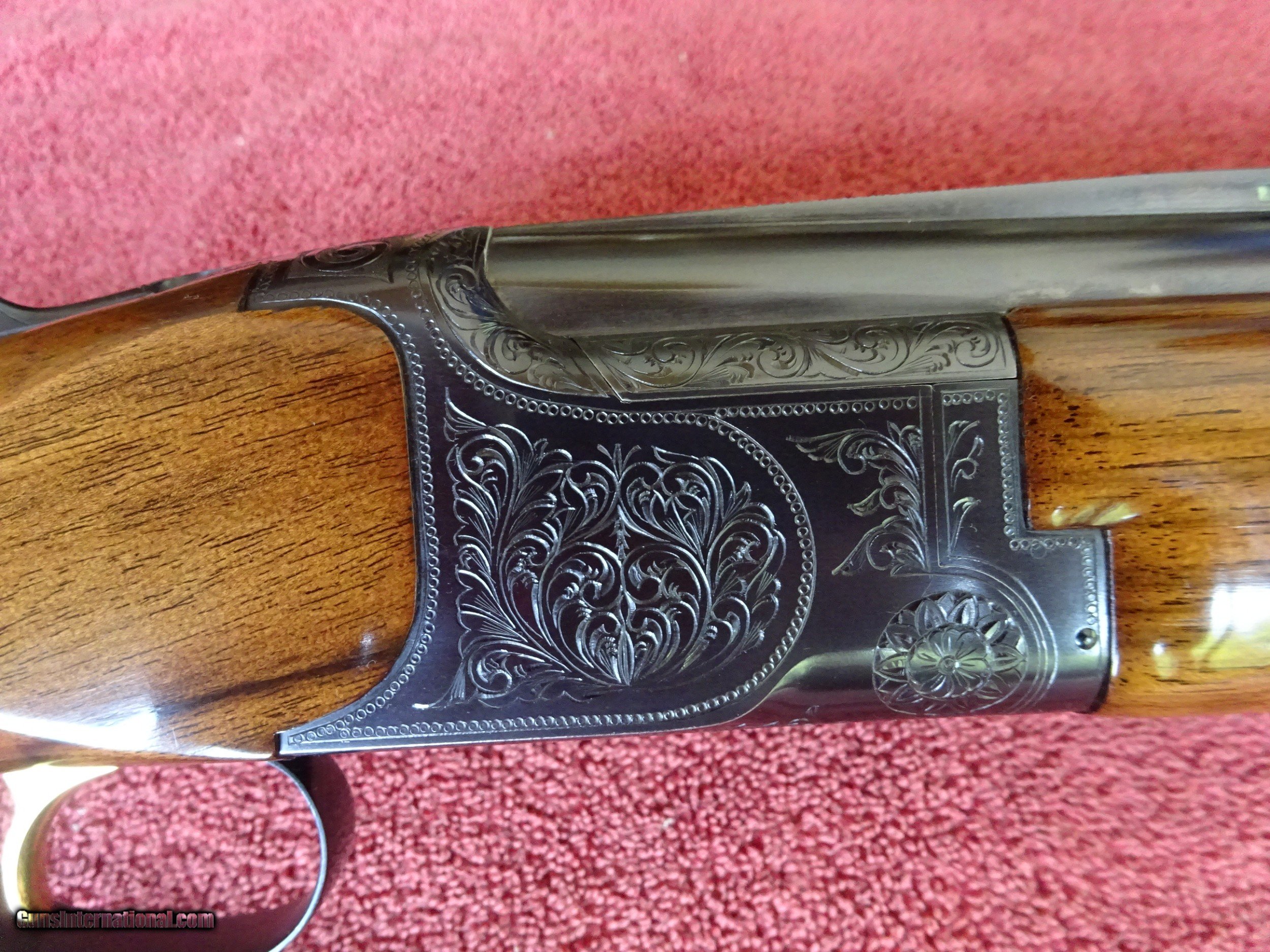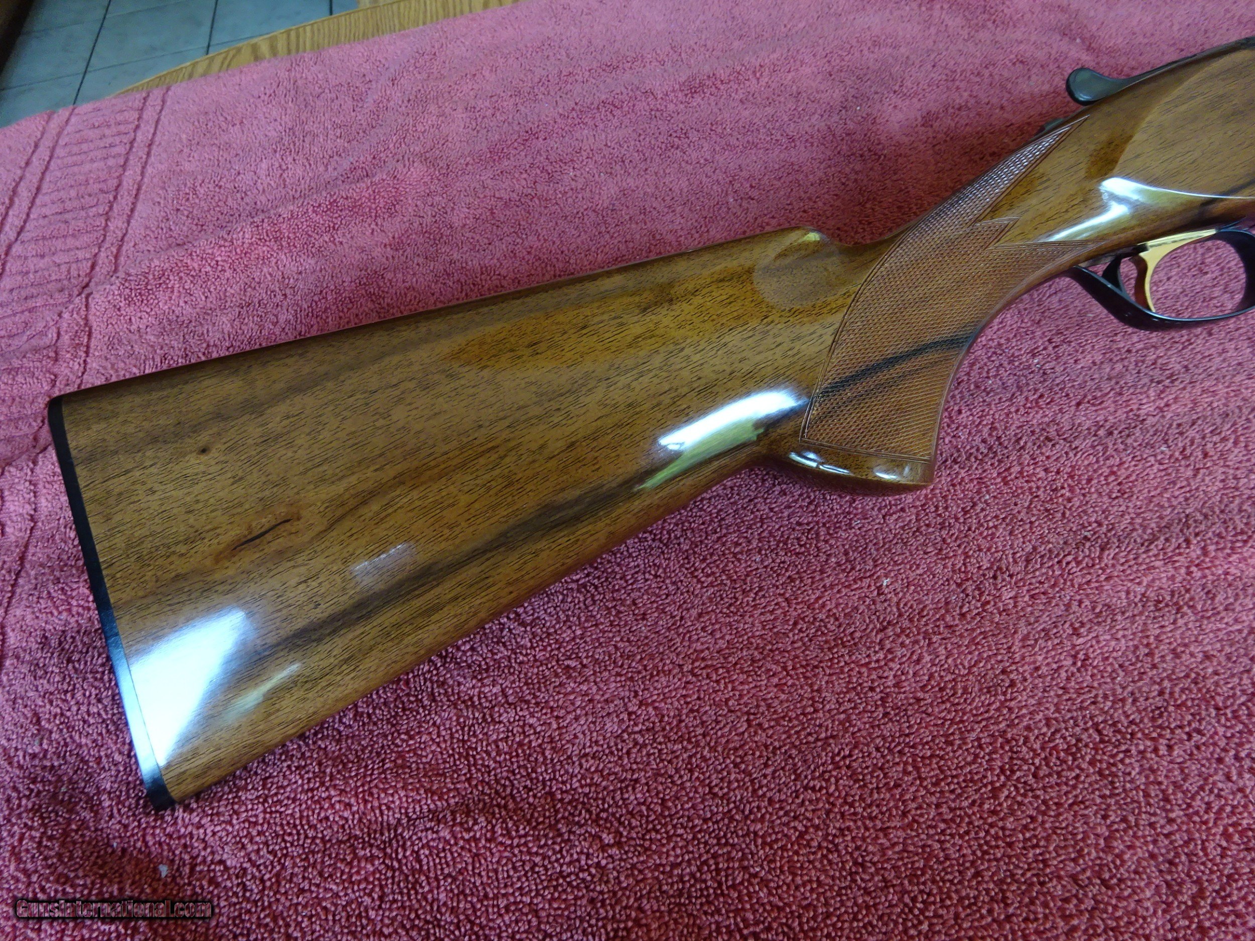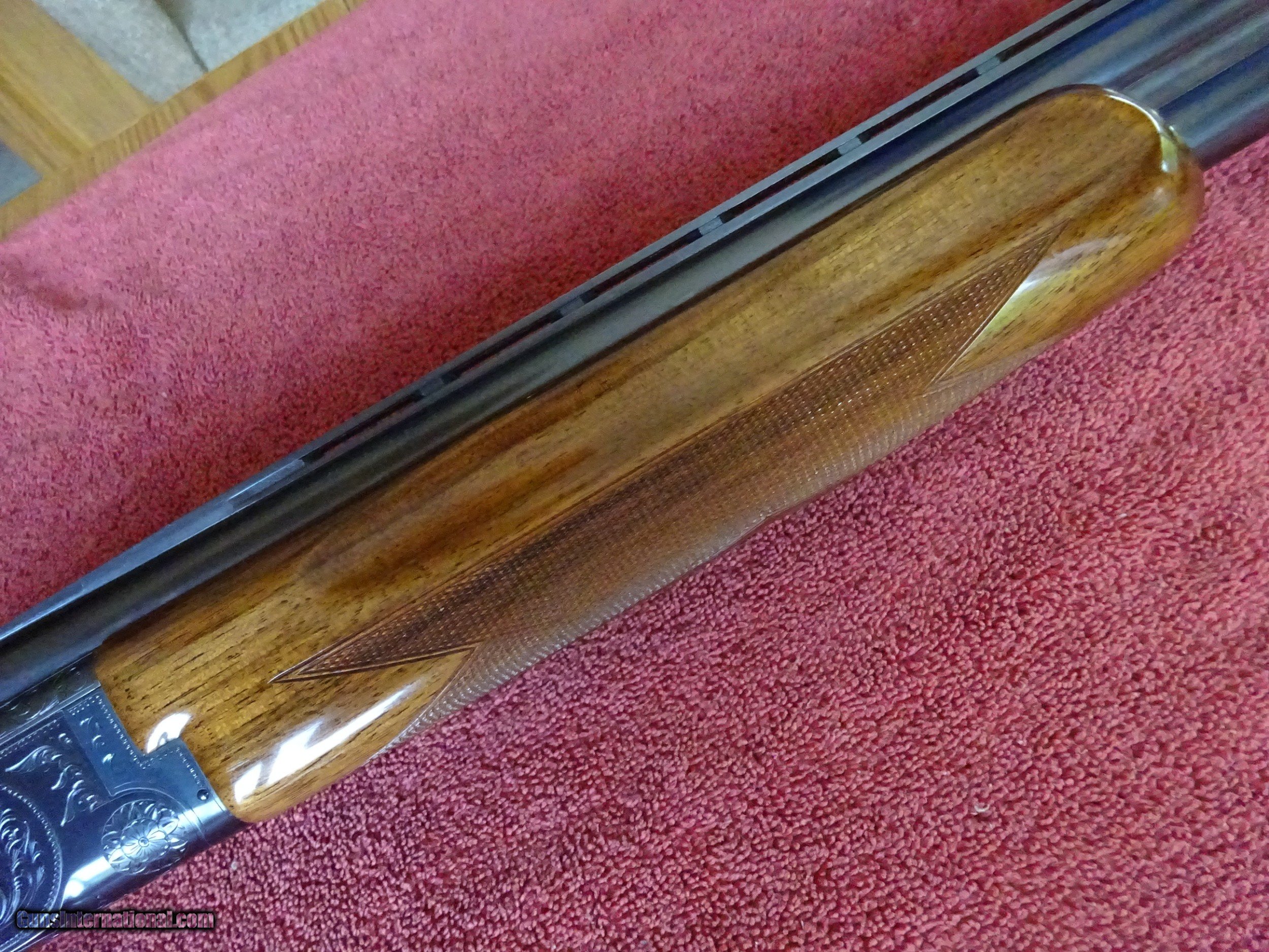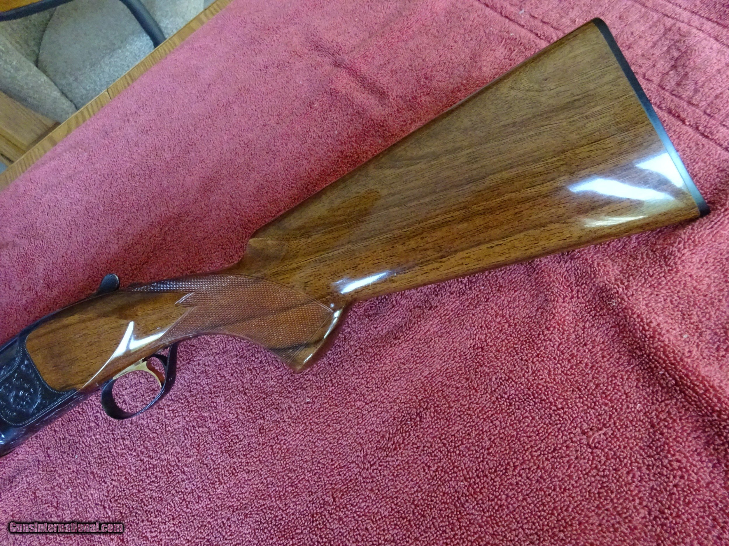 Description: CHARLES DALY, MIROKU, JAPAN, SUPERIOR GRADE 12 GAUGE O/U. 26" VENT RIB BARRELS, IMCYL. AND MODIFIED, 2 3/4" CHAMBERS, TWIN SIGHTS, AUTOMATIC EJECTORS. SINGLE SELECTIVE GOLD TRIGGER, DEEP CUT ACANTHUS SCROLL ENGRAVING PATTERN, FINE BORDERS. TOP IS ESPECIALLY ATTRACTIVE WITH A STIPPLED BACKGROUND. PISTOL GRIP STOCK, BEAVERTAIL FOREARM, FINE HAND-CUT CHECKERING, MIROKU MARKED BUTTPLATE. VIRTUALLY NO BLUE WEAR ON ANY METAL SURFACES. VERY MINOR HANDLING MARKS IN THE VARNISH. I DOUBT THE GUN WAS EVER HUNTED WITH CASED IN ITS ORIGINAL CHARLES DALY MARKED FITTED TRUNK CASE. 1 3/8" X 1 3/4" X 14", 7 POUNDS 5 OUNCES. VERY ATTRACTIVE GUN IN 100% ORIGINAL CONDITION. $1250.00 + $50.00 Insured shipping to an FFL address. See all Pats gun listings on this site! We also have hundreds of pieces of ORIGINAL gun company advertising & memorabilia available for sale on our site SPORTINGCOLLECTIBLES. We have no reprints or reproductions. Email for more information. SOLD |