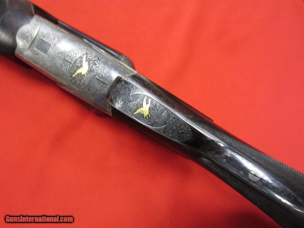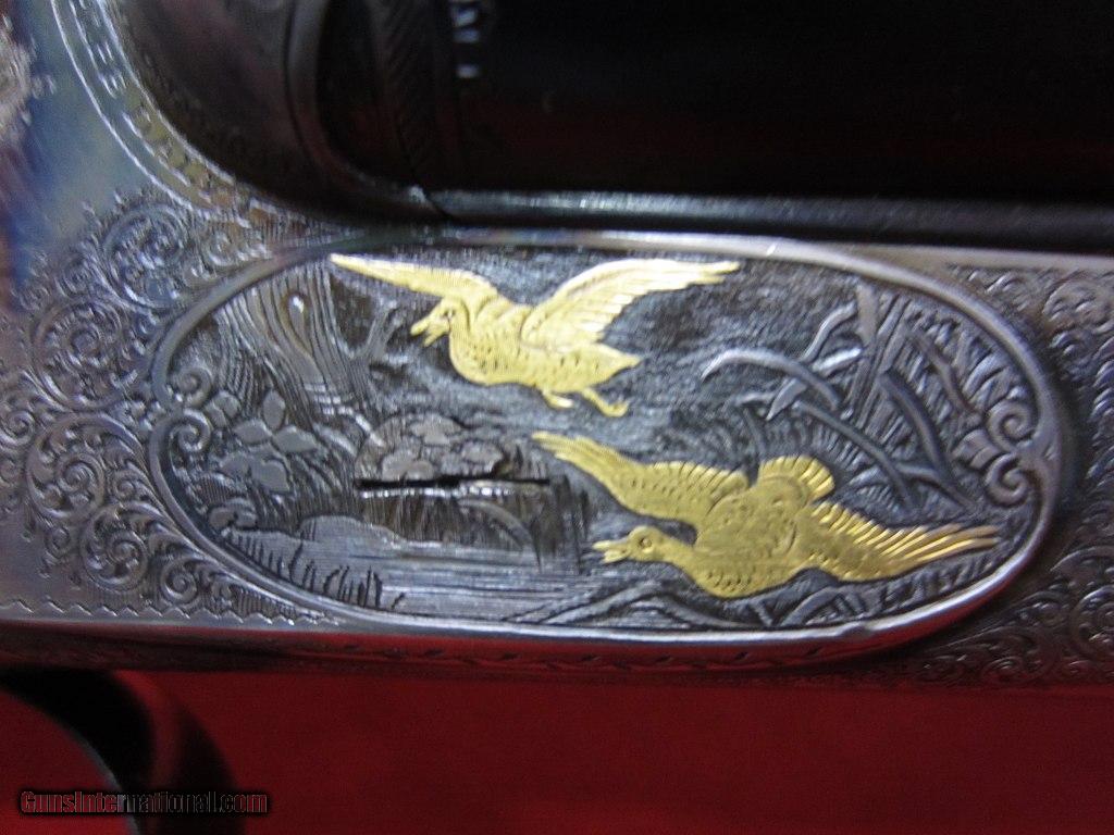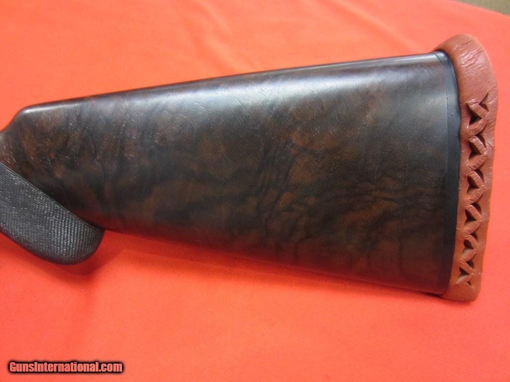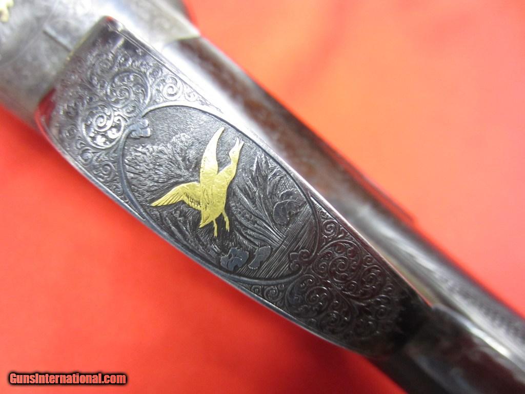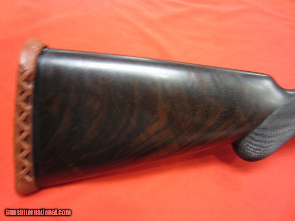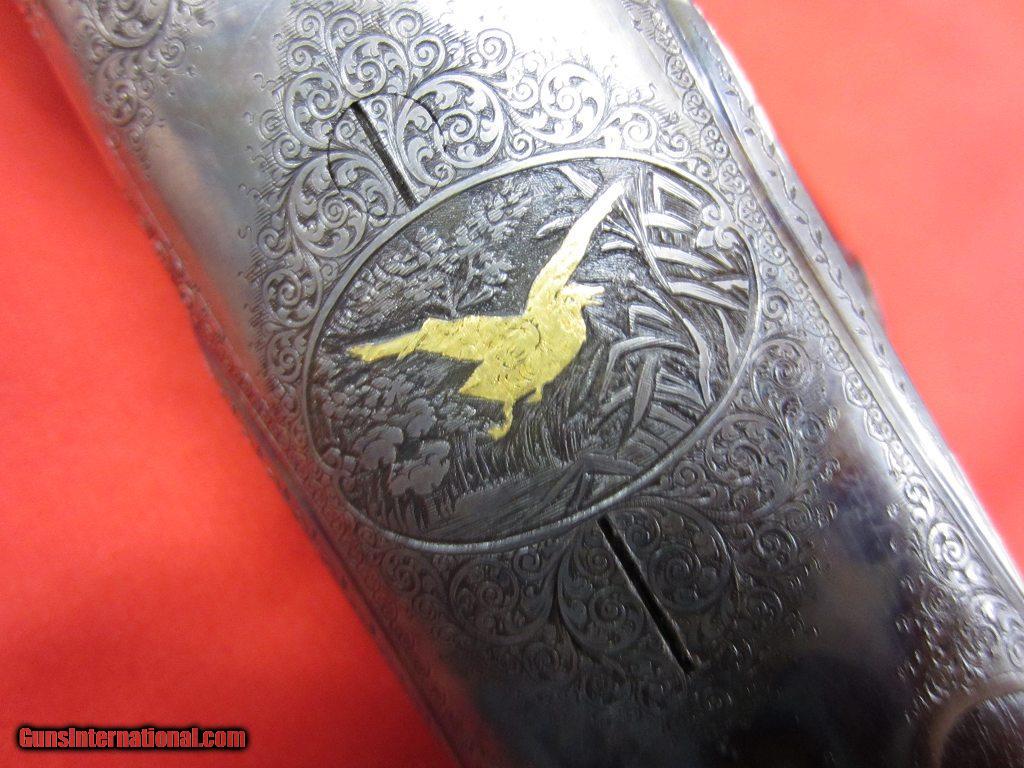 Description: Charles Daly made in Prussia: This gun is appears to be all factory original with the exception of the butt pad. Case colored scalloped boxlock receiver with near full coverage game scene and scroll engraving; the waterfowl are gold inlayed on the sides and bottom of the receiver as well as the trigger guard, side clips, cocking indicators, checkered side panels, single selective trigger, the 32" vent rib barrels are choked Full/Full, nicely figured dark POW stock with a beavertail forend, 13 1/4" LOP over a crushed Hawkins pad. SOLD |