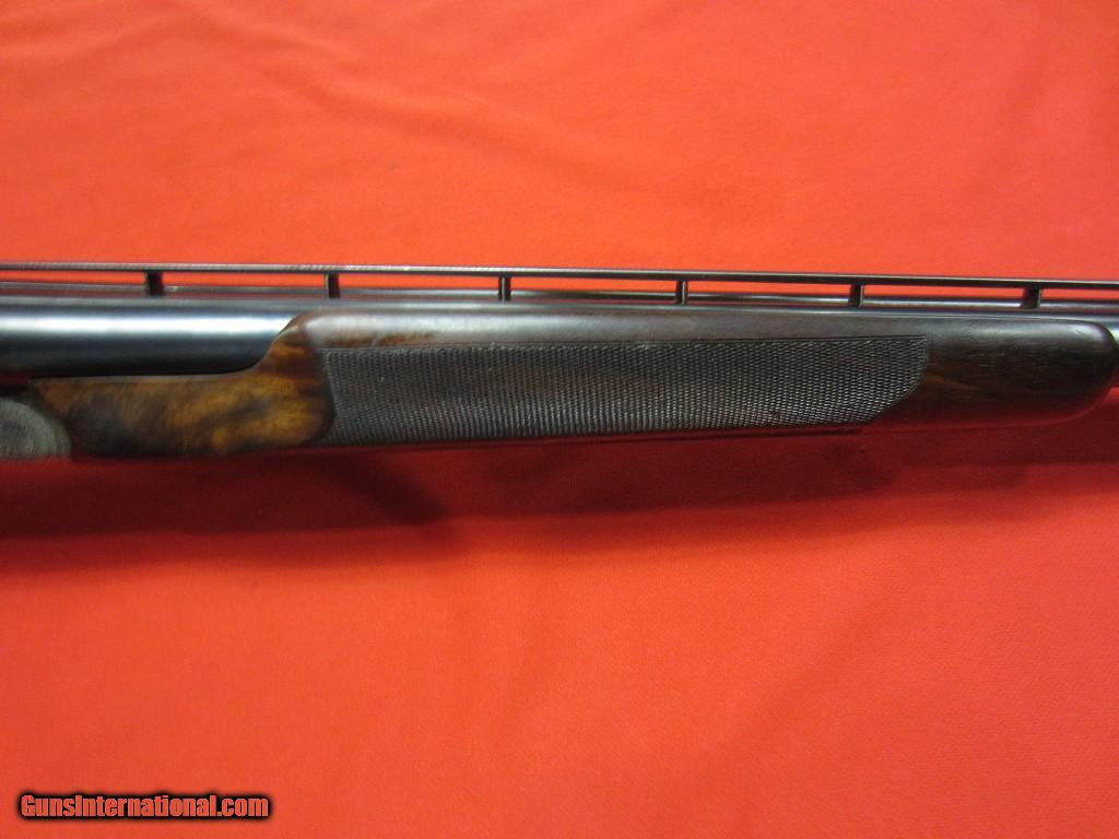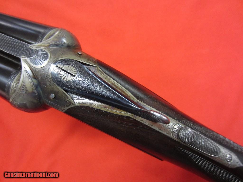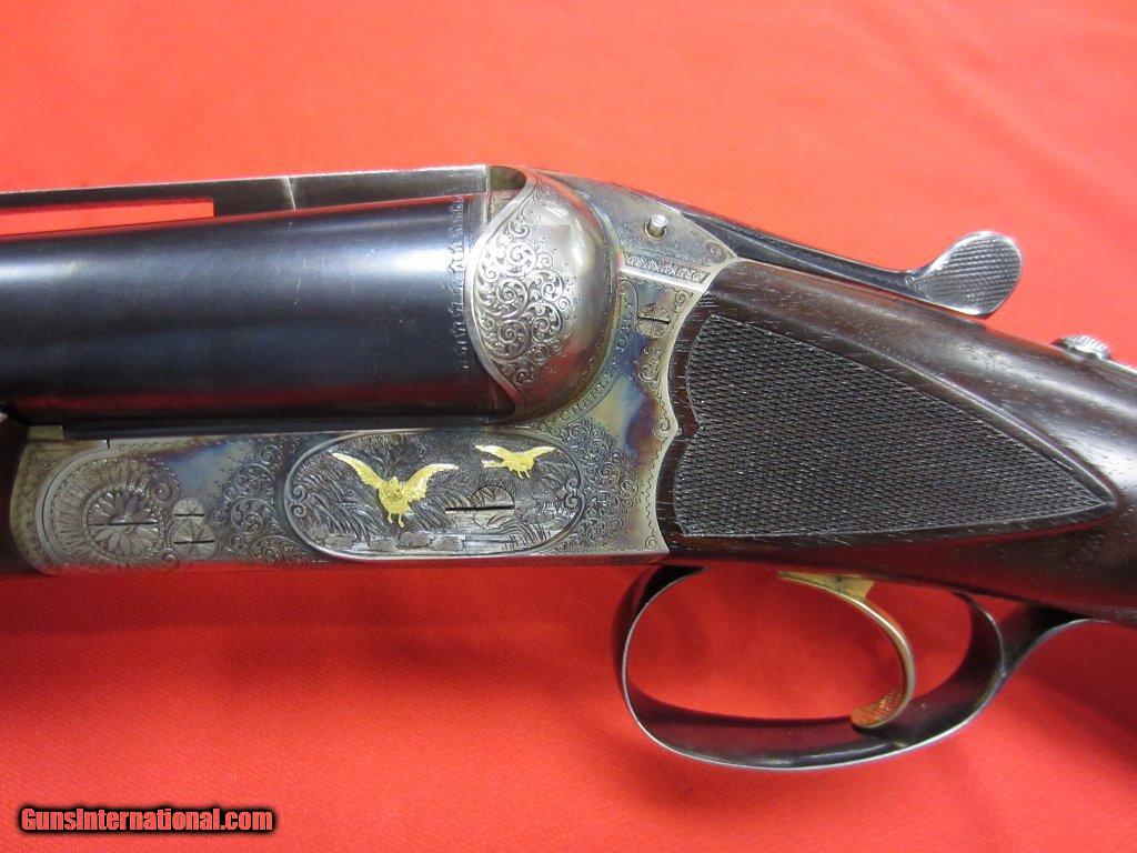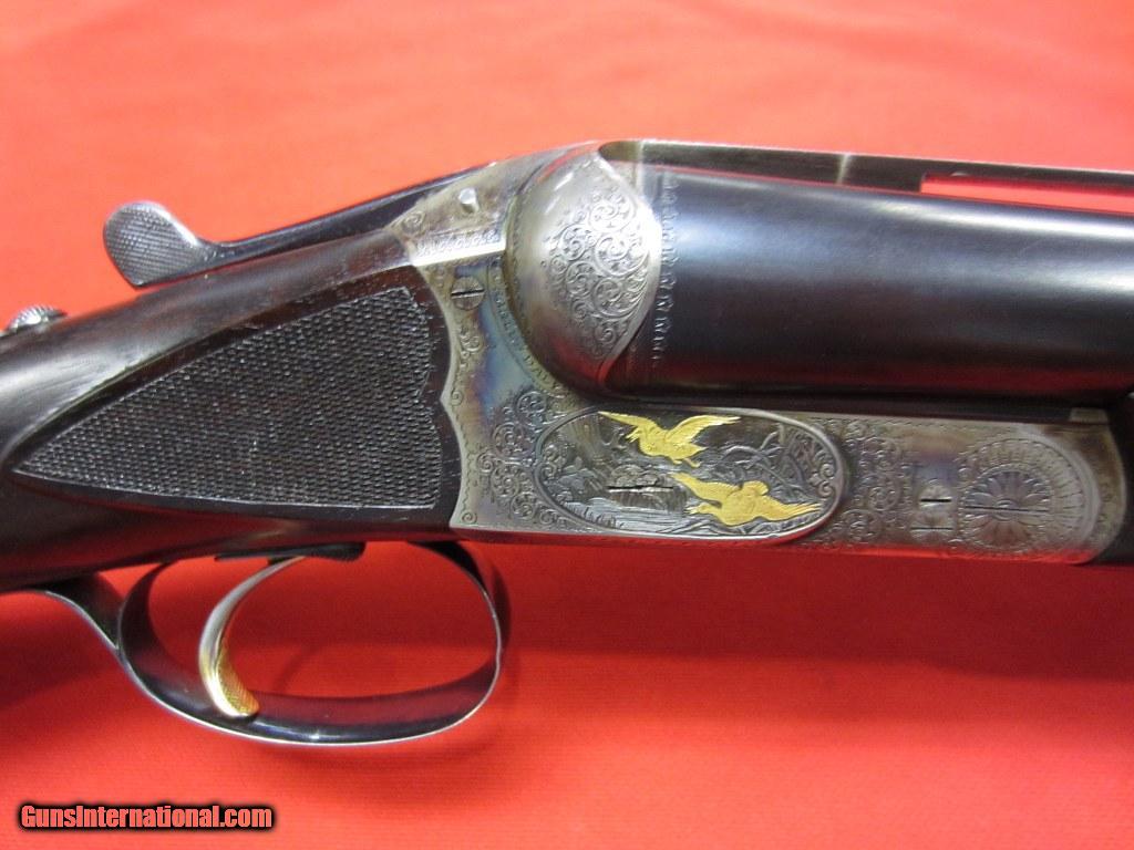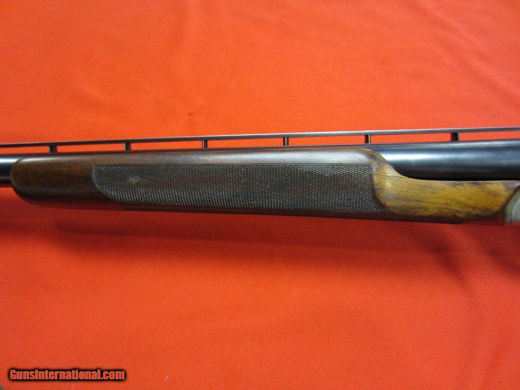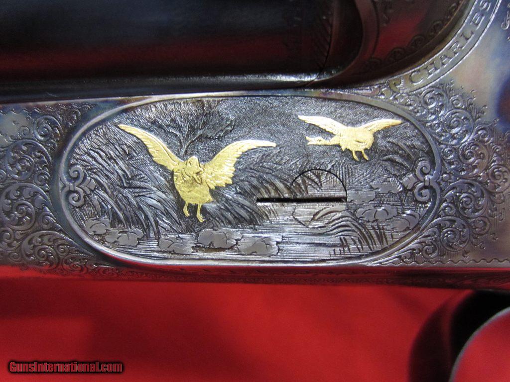 Description: Charles Daly made in Prussia: This gun is appears to be all factory original with the exception of the butt pad. Case colored scalloped boxlock receiver with near full coverage game scene and scroll engraving; the waterfowl are gold inlayed on the sides and bottom of the receiver as well as the trigger guard, side clips, cocking indicators, checkered side panels, single selective trigger, the 32" vent rib barrels are choked Full/Full, nicely figured dark POW stock with a beavertail forend, 13 1/4" LOP over a crushed Hawkins pad. SOLD |