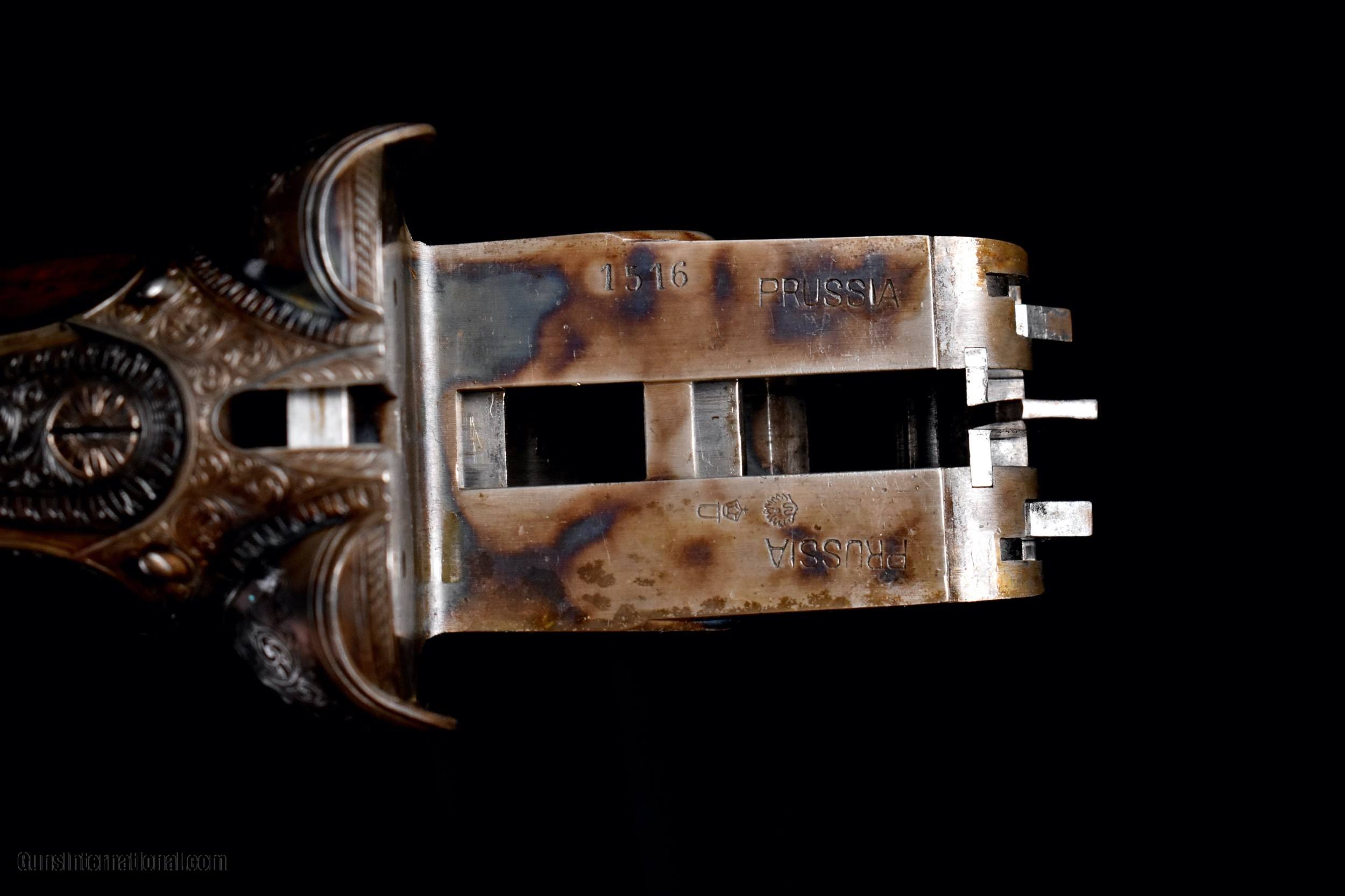 Description: Exceptionally rare 20 ga gun! Very rare and lightweight Charles Daly Diamond Quality gun made in Prussia. Lindner made gun with 26" barrels. These early guns are of incredibly high quality and this gun made with sideclips, auto-ejectors, double triggers, and auto-safety. The gun is near full coverage engraved in fantastic detailed scroll and game scenes as seen in the photos. Gun is very lightweight and handles like a wand. Beautiful original stocks with fine checkering are nicely figured. Housed in a green canvas, green felt interior case with leather appointments. Overall the gun remains in extremely fine pleasing original condition with more than 75% bold original case colors, 95% original barrel blue and stocks are superb with some finish added for preservation. Bores are brilliant and shiny and mechanics are crisp. This exceptionally rare gun is priced at $18,900. Please dont hesitate to contact me with any questions or reasonable offers at (704) 280-2382 or via PM on this site. SOLD Curio/Relic: Yes Shotgun Gauge: 20 Gauge Manufacturer: H.A. Lindner Model: Diamond Quality Serial Number: 1516 Barrel Length: 26 Chambers: 2-5/8 Ejectors: Yes Condition: Excellent Metal Condition: Excellent Wood Condition: Excellent Bore Condition: Bright and shiny Triggers: Double Triggers Stock: Original Round knob grip Stock Comb: 1-1/2 Stock Heel: 2-1/4 Fore End: Splinter Butt Pad: Silvers Type LOP: 14-3/8 Weight: 5lbs 10oz Choke Left: .630 with .012 (Mod) Choke Right: .630 with .008 Minimum Wall Thickness Left: .030 Minimum Wall Thickness Right: .030 |