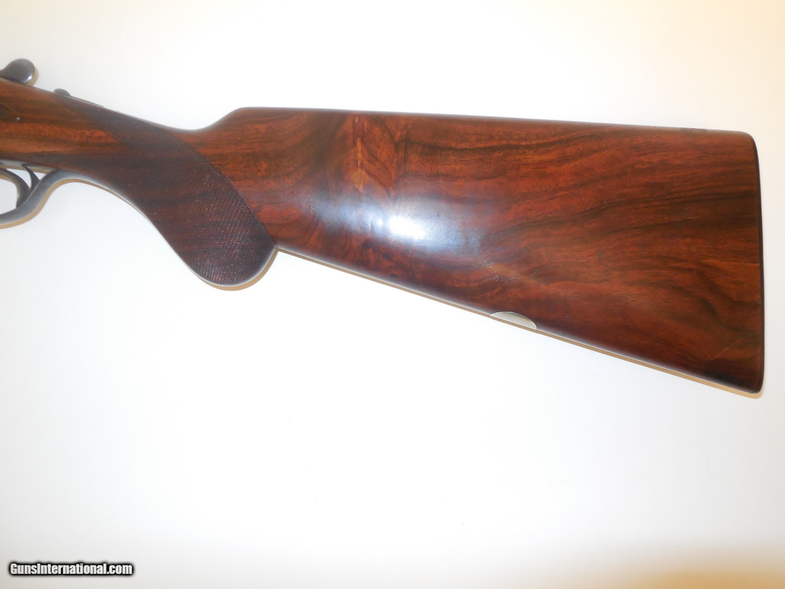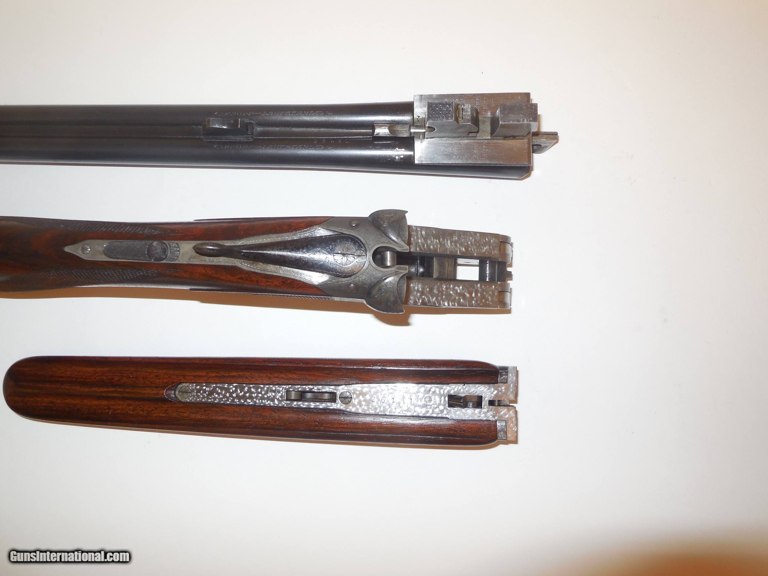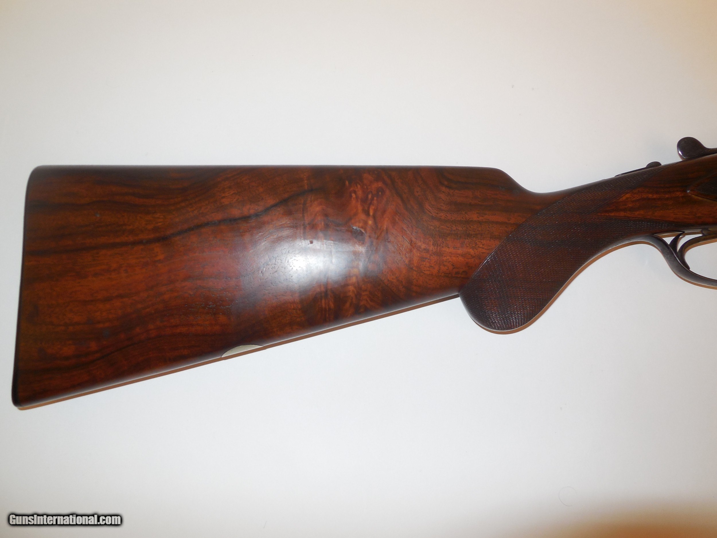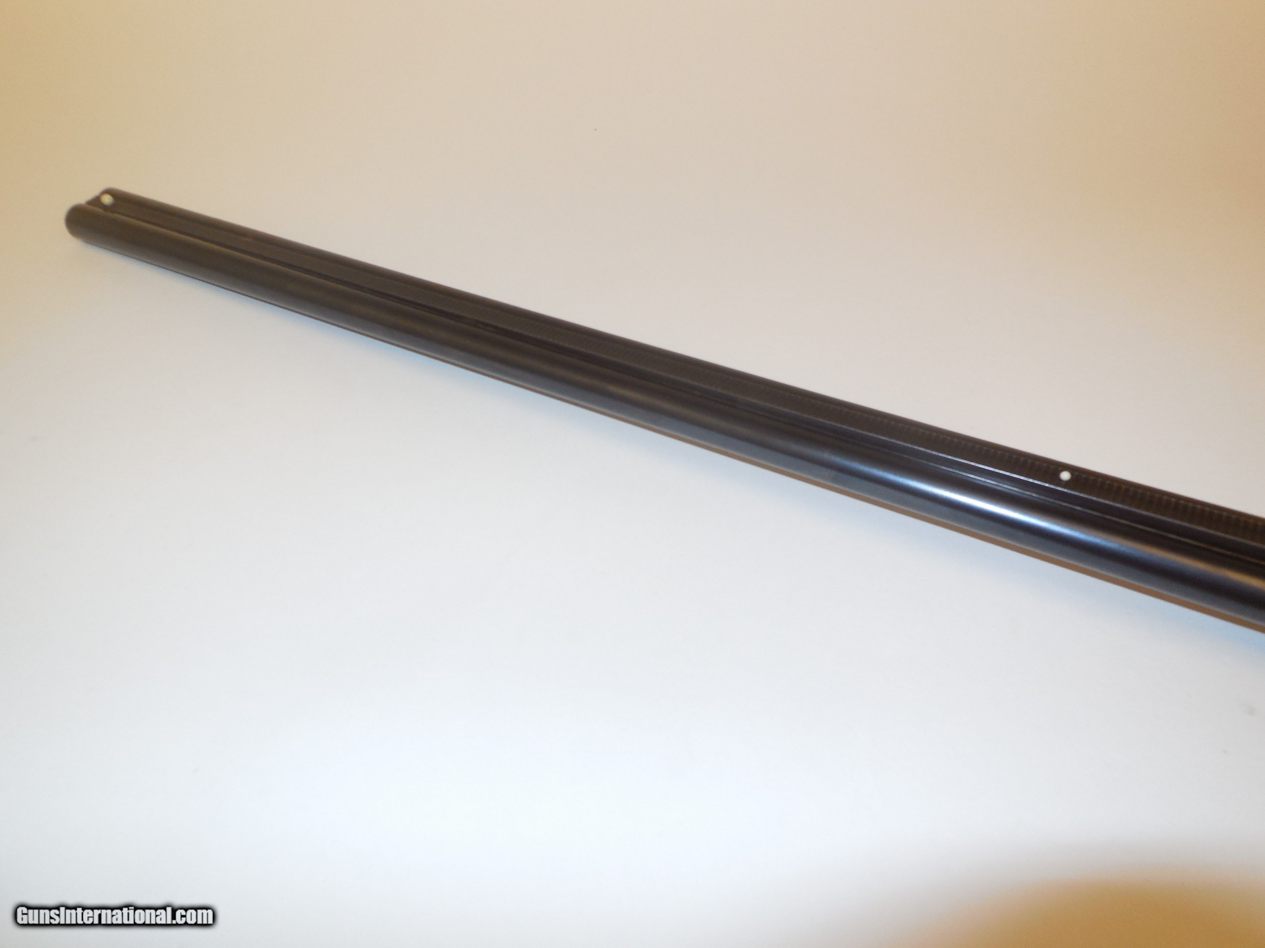 Description: Charles Daly, Superior Grade, .410, 26” barrels choked Mod/Mod. Small tiny beavertail, fine line checkering , semi pistol grip, checkered butt, made in Prussia, cocking indicators, double trigger, auto ejector, proofed in 1932. Features beautiful Turkish walnut, auto safety, perfect, untouched screws ABSOLUTELY UNFIRED. 99% blue wood finish and case color. This gun even has all the trigger guard blue and case color on the forend latch with a horn tip and forend. This is a once in a lifetime find and has double ivory bead sights. Still has the original polishing marks on water table and forend. Inventory # 43467 Price $ 21,995 SOLD |