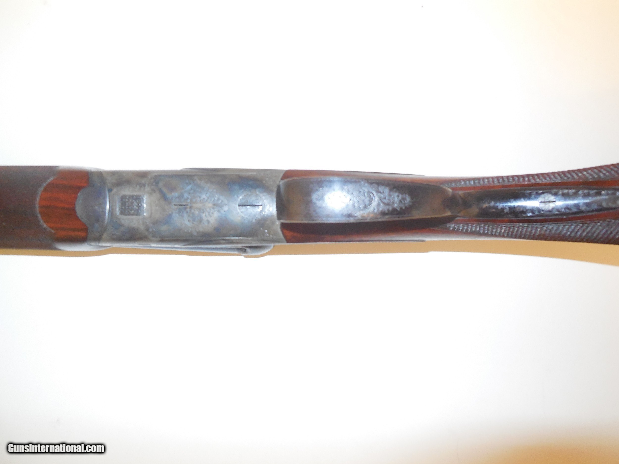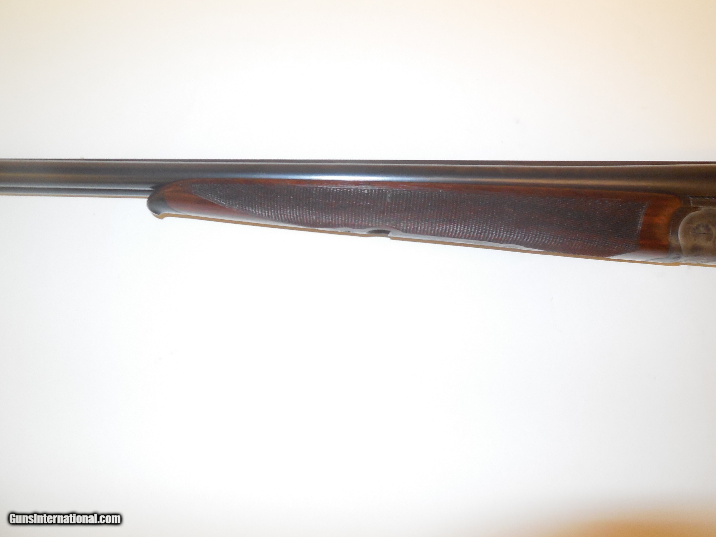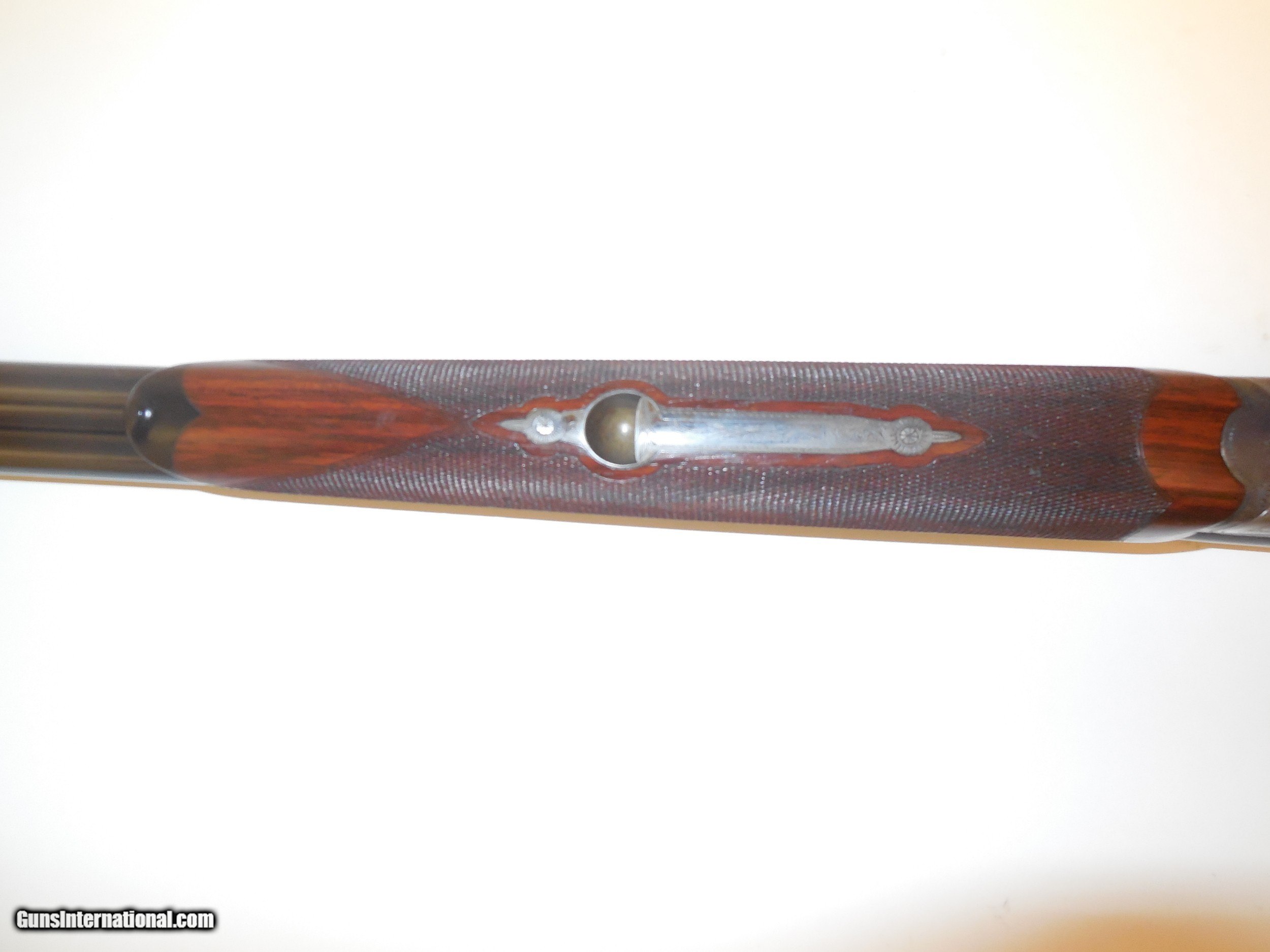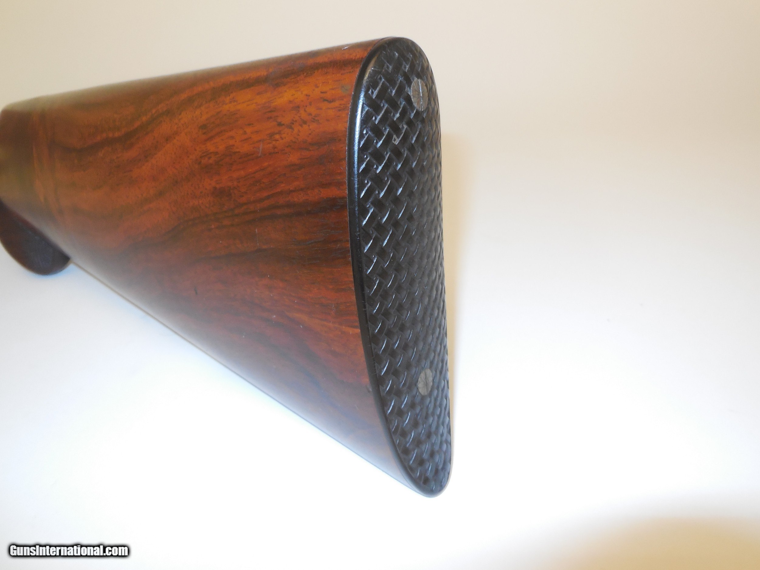 Description: Charles Daly, Superior Grade, .410, 26” barrels choked Mod/Mod. Small tiny beavertail, fine line checkering , semi pistol grip, checkered butt, made in Prussia, cocking indicators, double trigger, auto ejector, proofed in 1932. Features beautiful Turkish walnut, auto safety, perfect, untouched screws ABSOLUTELY UNFIRED. 99% blue wood finish and case color. This gun even has all the trigger guard blue and case color on the forend latch with a horn tip and forend. This is a once in a lifetime find and has double ivory bead sights. Still has the original polishing marks on water table and forend. Inventory # 43467 Price $ 21,995 SOLD |