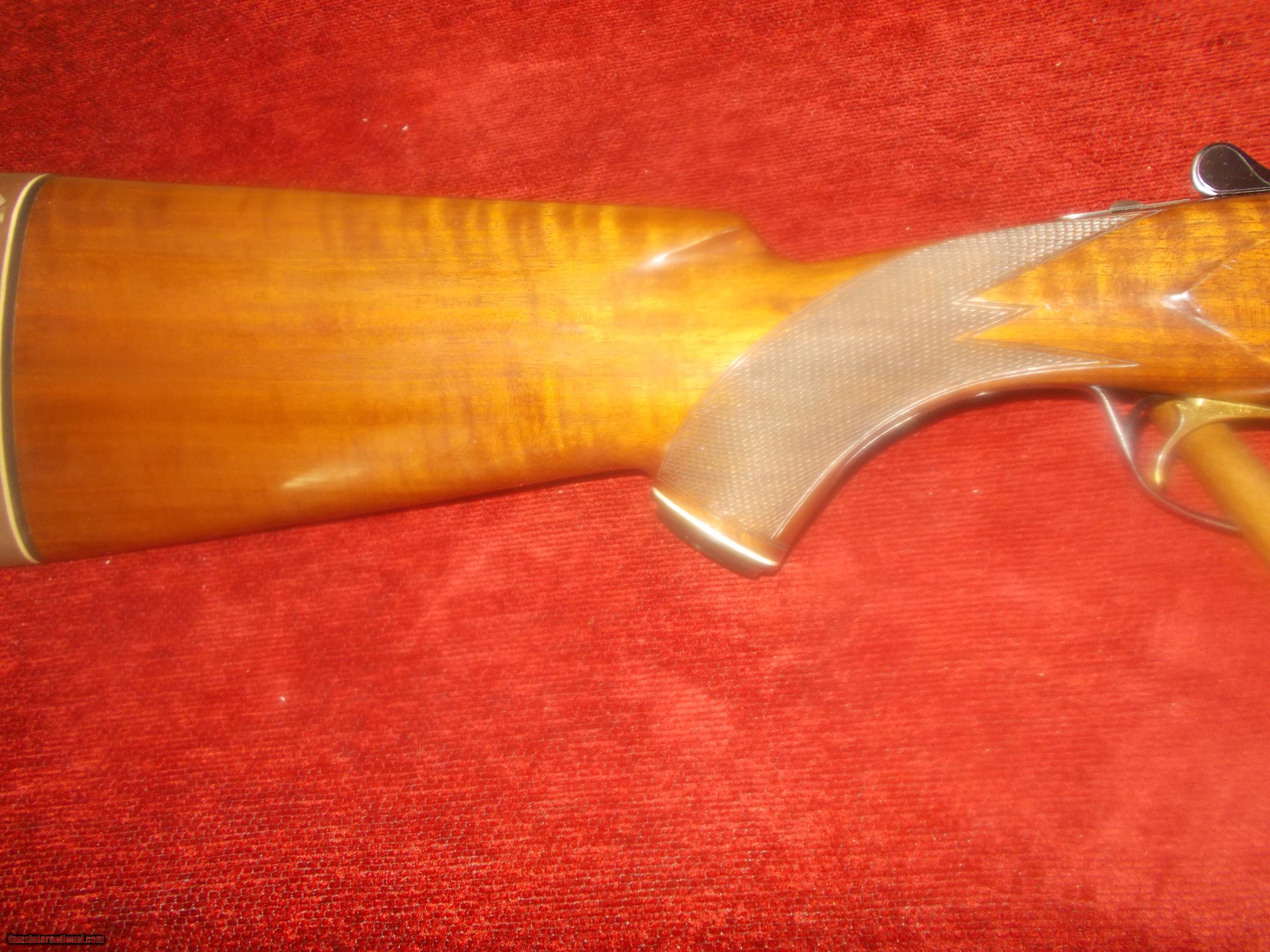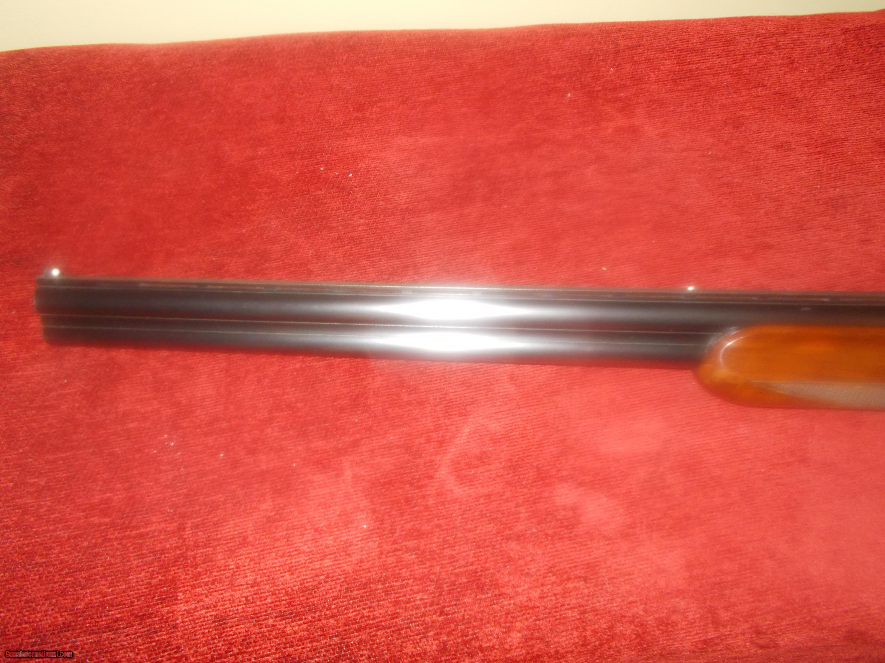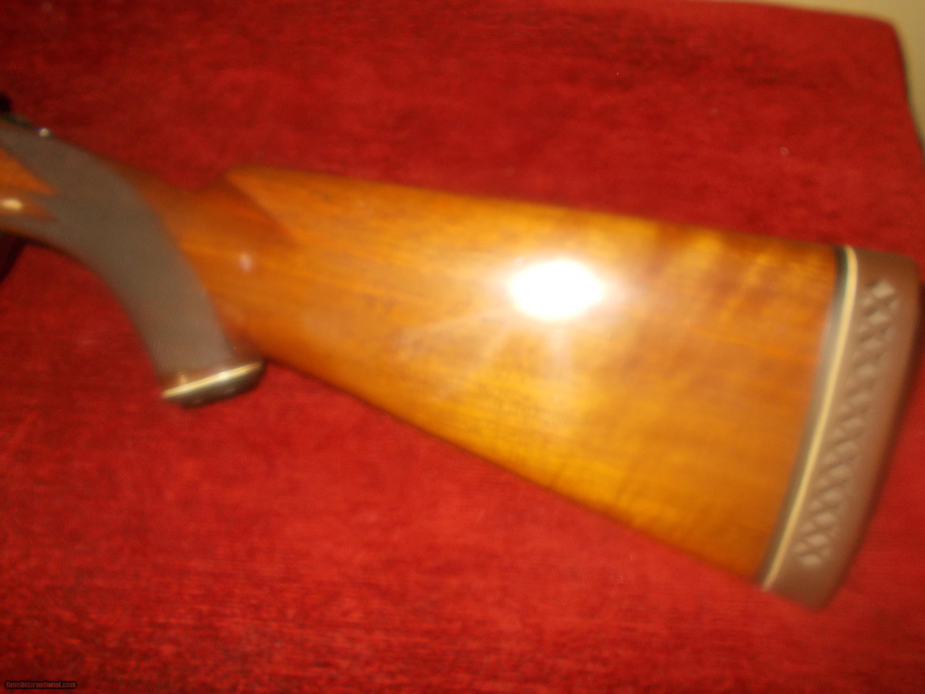 Description: 26" VR, double ivories, choked IC/M, single select trigger, ejectors, engraved receiver ( Comparable in looks & mfg. as Winchester 101), preminum grade checkered orange wine colored walnut PG stock,14" LOP over 1" vent pad, 98% blue, some minor handling only, 6 lbs.: SOLD |