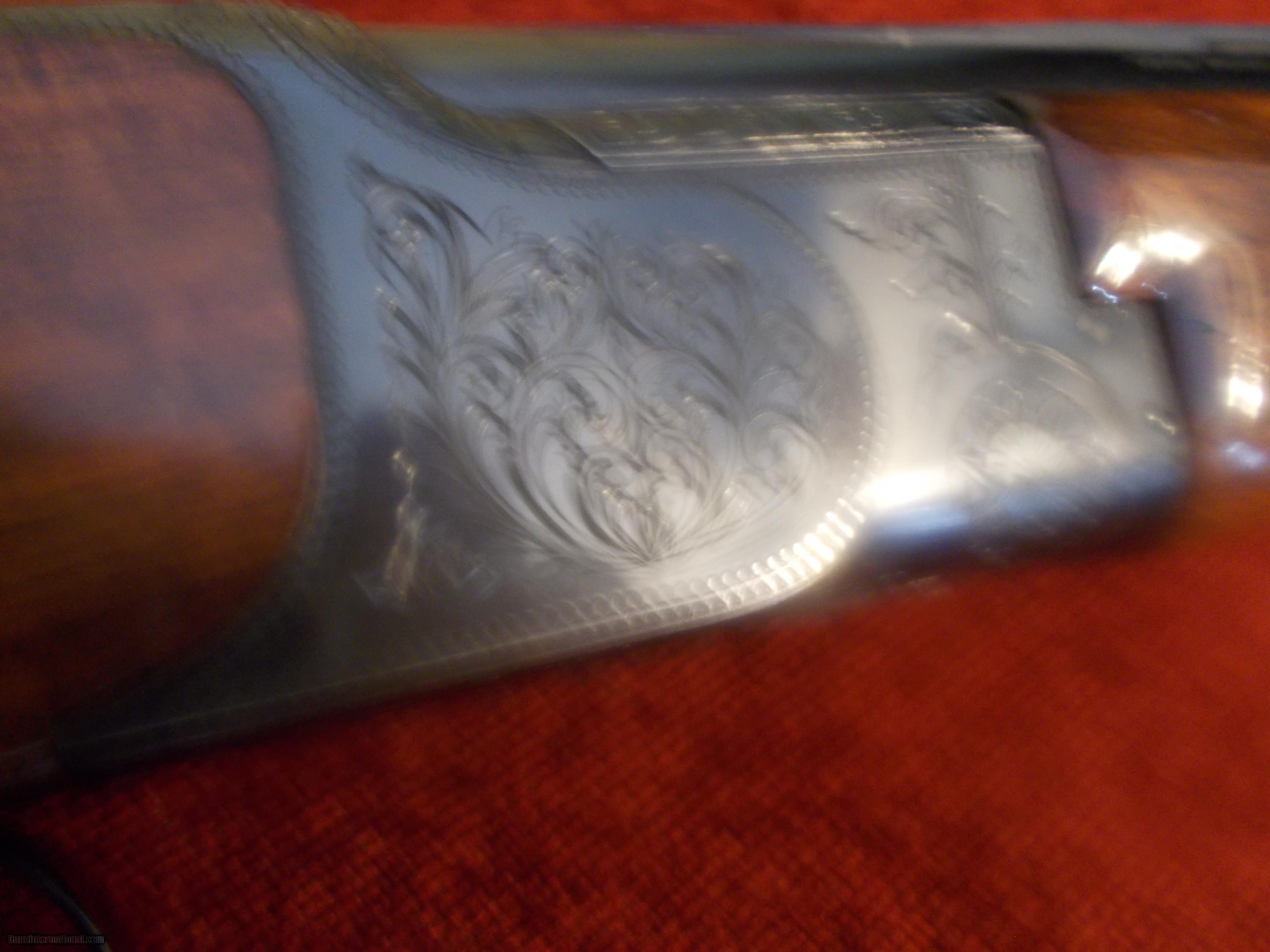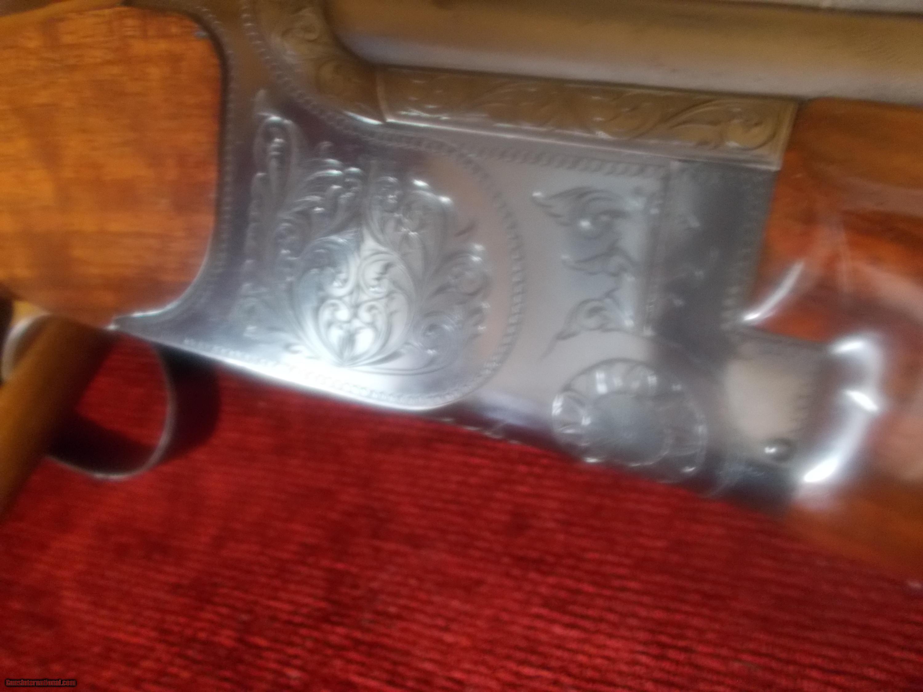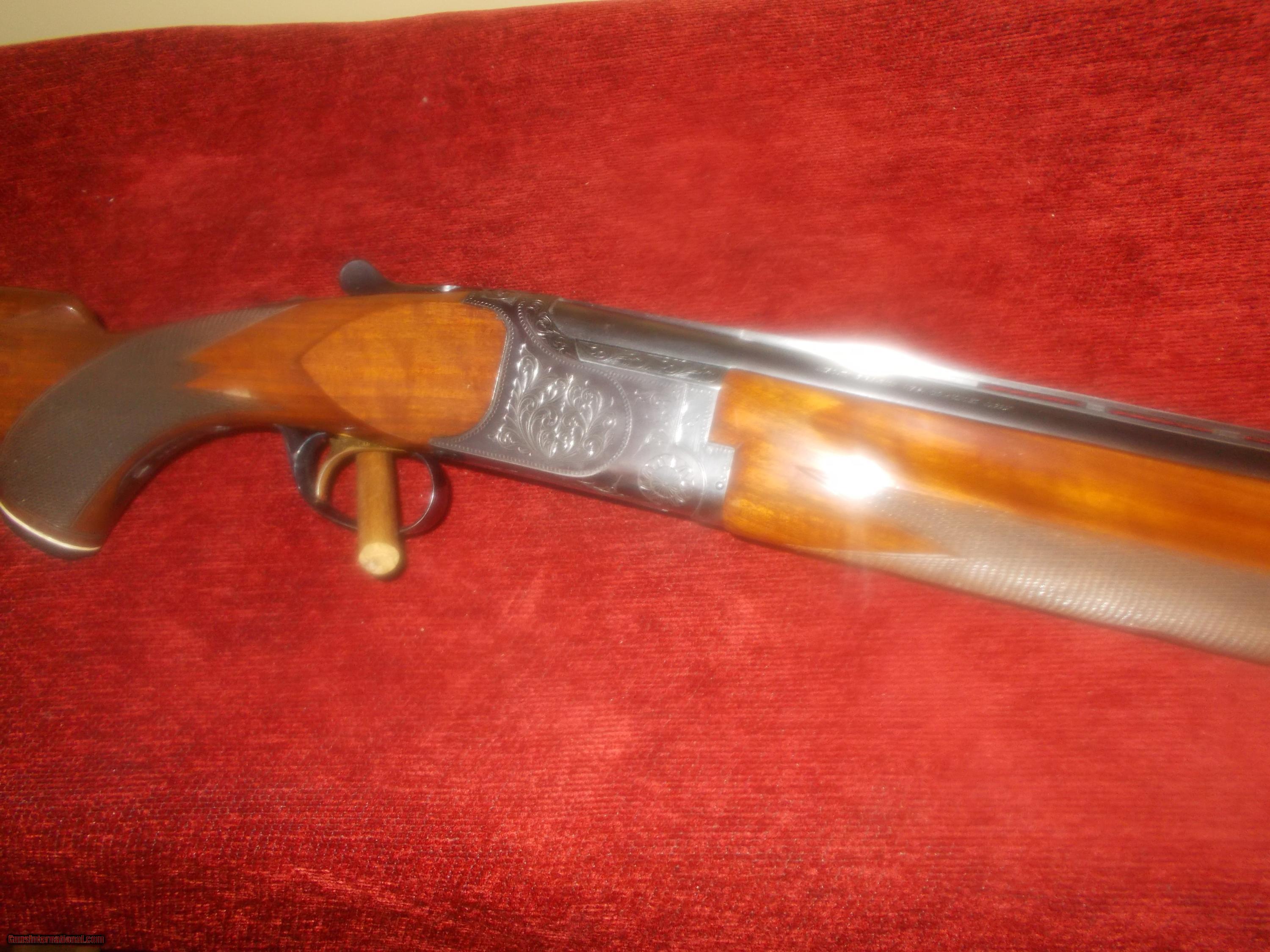 Description: 26" VR, double ivories, choked IC/M, single select trigger, ejectors, engraved receiver ( Comparable in looks & mfg. as Winchester 101), preminum grade checkered orange wine colored walnut PG stock,14" LOP over 1" vent pad, 98% blue, some minor handling only, 6 lbs.: SOLD |
