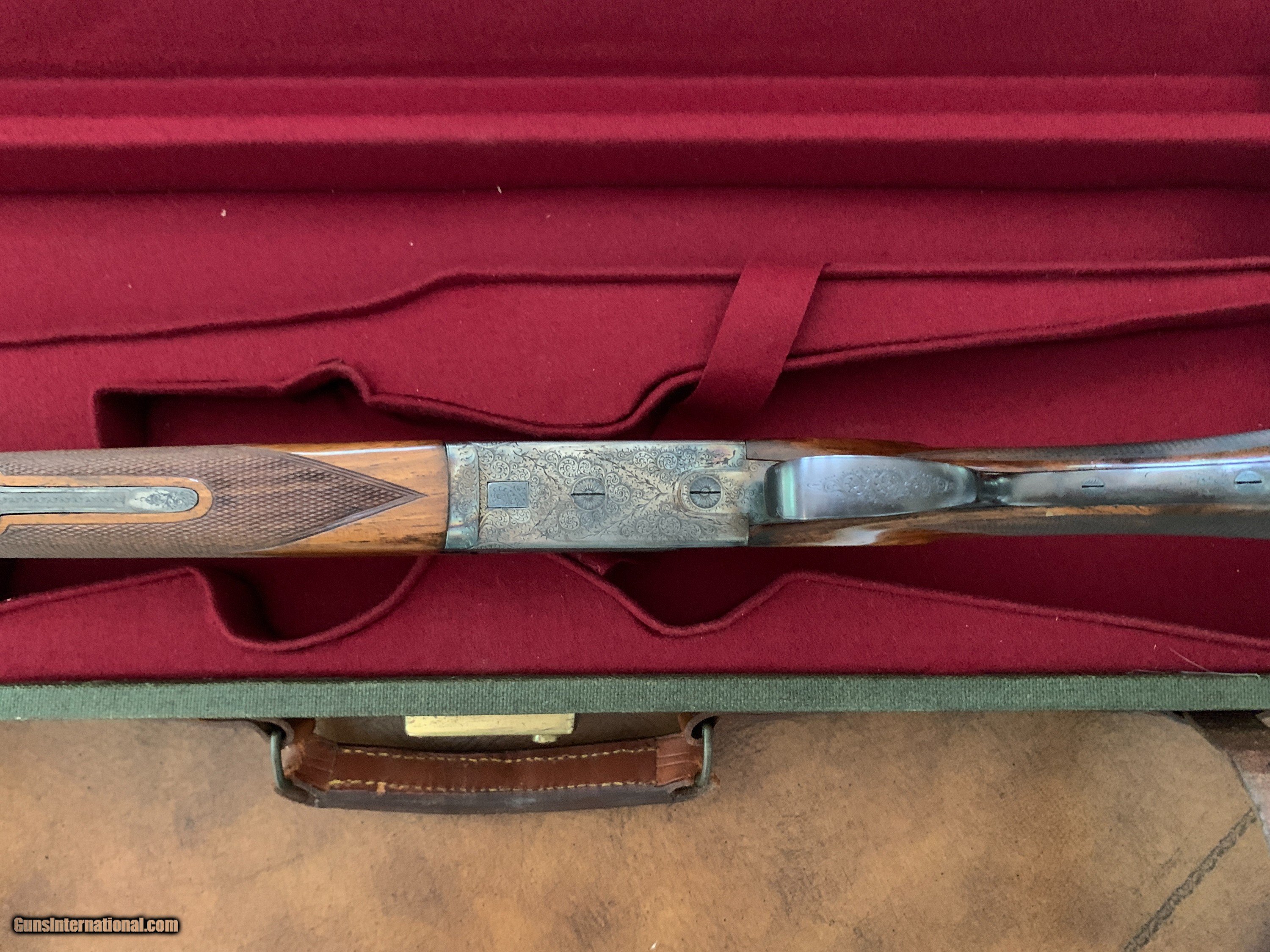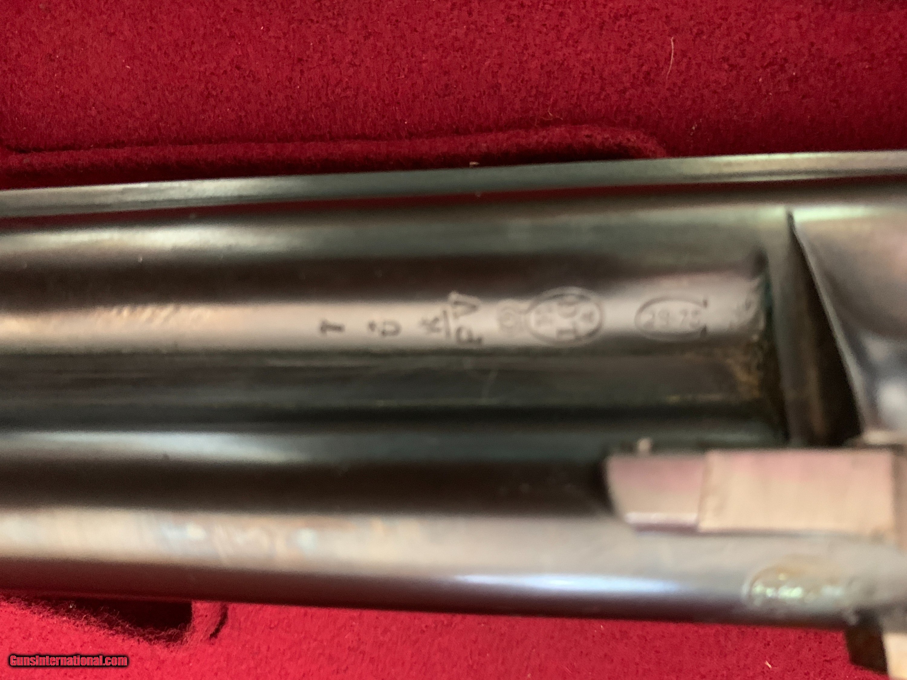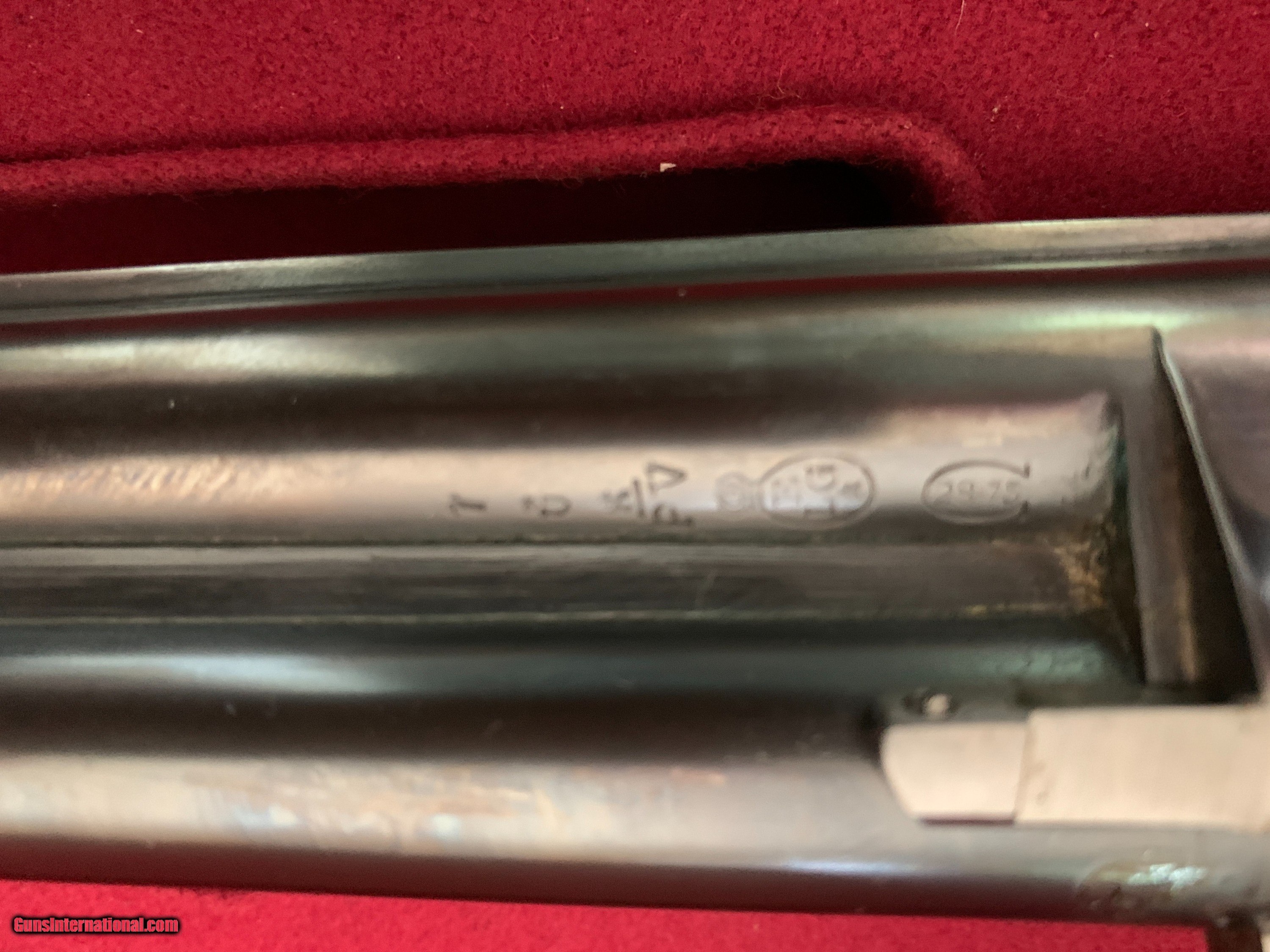 Description: This lovely baby frame 28 bore is a 98%+ condition gun, made in Belgium post-war. It has full coverage engraving, perfectly timed ejectors, and a greener crossbolt. It is a rare, diminiutive aciton type and the gun weighs a mere 5lbs 8ounces making it a perfect gun for grouse and woodcock. It has a single trigger, 26-1/8" barrels, a matte rib, and a front and intermediate bead. Very few of these guns were imported and this one is near new, having been used for a round of five stand by me and perhaps having been previously unused. 100% vibrant case colors. Barrels were made by Jean Falla per his proof mark on the tubes. There is some debate in the collector circles as to whether the guns were built for Daly by Auguste Francotte, Newman, or Masquellier in Belgium. In any regard, its a lovely European Daly smallbore on a tiny frame. 14" LOP through a silvers-type pad. Drop at comb is about 1-5/8" and Drop at Heel is about 2-1/2". My choke gauge doesn't measure 28 bores, but the patterns appeared to indicate Mod/Full chokes on the gun. 3" modern chamber length 28 bore! The gun includes its French fitted mid-century canvas and leather case made in England by Brady. SOLD Curio/Relic: Yes Shotgun Gauge: 28 Gauge Manufacturer: Charles Daly Chambers: 3" Chambers Ejectors: Yes Condition: Excellent Metal Condition: Excellent Wood Condition: Excellent Bore Condition: Excellent Barrels: Belgian Fluid Steel Action: Boxlock w/ Crossbolt Triggers: Single Trigger Stock: Walnut Stock Dimensions: 1-5/8" DAC, 2-1/2" DAH Stock Cast: Off Fore End: Latch Butt Pad: Silvers LOP: 14 Rib: Matte Rib Finish: Blued Weight: 5lbs 8oz Sights: Bead Manufacture Date: Mid Century, circa 1 Engraving: Rose & Scroll Full Coverage Case: Midcentury French Fitted Case by Brady Item Location: Wisconsin Proof:Nitro: Yes |