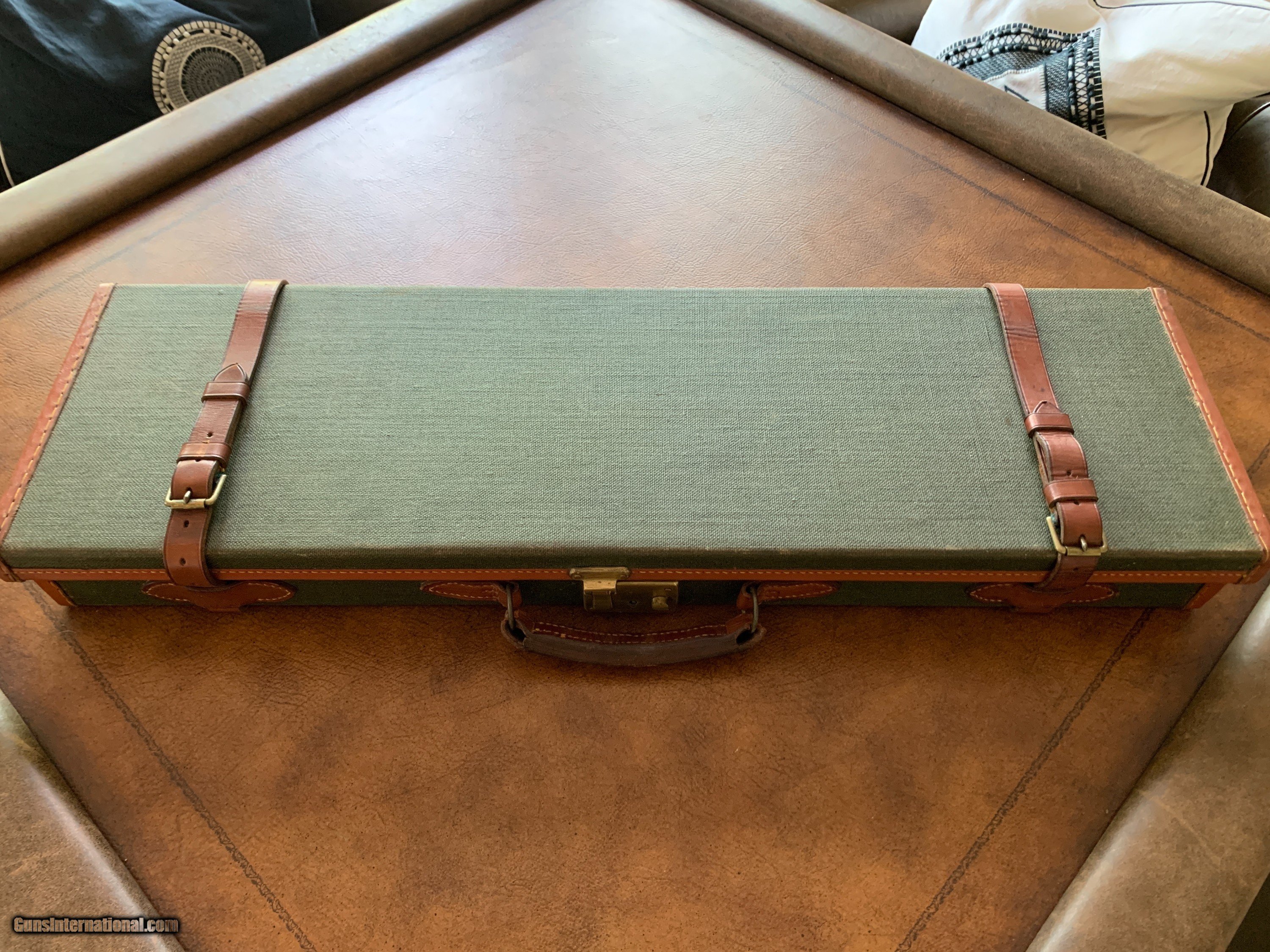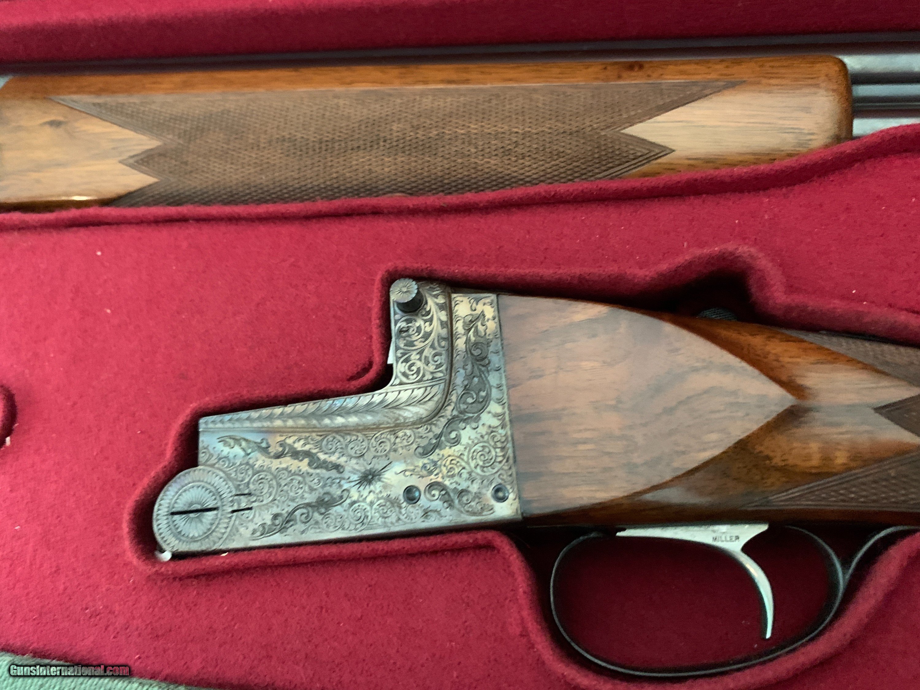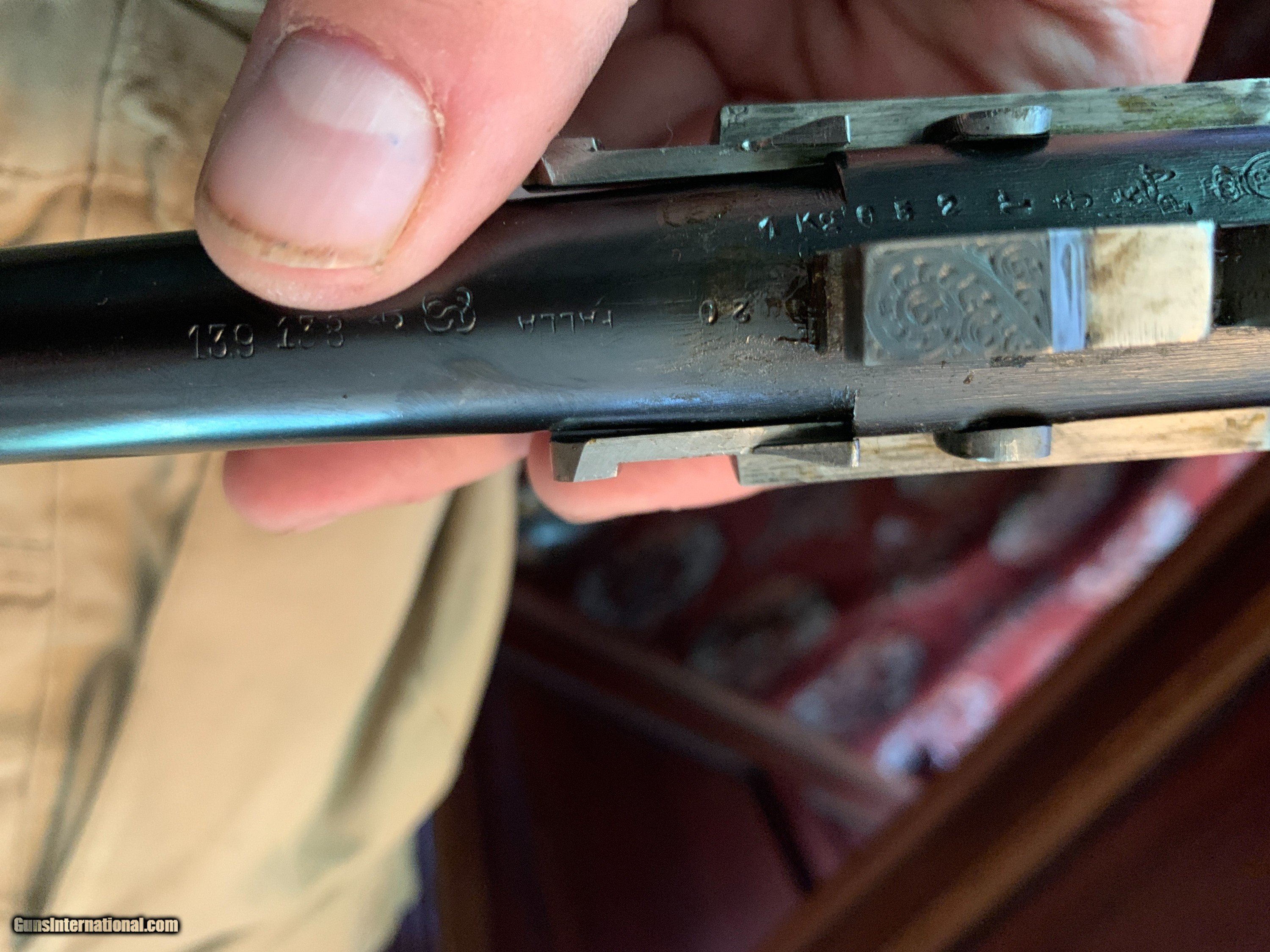Description: This lovely baby frame 28 bore is a 98%+ condition gun, made in Belgium post-war. It has full coverage engraving, perfectly timed ejectors, and a greener crossbolt. It is a rare, diminiutive aciton type and the gun weighs a mere 5lbs 8ounces making it a perfect gun for grouse and woodcock. It has a single trigger, 26-1/8" barrels, a matte rib, and a front and intermediate bead. Very few of these guns were imported and this one is near new, having been used for a round of five stand by me and perhaps having been previously unused. 100% vibrant case colors. Barrels were made by Jean Falla per his proof mark on the tubes. There is some debate in the collector circles as to whether the guns were built for Daly by Auguste Francotte, Newman, or Masquellier in Belgium. In any regard, its a lovely European Daly smallbore on a tiny frame. 14" LOP through a silvers-type pad. Drop at comb is about 1-5/8" and Drop at Heel is about 2-1/2". My choke gauge doesn't measure 28 bores, but the patterns appeared to indicate Mod/Full chokes on the gun. 3" modern chamber length 28 bore! The gun includes its French fitted mid-century canvas and leather case made in England by Brady. SOLD Curio/Relic: Yes Shotgun Gauge: 28 Gauge Manufacturer: Charles Daly Chambers: 3" Chambers Ejectors: Yes Condition: Excellent Metal Condition: Excellent Wood Condition: Excellent Bore Condition: Excellent Barrels: Belgian Fluid Steel Action: Boxlock w/ Crossbolt Triggers: Single Trigger Stock: Walnut Stock Dimensions: 1-5/8" DAC, 2-1/2" DAH Stock Cast: Off Fore End: Latch Butt Pad: Silvers LOP: 14 Rib: Matte Rib Finish: Blued Weight: 5lbs 8oz Sights: Bead Manufacture Date: Mid Century, circa 1 Engraving: Rose & Scroll Full Coverage Case: Midcentury French Fitted Case by Brady Item Location: Wisconsin Proof:Nitro: Yes |