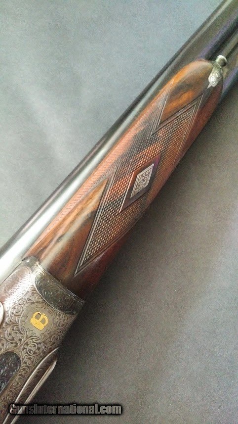 Description: Rare 2" sidelock featuring the classic 25" chopperlump barrels with Churchill file cut rib marked 2" case XXV in gold. Double triggers, automatic ejectors, the action is engraved in a bold acanthus scroll and retains 90% case colors. Gold crown inlaid at the bottom of the action. Splinter forend, straight hand stock of beautiful black figured French walnut measures 14-1/2" to a checkered butt. Fabulous example of a rare 2" gun. SOLD |