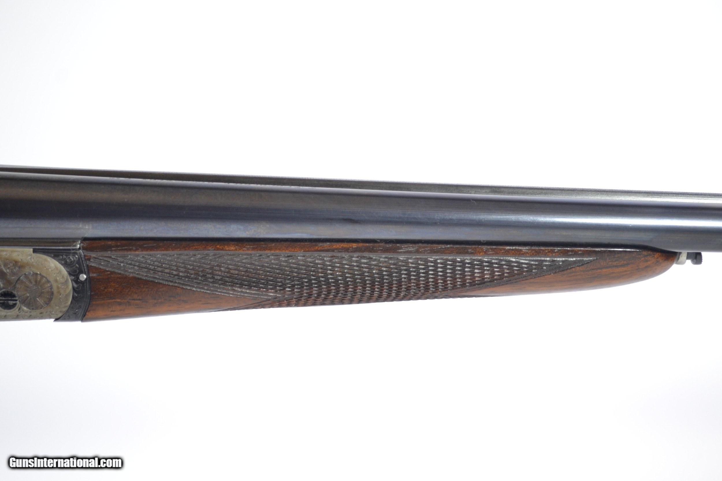 Description: Churchill - XXV, .410, 25” barrels, choked IC/MOD, double triggers, AE, Straight grip, checkered butt, small splinter forend, Churchill style rib with the most unbelievable highly figured piece of French Walnut. 90% case hardening, barrel blue, wood finish. Sharp, crisp, beautiful Engraving. Just a beautiful small high quality Churchill. Outstanding in every way. Inv# 35591 15 1/8” x 1 3/8” x 1 ¾” $14,999 SOLD |
